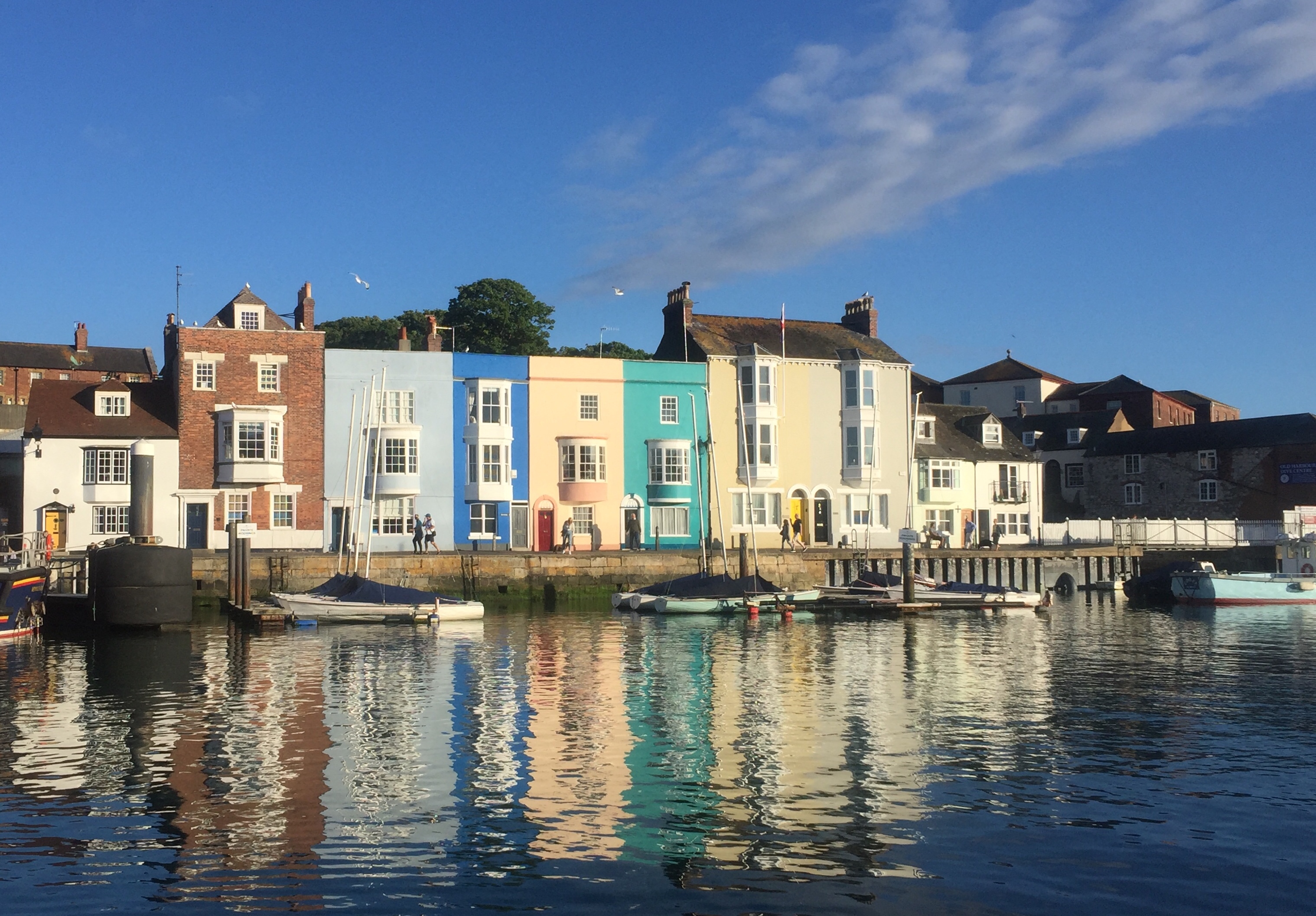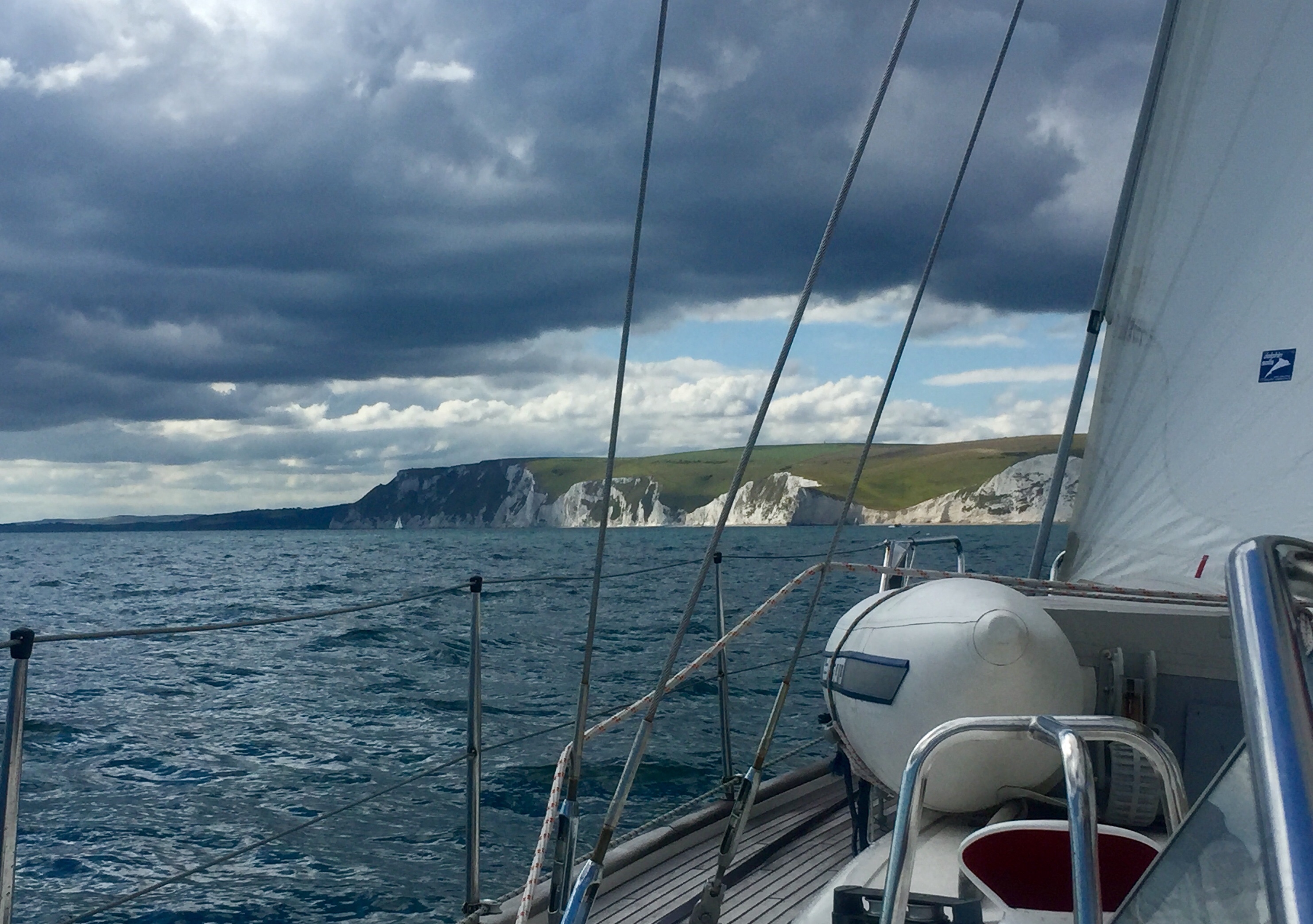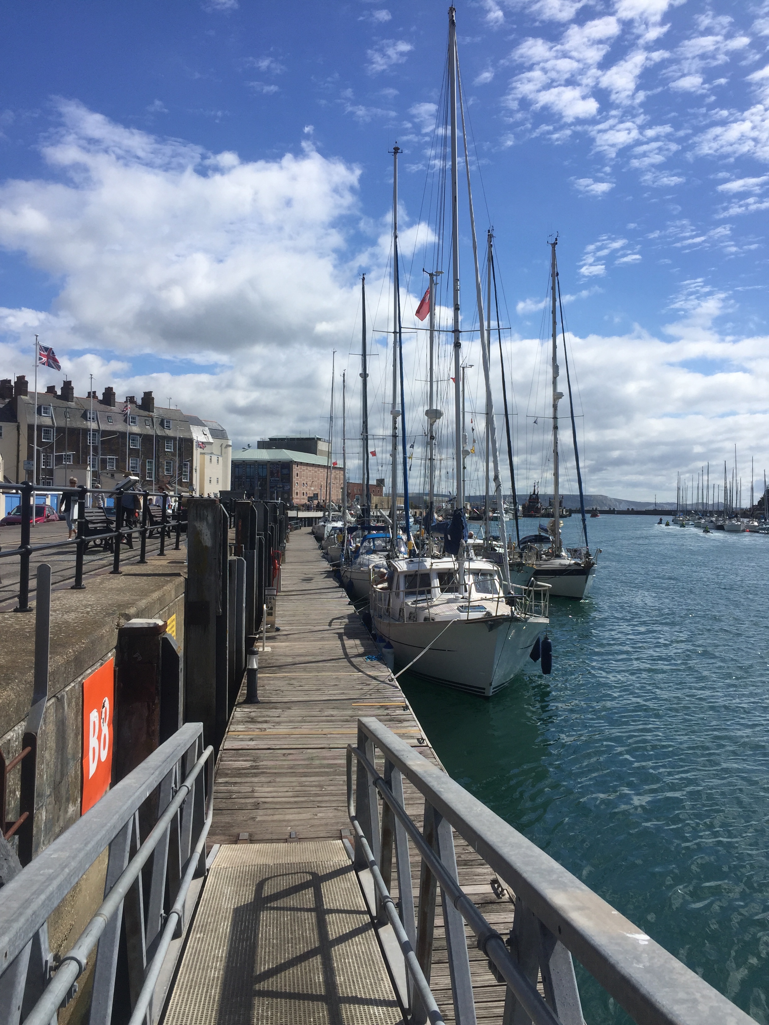 Sunday. A busy day in Poole harbour. Boats going all over the place. We left about 1130 after having bought a Sunday paper, filled up with water, made the cheese and ham rolls ….etc. The wind was thankfully light for once, weather warm and sunny. We sailed out of the harbour with full main. The wind is Southwesterly so perfect for the beginning of our journey. We’d enjoyed Poole but were quite glad to get back in the open sea without having boats everywhere to dodge. As we left the harbour and headed towards Handfast point, we noticed loads of boats in Studland bay. Presumably mostly local boats… just ignoring the prohibition??? We passed by Old harry and his wife, and on past Swanage up to Anvil point and then St Albans head which you have to give a wide berth. That’s because there’s a shallow ledge which runs out from it, under the sea, creating overfalls ( breaking waves) because of tidal flows. It actually seemed relatively quiet today and caused us no problems. Although the wind was on the nose, and the tide with us, the water stayed pretty flat and we made good progress. It was in fact an amazing days sailing.. maybe the best yet! We passed close to the Jurassic coast and the beautiful white cliffs reflecting in the late afternoon sunshine. Passed Worbarrow bay, Lulworth cove and Durdle door. The whole coastline looks like the edge of a vaguely folded pile of washing . Some bits of it just obviously crumbling into the water… revealing hidden treasures behind? Eventually we arrived near Weymouth and took down the sails. We radioed as instructed along with quite a few other boats waiting outside and were told to go to B5 where we would be second boat out from Firebird of Arne. We entered the harbour, thankfully sheltered in this wind direction ( never forget Whitby😱) , and spotted Said neighbour. Julian turned the boat round so were were into the bit of tide, and we drew alongside. Weymouth is gorgeous! By now you know we love a river harbour! Beautifully peaceful, protected water surrounded by glorious, colourful, well maintained, old buildings. I used to hate rafting up but it’s actually rather nice. You get to meet interesting people who always ask “ where have you come from “ ? and seem genuinely interesting when we tell them. You also pick up lots of tips and local knowledge which is invaluable. It was 1830 by the time we were there, so not a lot of time to explore but it was just lovely sitting watching the world go by.