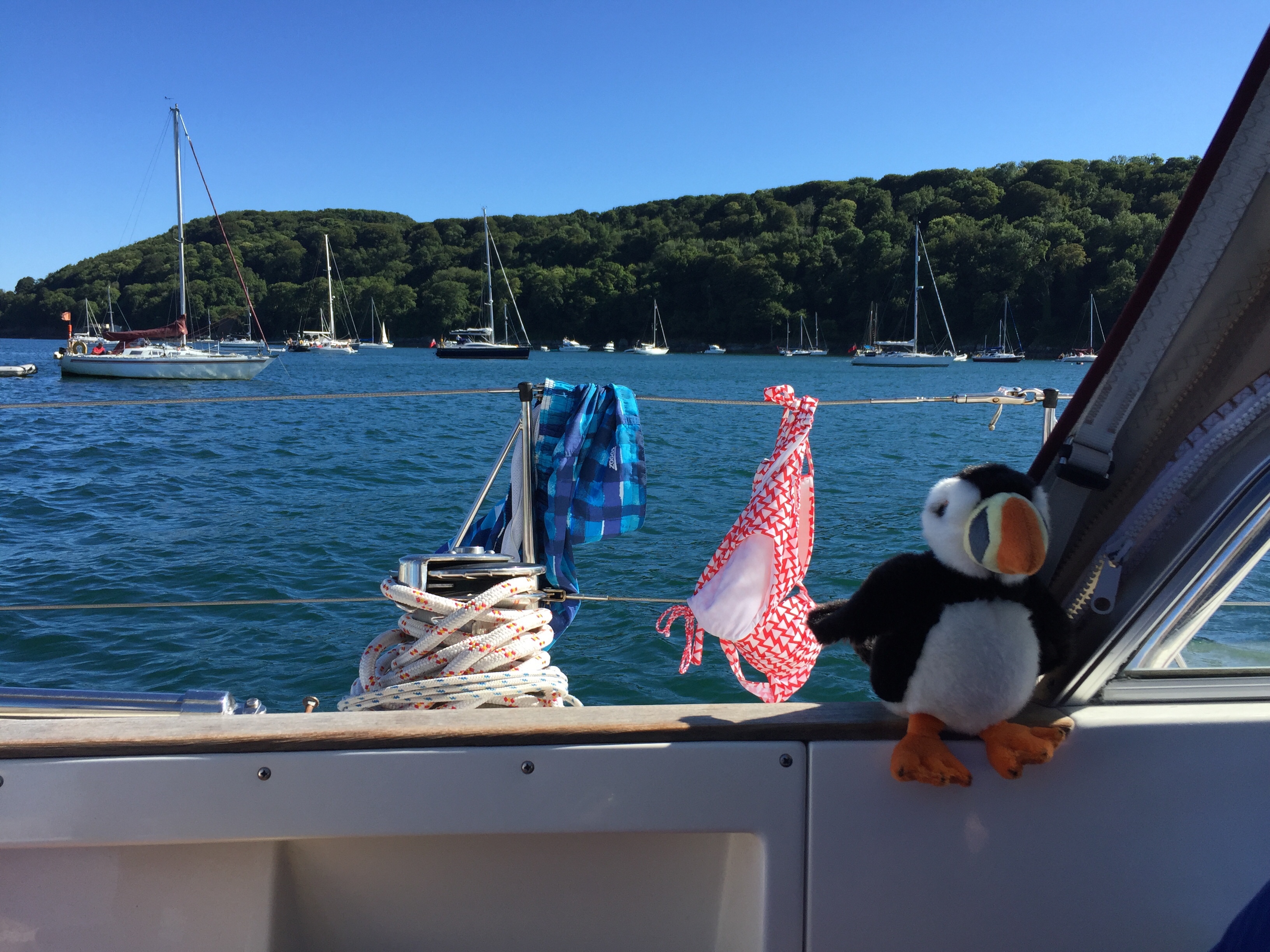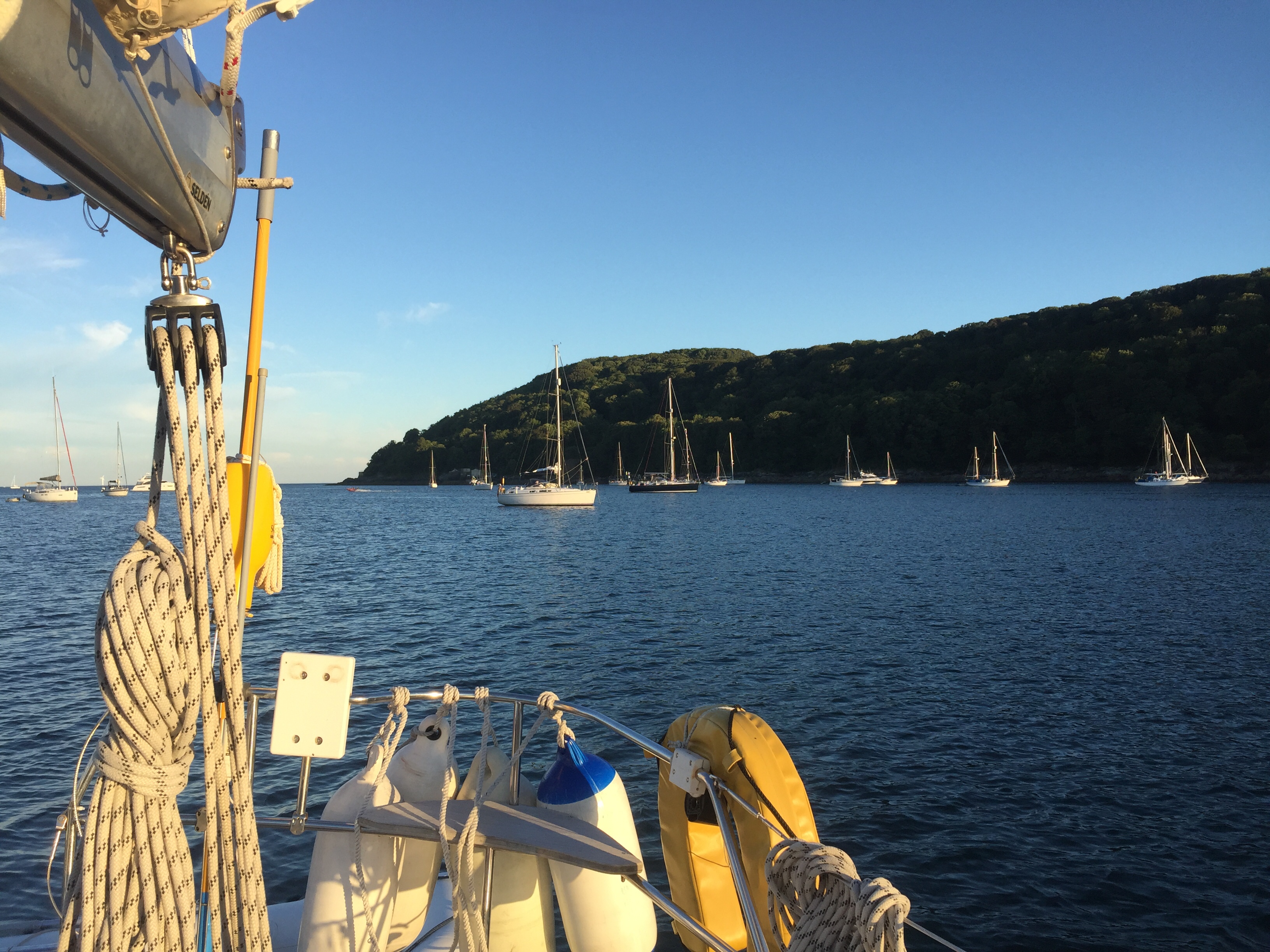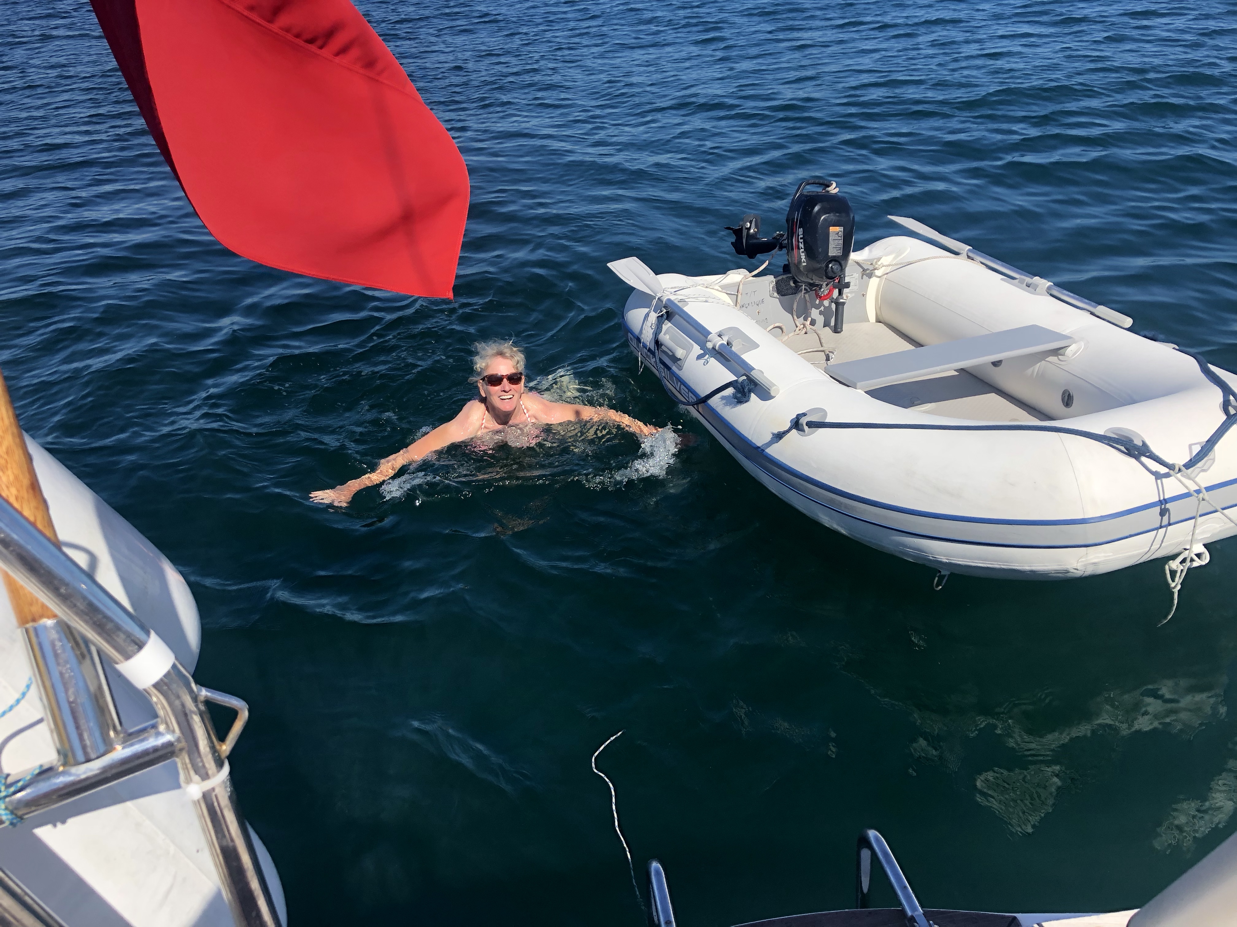 Woke up to bright sunshine. Julian got up quite early to go ashore in the dinghy before the crowds were about. The scene was lovely, early morning sun shining on the pretty village houses with the distinctive clock tower in the middle. It really is a beautiful spot. The wind was still offshore do Julian rowed back rather than using the motor. We then enjoyed a peaceful day in the sunshine doing nothing much. Julian read his newspaper cover to cover, I did a bit of sunbathing on the foredeck. And we ( even me) went swimming off the boat as it was really really hot! I watched the Ladies finals using iplayer and the hotspot as the tv wouldn’t work here. We watched the world go by.. boats toing and froing. People enjoying themselves. It was SO crowded on the beaches though, we definitely made the right choice to stay on the boat. 😎