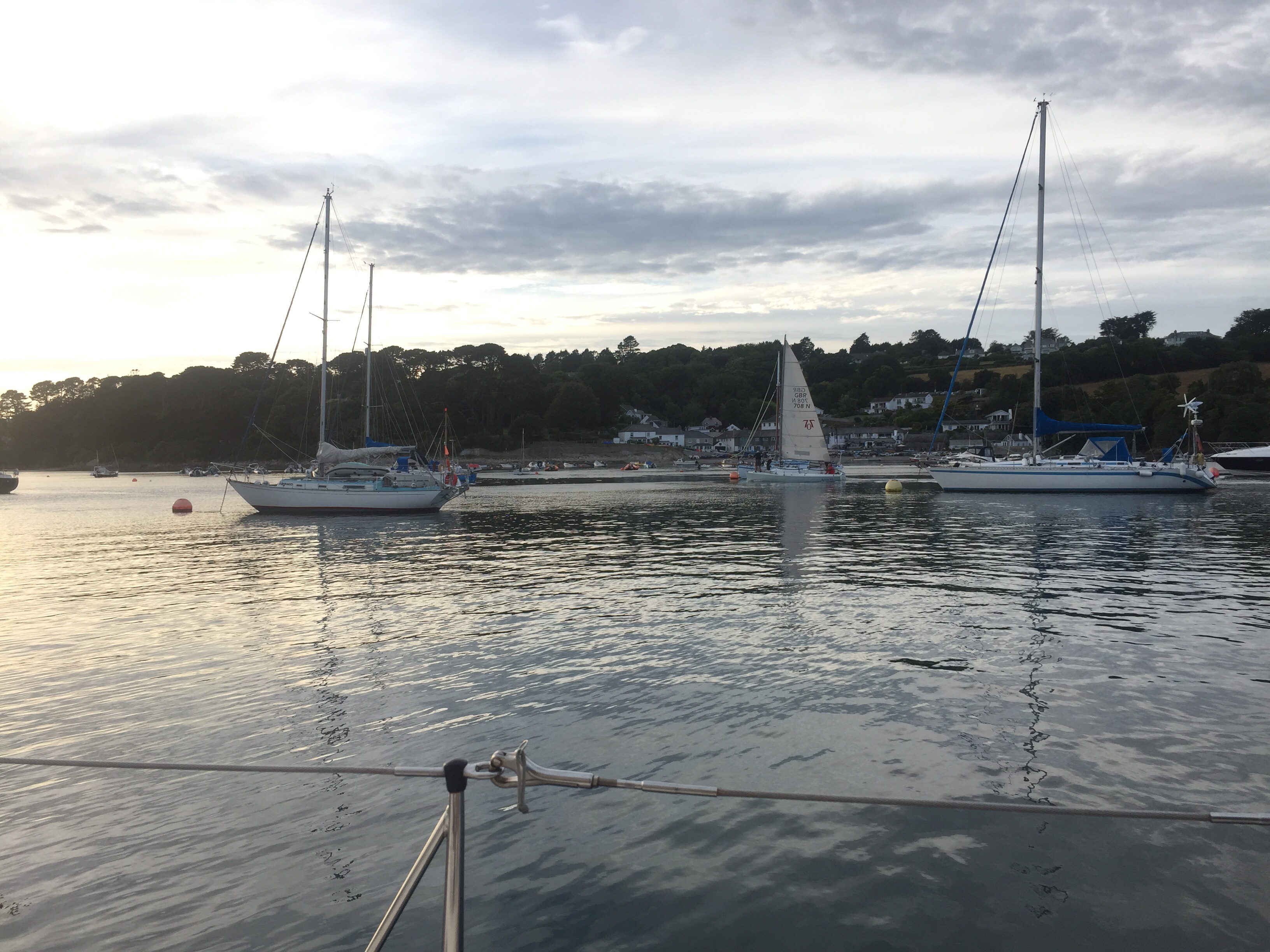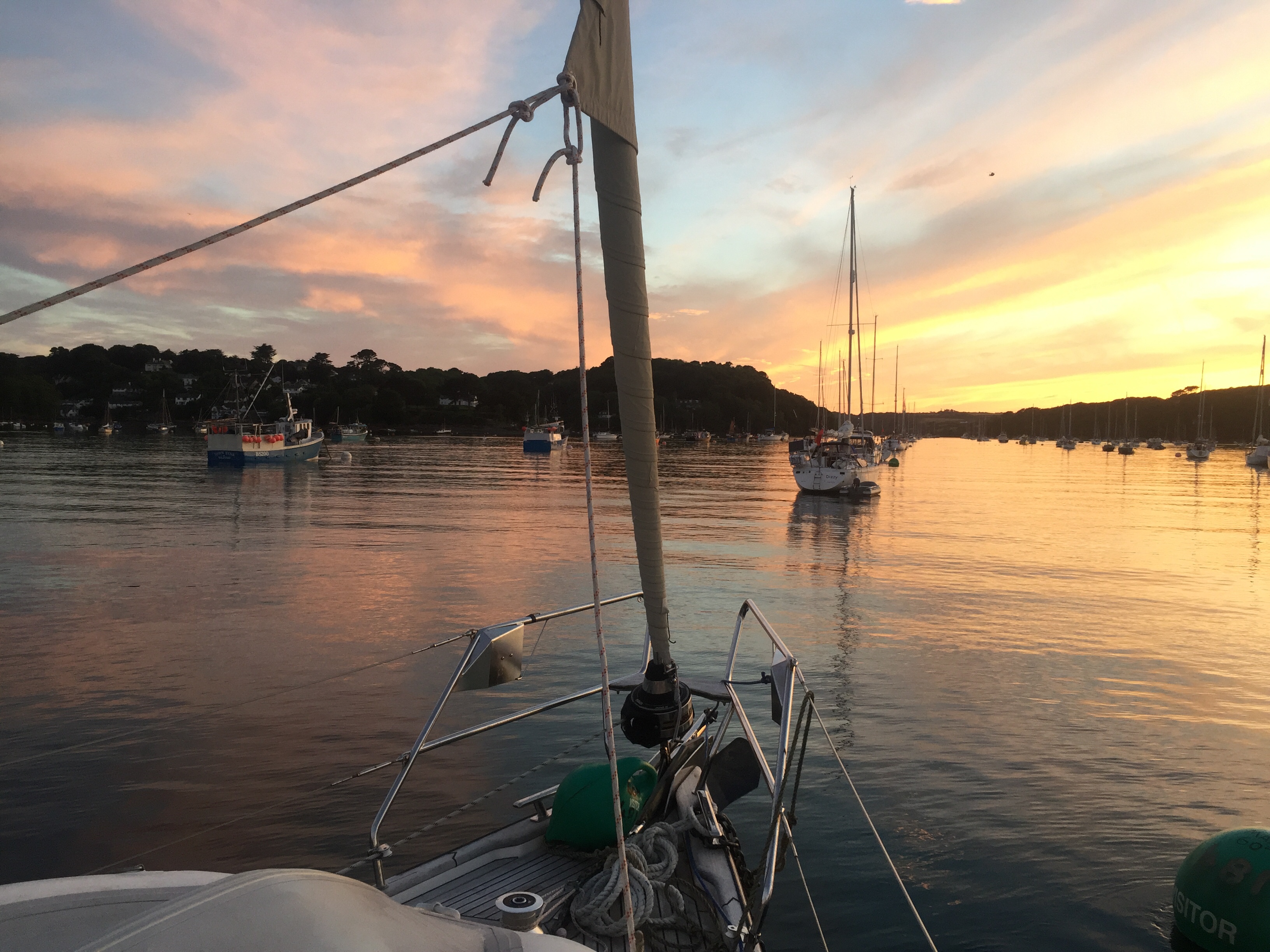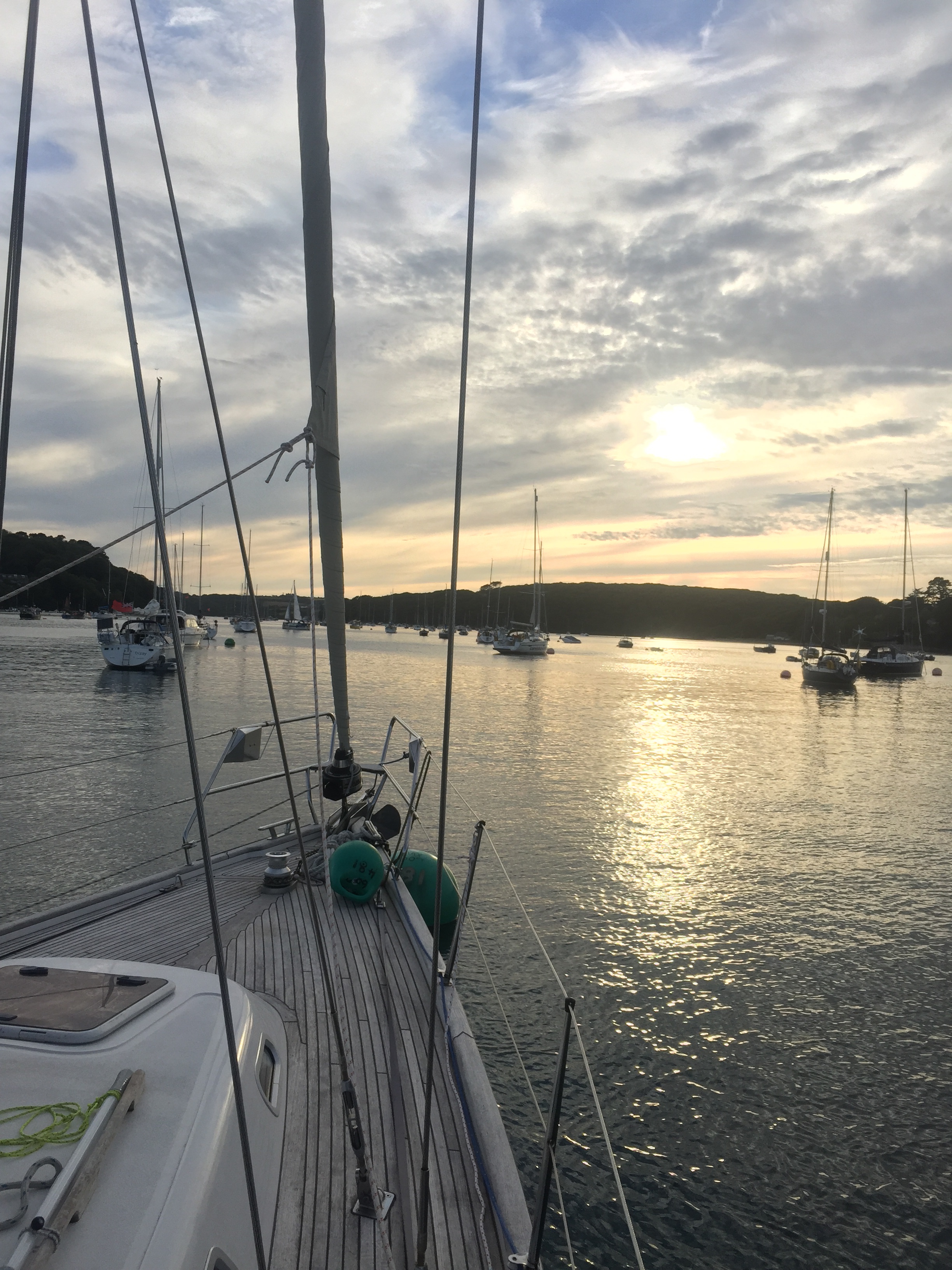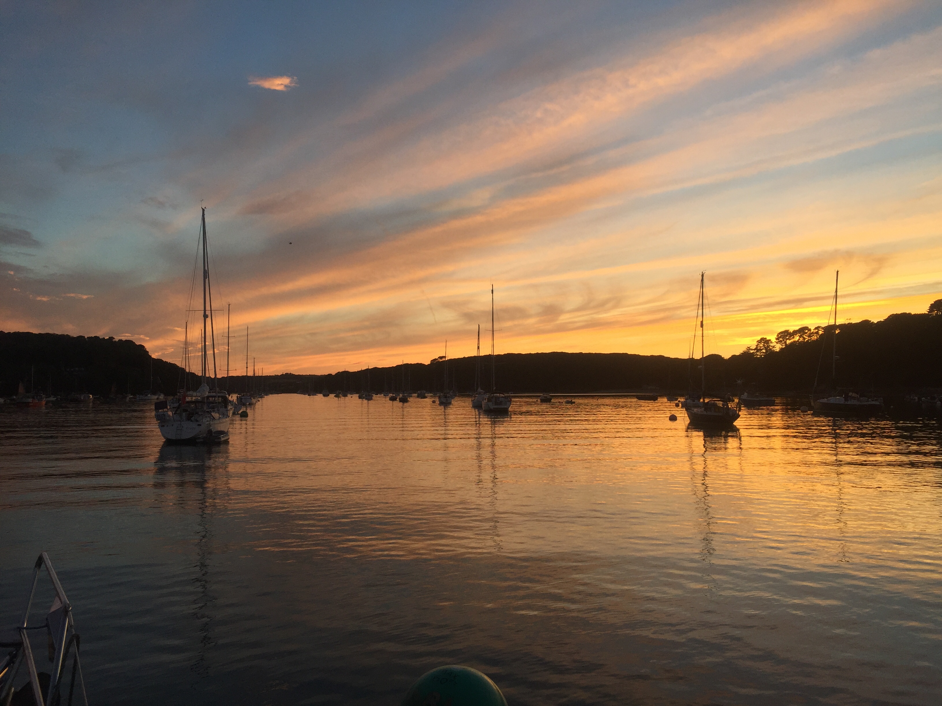 It may seem we are reluctant to leave this beautiful area! We got in the dinghy and went to the coop early to get oranges and lettuce! We were rewarded that the shelves had indeed been restocked overnight. Then to the post office to post a card, buy stamps and birthday cards. The street was already bustling and it was only 0830. The little ferries getting ready to zoom people about. All busy busy. We filled some of our water cans from the tap near the stone steps leading down to the pontoon, and since we’d been less than 20 minutes we didn’t have to pay another £5.00! Quite glad to get back in the boat away from the hectic holiday life, we noticed that the hallberg that we had worried was over our anchor, had gone! I hope we didn’t make them leave 🤭. We upped the anchor and headed for the Helford river just across the estuary on the west side. It’s another lovely place and we’d arranged to meet my cousin who live nearby, for a meal at the famous Ferry boat inn. We just drifted gently over in 10 knots of wind, under headsail, and arrived around one ish. Very pleasant. Debating whether to anchor or pick up a mooring, we opted for the latter, just as it’s easy to get ashore. We picked up the small green trot buoy and hoiked up the hugely heavy chain attaching it to the big green ball with “ visitors “ on it and 60 ft. They are obviously used to big boats here! We had a lazy afternoon during which the wind started blowing again. A relief as it was very hot. Showers on board before going over to the pub for our meal with Richard and Sara. It was so lovely to see them both and great to catch up. Just forgot to get a photo! 🙁. An evening watching sunsets from the cockpit .