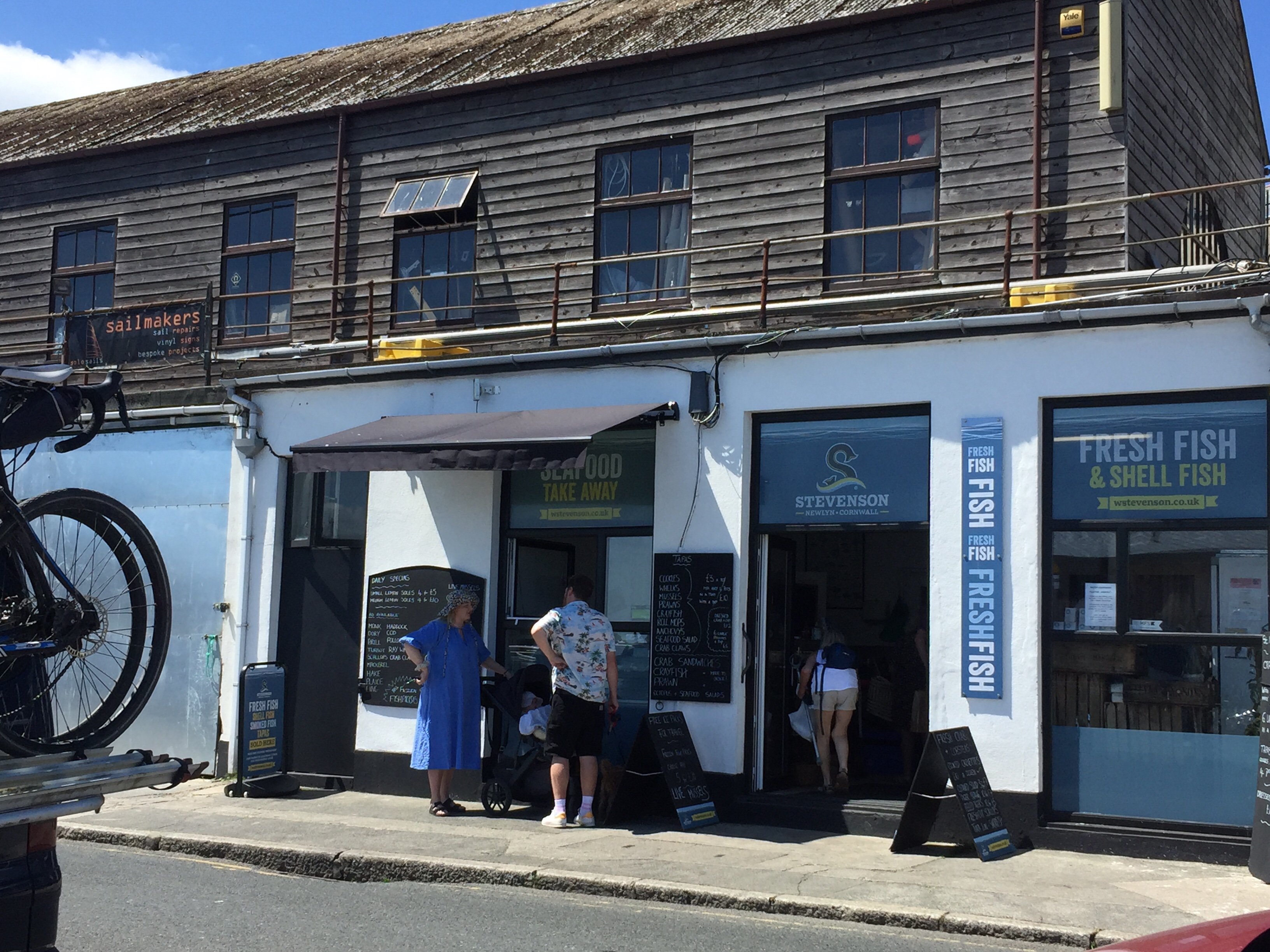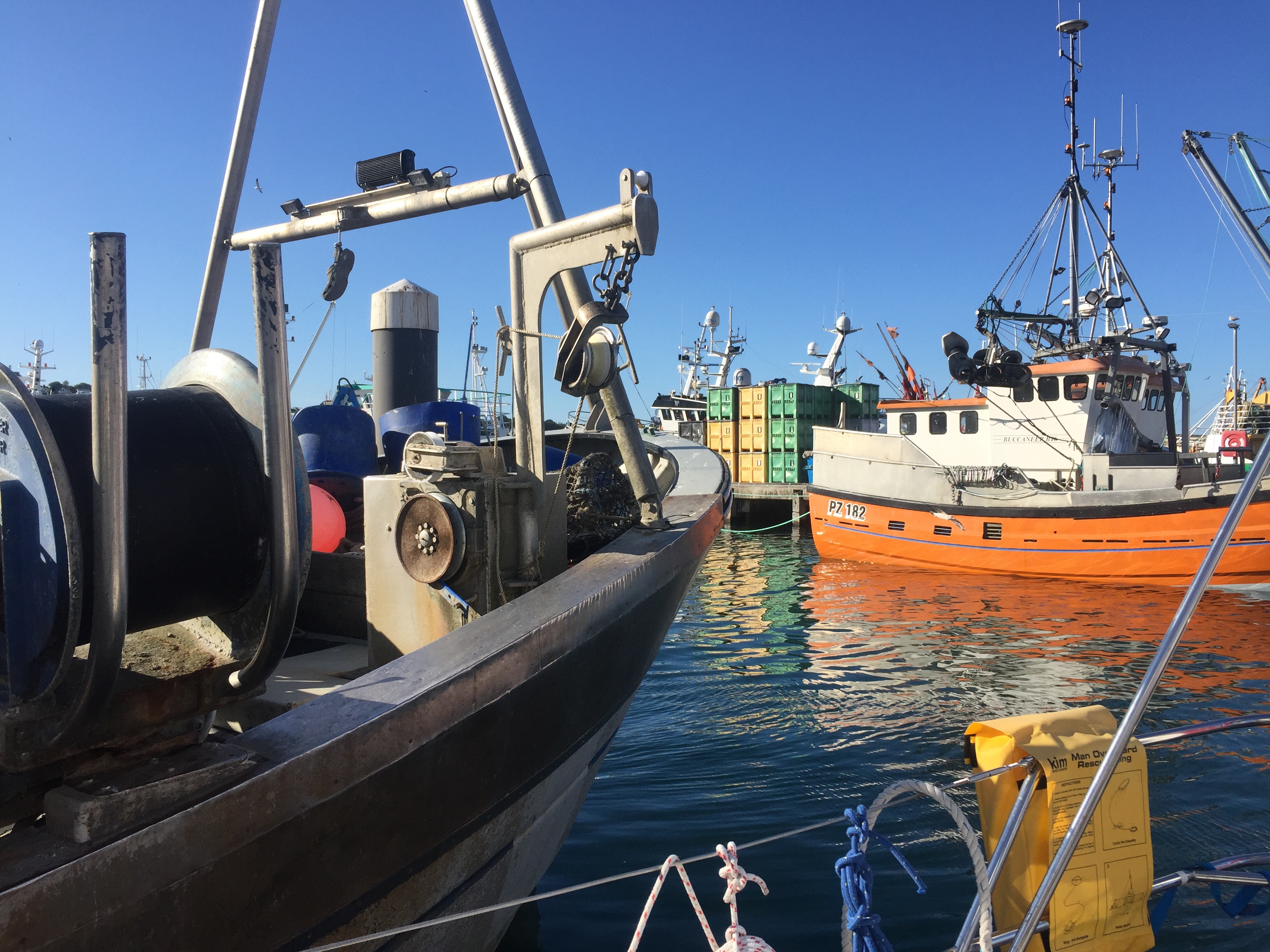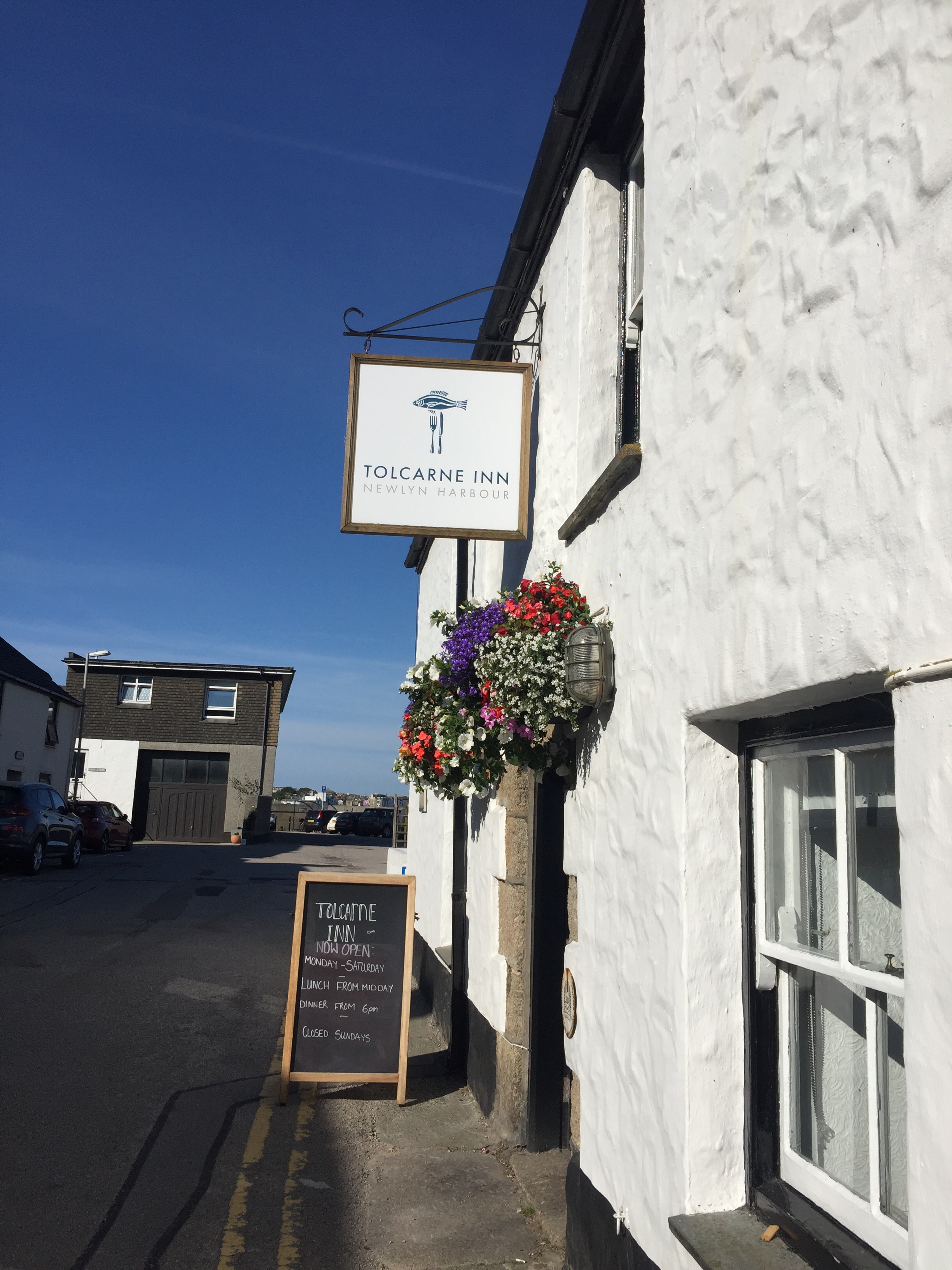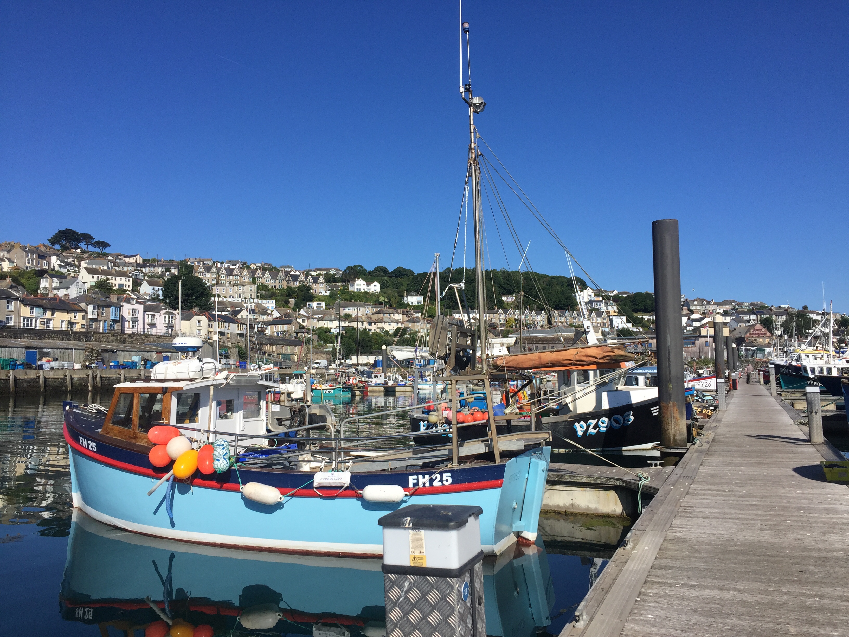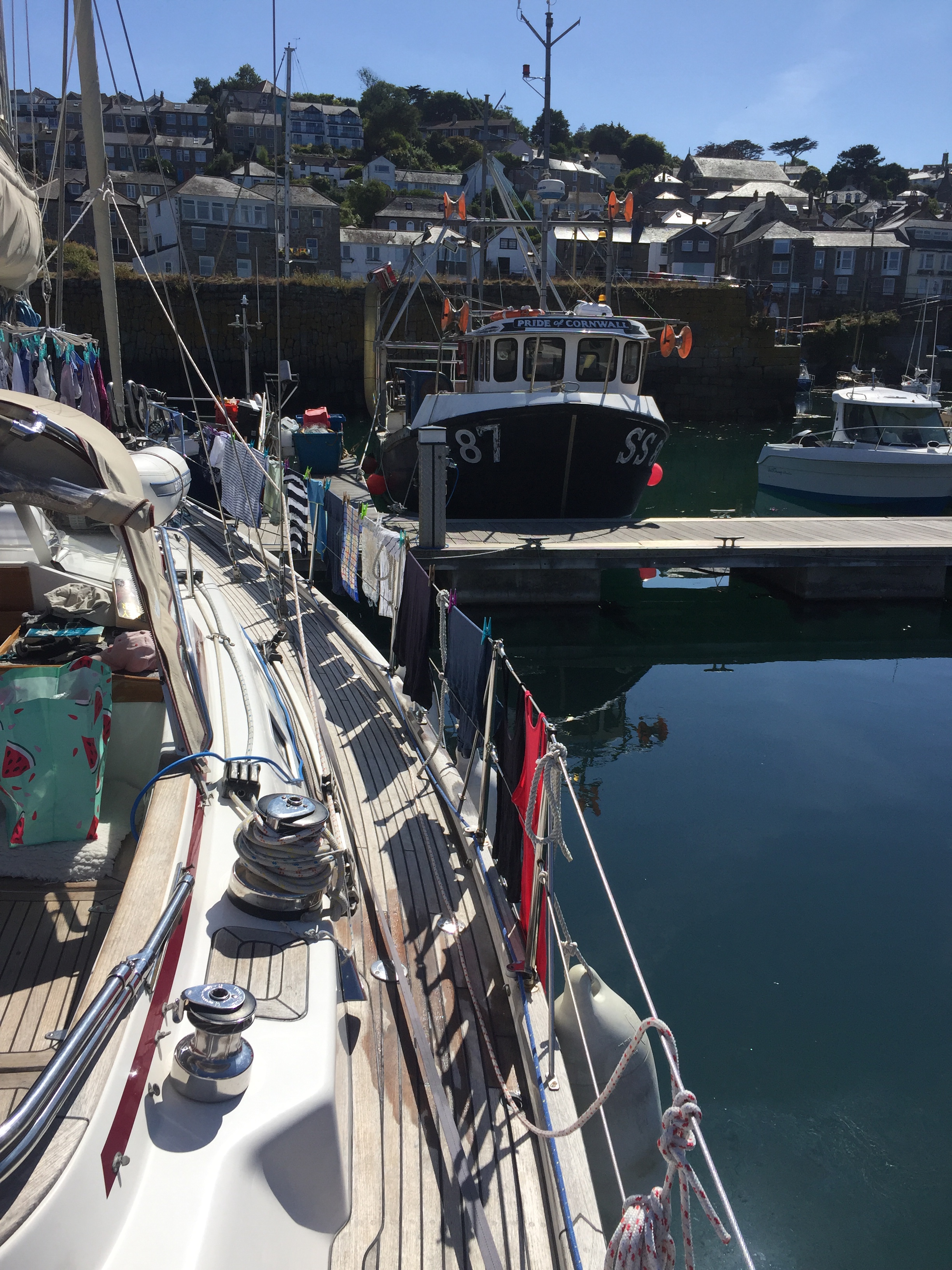 So having been told that the fishing boat was going out at 0500, we had attached ourselves to our other neighbour who was going at 0600. Of course when we got up at 0530, “ Girl Pamela “ was well and truly still present! Released ourselves from Mr “ going at 6” and reattached the lines to “ Pamela “ . Once he had gone, we then unattached ourselves from Pamela and sorted our lines out so that we could moor properly to the pontoon. Hurrah 😀! I then went back to bed! It’s going to be a hot day here. We decided to do our shopping early so as to be able to avoid the hottest part of the day. We knew the Lidl here was along towards Penzance and actually had been before in 2019. Amazing what the weather can do to our memories. I remember a bleak winswept rainy place. Today quite the opposite… Newlyn is lovely! Not touristy. Quaint and yet real. The walk along the front to Lidl was delightful. A breeze blew off the sea which was glittering in the sunshine. Not a cloud in the sky. It was low water and people and dogs were enjoying the sandy beach, rock pools and swimming. We decided our treat this pm would be a swim followed by a beer at the Tolcarne inn which we had spotted on our way to Lidl. Once the shopping was done, I left J to put it away whilst I went in search of some fish for supper. Since Newlyn has a huge fish market on the quay, A fish monger shouldn’t be hard to find. In fact it was just across the car park from the RNLI visitors centre to the Penlee life boat. Such an array of fish ! I bought something filleted for supper and also 3 oysters for J , since he’d missed out on the Pyefleet creek ones. I had to buy a special knife too…to open them with. 😳. The next couple of hours was spent doing laundry. There wasn’t any washing machine so I had buckets and hose on the pontoon, and although time consuming was effective! Once that was done and all hanging up we went to the beach and had a swim in the sea. It was warm! Laid in the sun a while before wending our way back via the Tolcarne inn. 🍻 J watched a YouTube video on how to open his oysters. On our return we bought a lemon and tobasco sauce 😬. All went well with the preparation, and our fish supper was yummy 😋 .