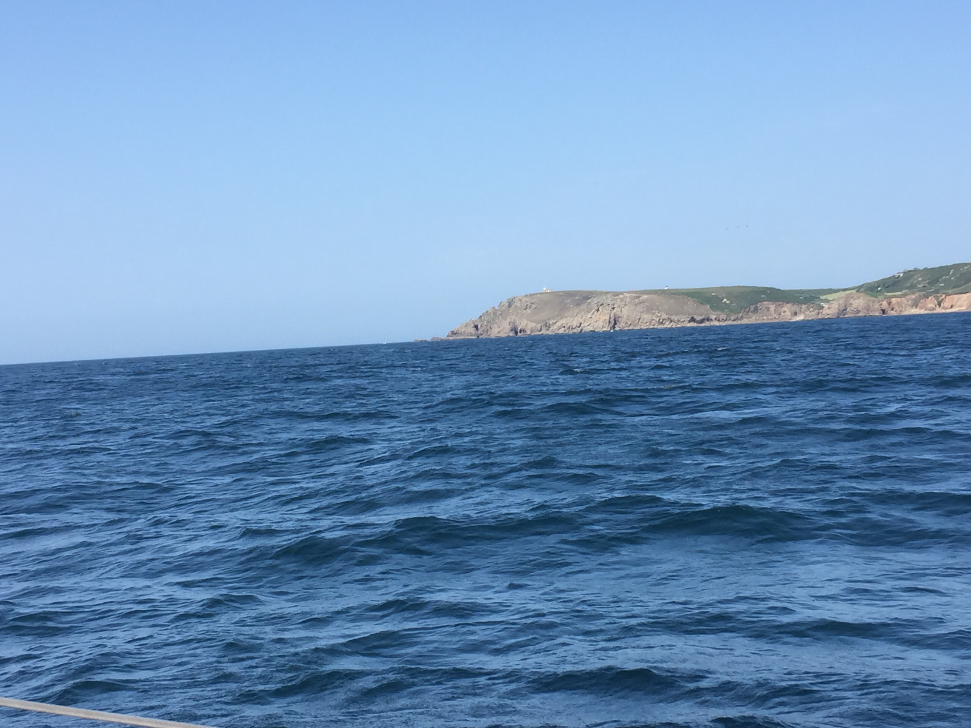J got up early to go to the coop for a paper, some croissants and some Cornish pasties for our lunch on passage. I went down the pontoon to say bye to Charlie and Don who we’d met yesterday… they happen to be the next door neighbors of our great friends Debbie and Bruce from Hythe. 🤗 They are also going to Scilly today. We set off in the sunshine with a SE wind towards Lands End . We left at 1000 in order to be at the Runnel Stone with the tide taking us round And west . We passed Mouse hole ( Mowzull) and the infamous old Penlee lifeboat station on the way. We had 15 to 20 knots all the way which made it a quick passage, with a following sea once going west.
