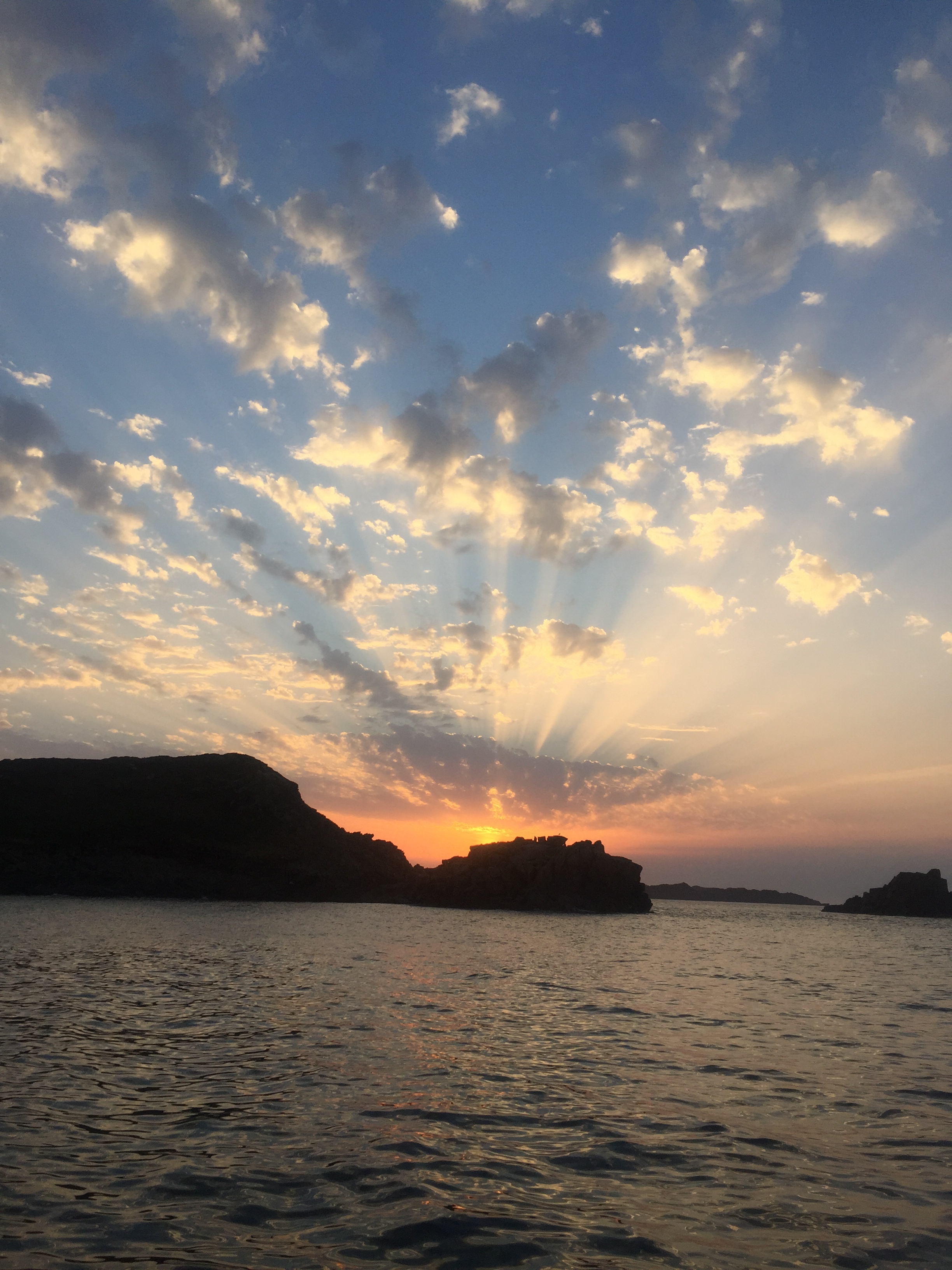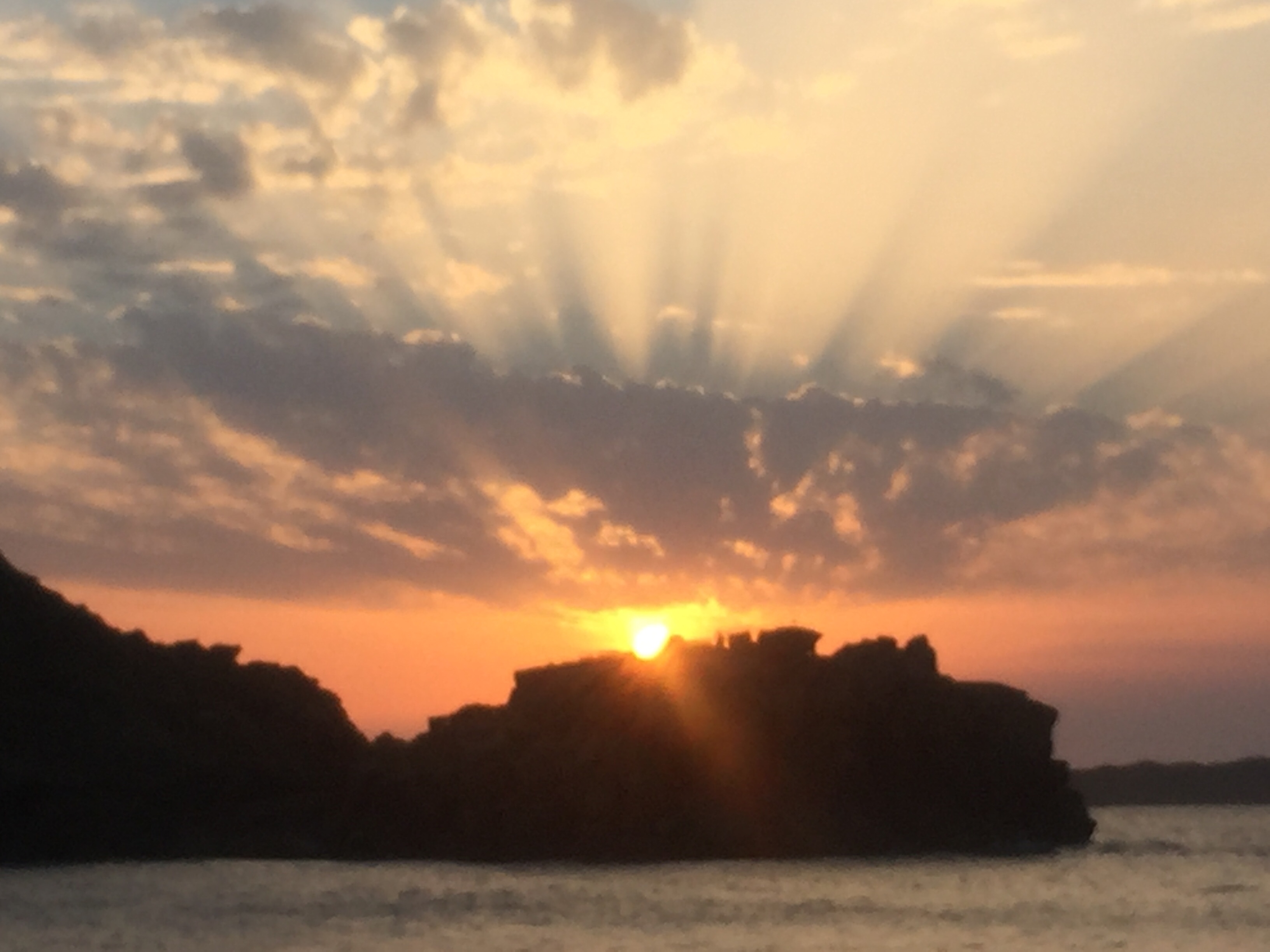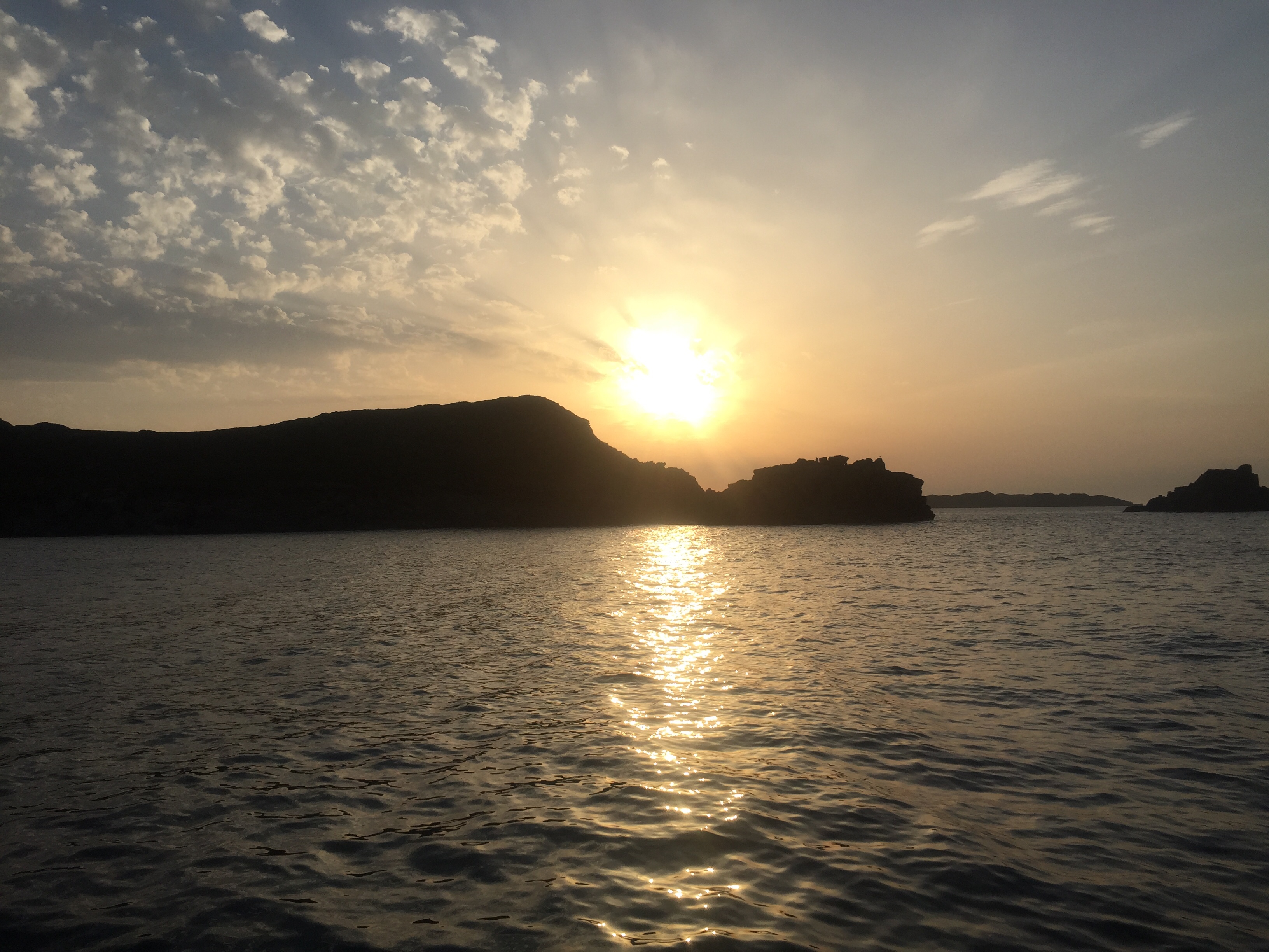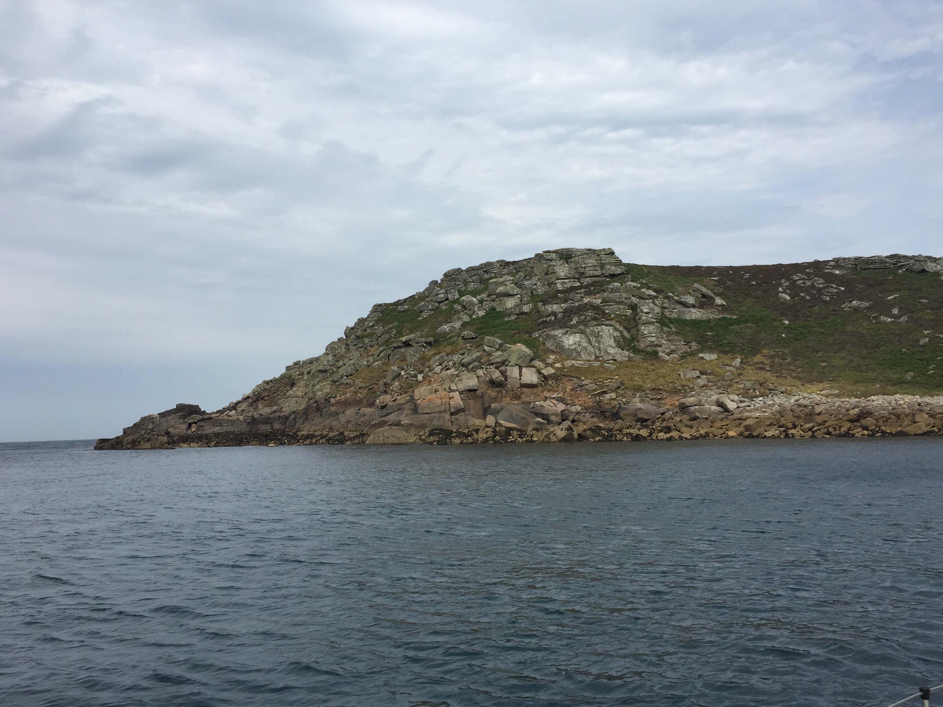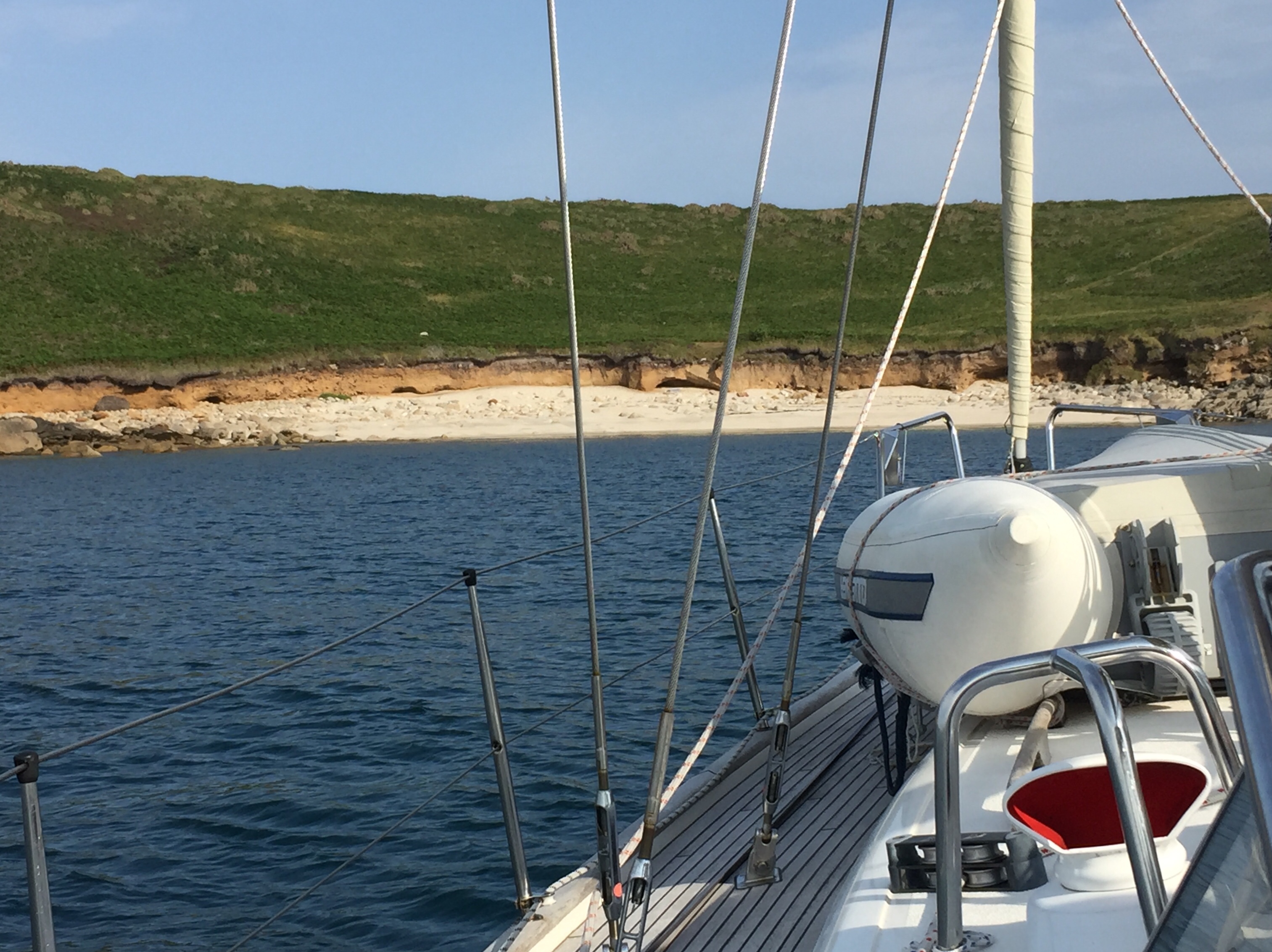 Quite big waves and you could tell we were off shore again. But the sun shone although there was a haziness about it, and soon we could make out Scilly in the distance. We listened to radio 5 live and the 150 th open golf championship from “ the old course at St Andrews “ where Rory McIlroy appeared to be doing well. We gybed a couple of times and eventually took the sails down before heading into our chosen anchorage on the North coast of St Martins island. Named “Bread and cheese cove” ! Supposed to be a delightful anchorage and usually deserted. Well it was! It was on the other side of a headland with a striking red and white striped column on it. No light, but very visible in daylight. There was a bit of a swell but nothing to worry about. A beautiful white sandy beach and the sound of sea birds. We had the rest of our fish for supper and thought about the islands and how far we had come, from the Orkneys to the Scillies…….