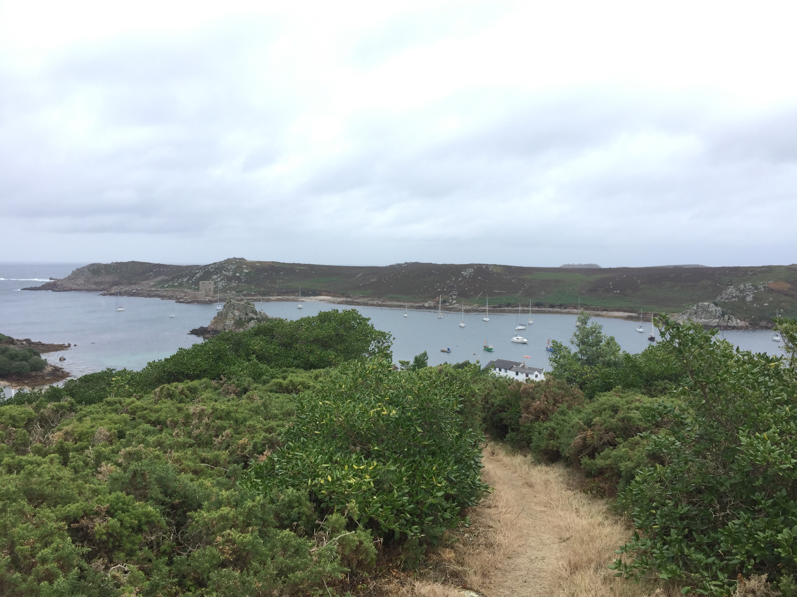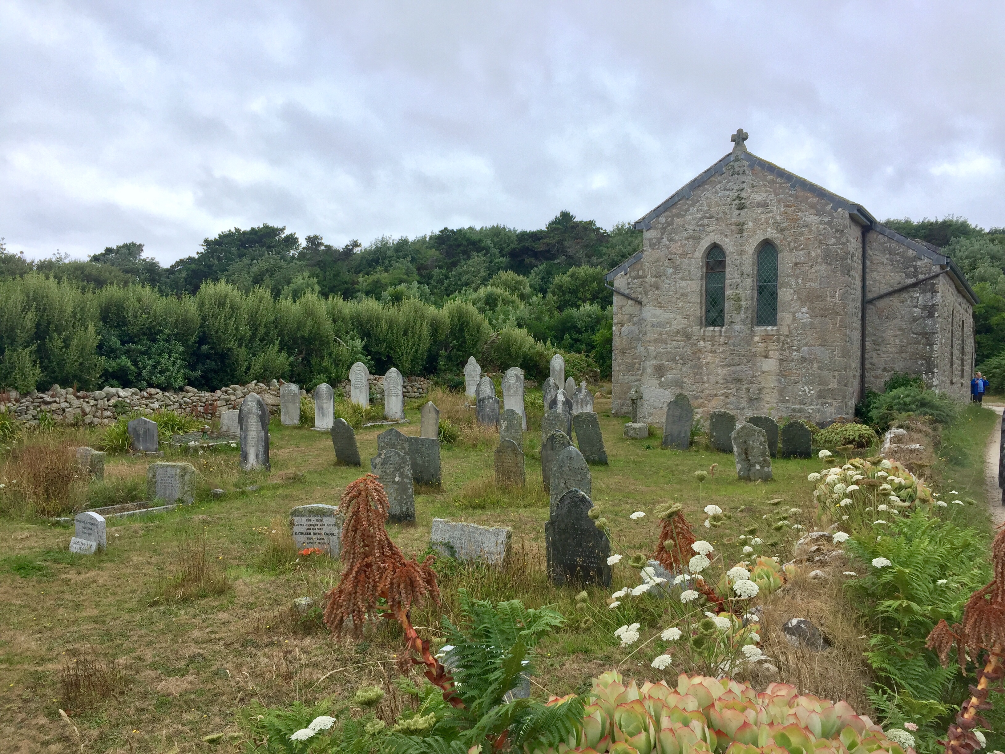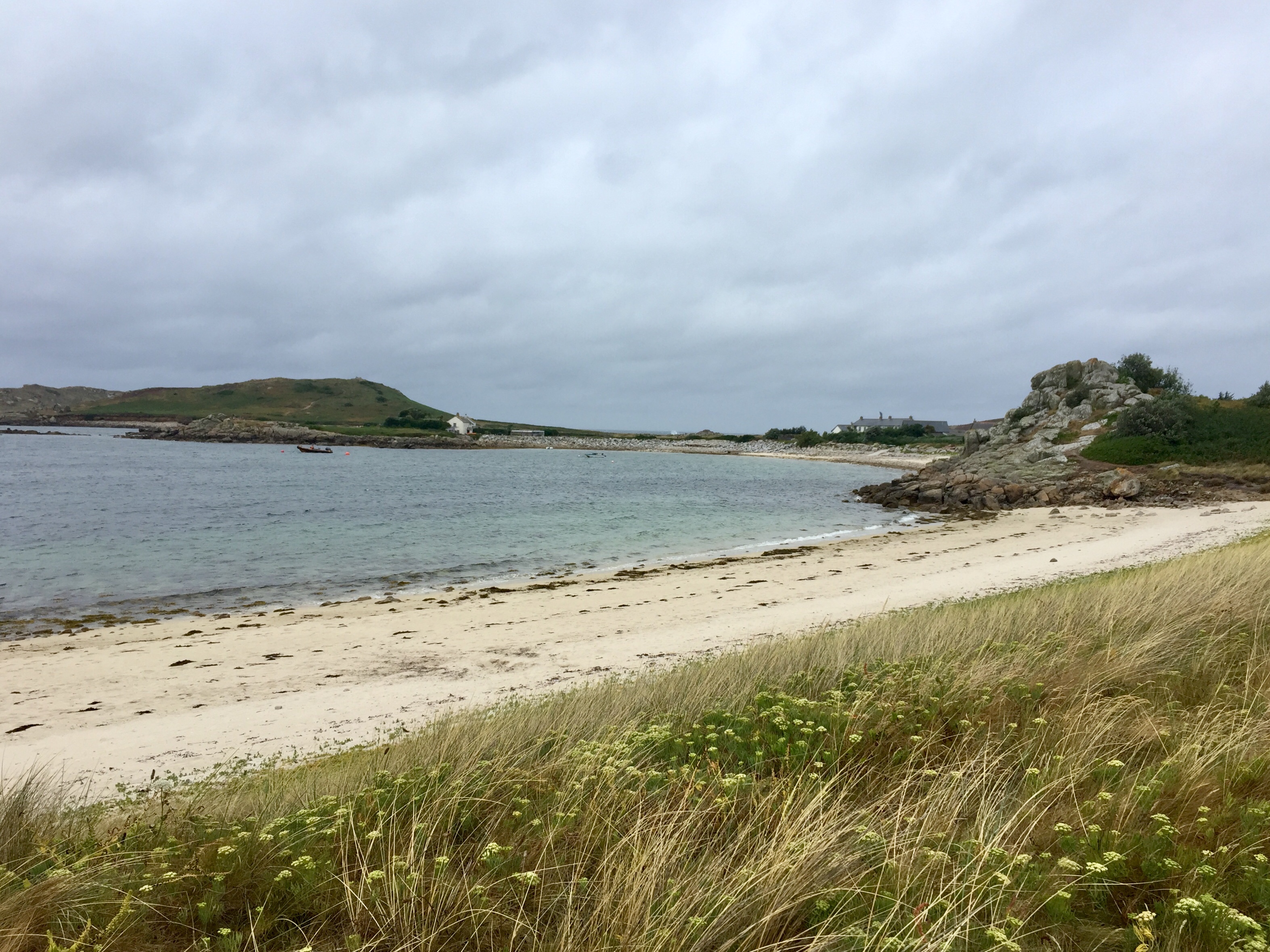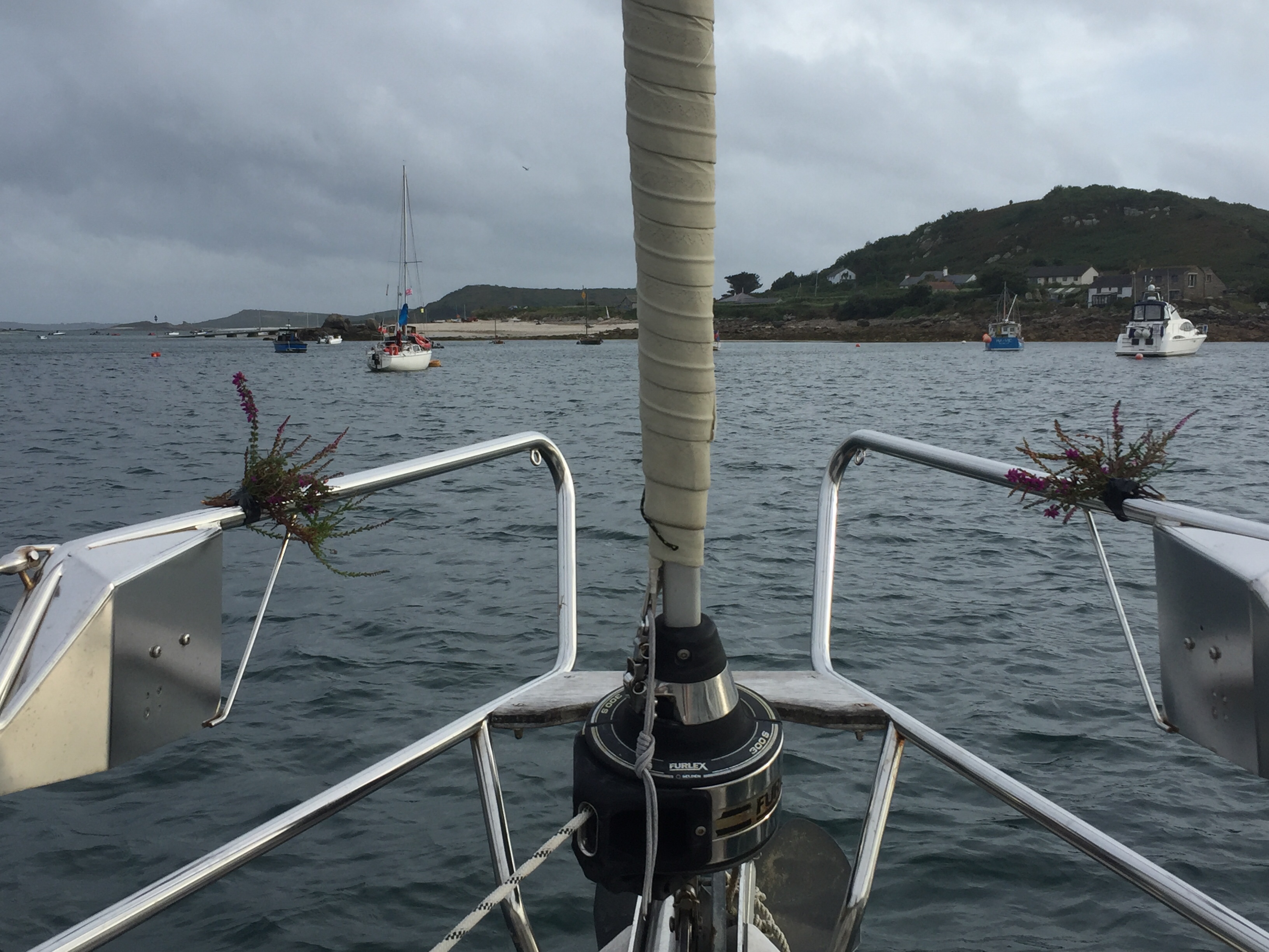 You go to bed with a calm sea and a sunset, and wake to a howling wind. However, the wind was forecast so we were expecting it overnight. Excited about a day walking on Bryher. We set off in the dinghy and parked her on the beach . we then walked south on grassy sandy rocky tracks. It was windy and overcast but beautiful. The well worn tracks always gave you the impression you were on a path to somewhere. We stepped inside the lovely little church …..All Saints Church… Bryher. They had some wonderful ( obviously contemporary )stained glass windows depicting swallows and cormorants, and other sea creatures. A couple of people came in and sat down to pray. We made our way first to the south of the little island. It’s a blustery day and a SW wind so of course the wind is most fierce in the western side. Walking the coastal footpath we came upon a lovely hut housing the works of artist Richard Pierce. What a back drop to making a living. Details in WILT. We had our picnic by choosing a rock in a sheltered bay. We walked round the north bit of the island, observing the waves of the Atlantic crashing into the rocks. In one particular bay, people had obviously made a children’s play area out of fisherman’s buoys, nets and various floats and pallets. In amongst trees. Fun. I was excited to see heather again and picked a bunch to replace the last bunch I picked in Kinlochbervie. …. which is now just a twig….. Eventually we came down to Fraggle rock bar and sat with a beer, looking out and wondering just how it could look so different…. 24 hrs on. Raining, we had to wipe the chairs, but still sat outside under umbrellas. We returned to the boat, and had a normal evening. I don’t remember it being that windy and we ate a delicious Greek salad in the cockpit, watching the sun go down.