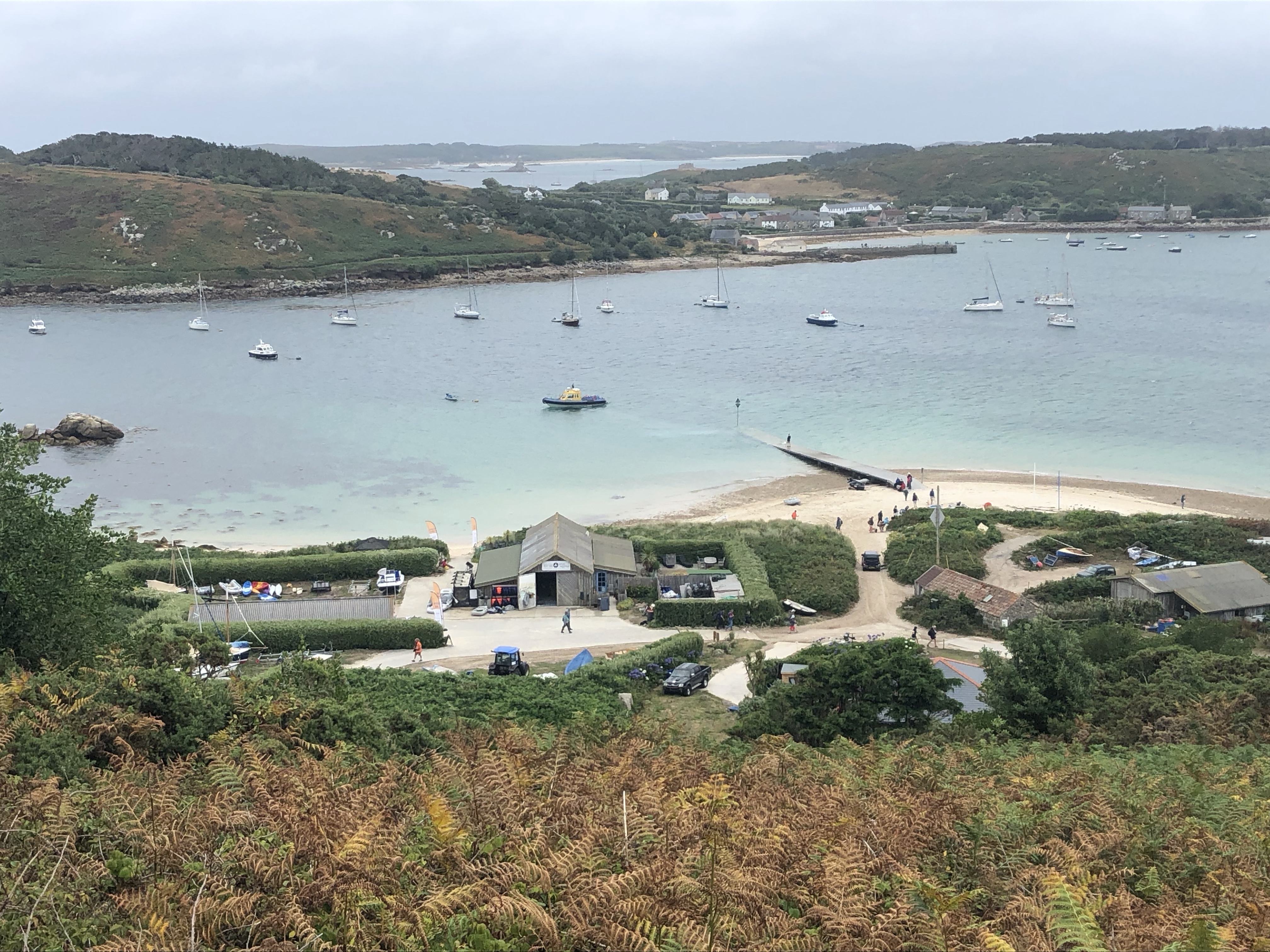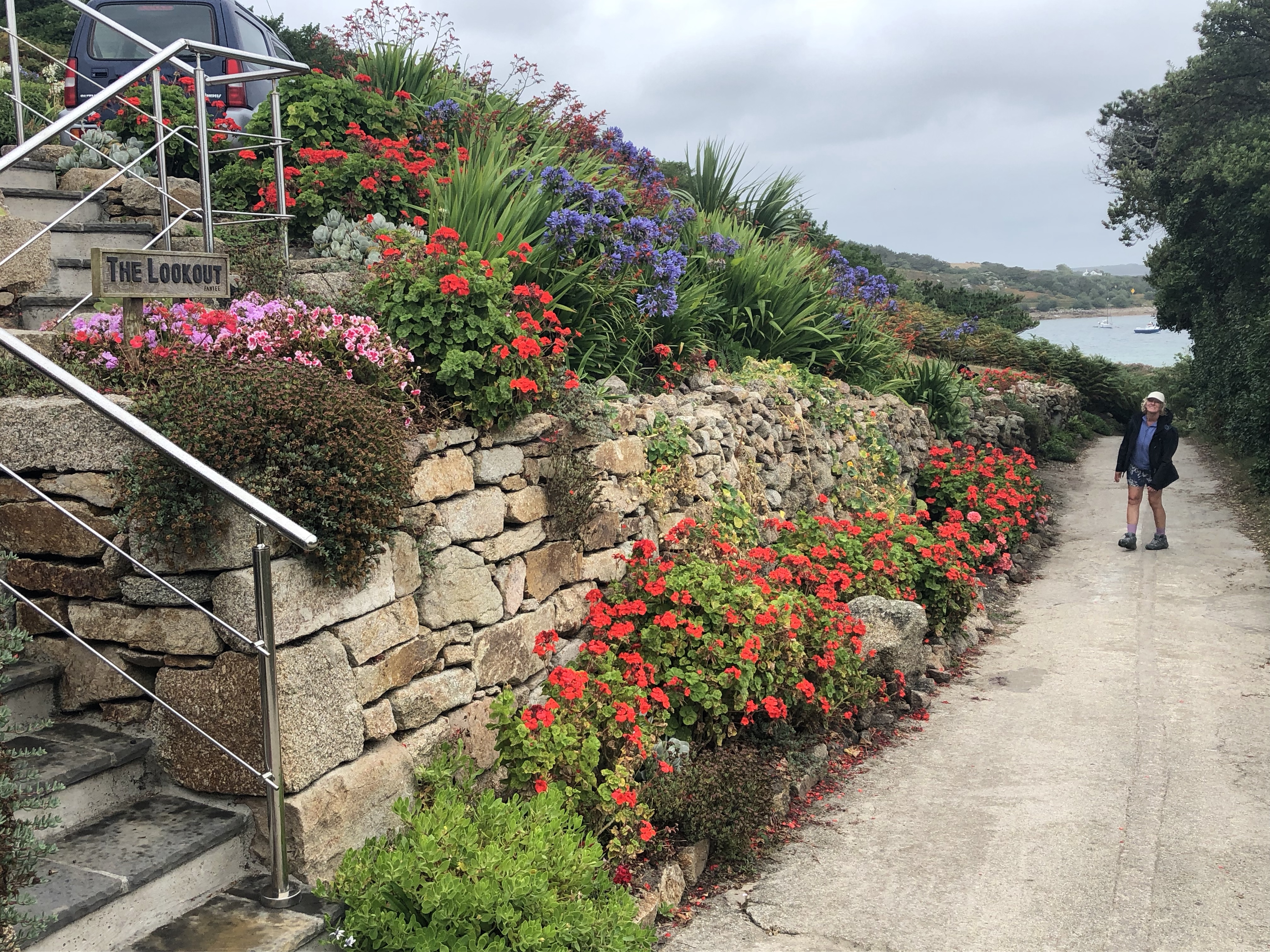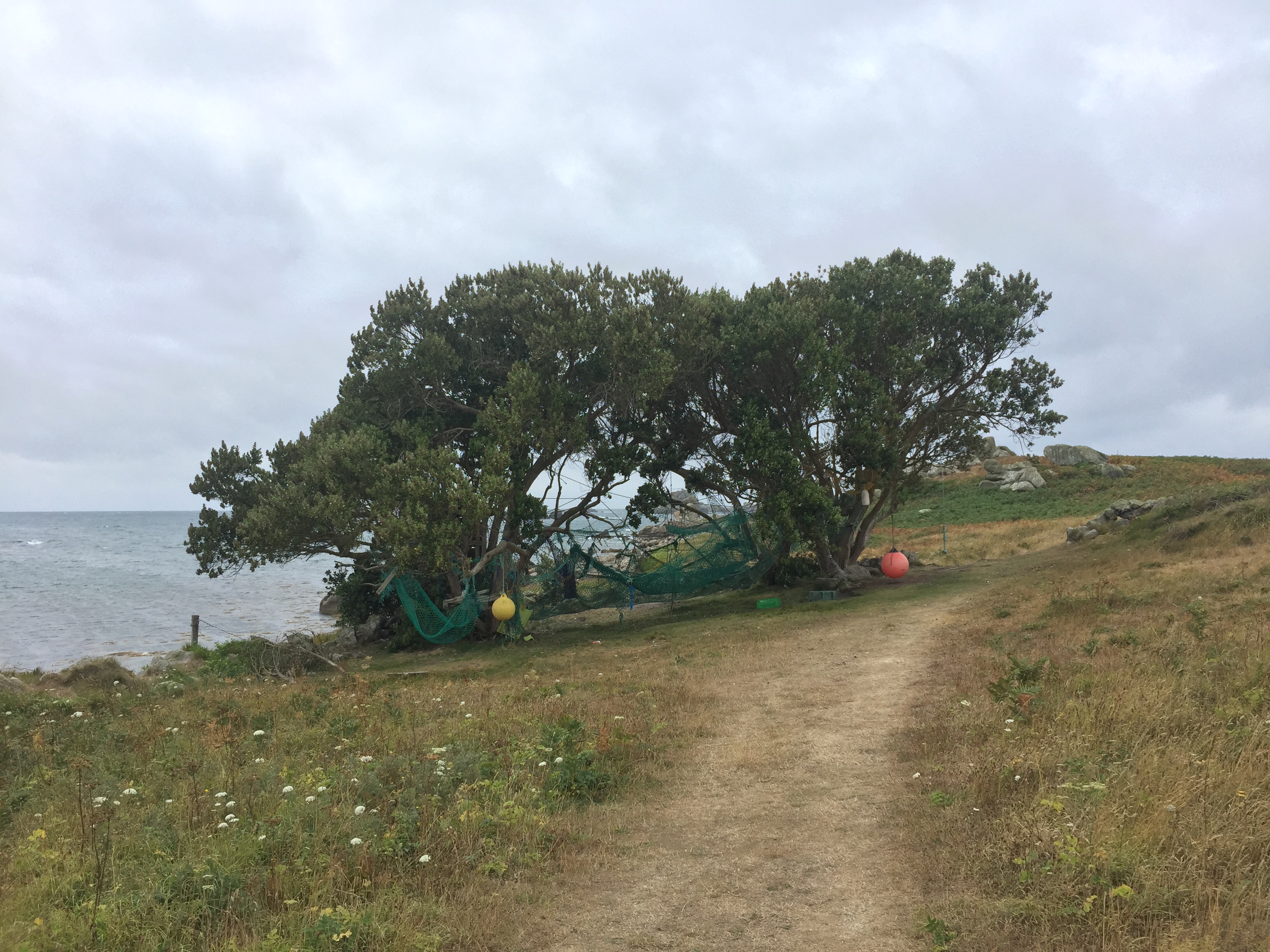 You go to bed with a calm sea and a sunset, and wake to a howling wind. However, the wind was forecast so we were expecting it overnight. Excited about a day walking on Bryher. We set off in the dinghy and parked her on the beach . we then walked south on grassy sandy rocky tracks. It was windy and overcast but beautiful. The well worn tracks always gave you the impression you were on a path to somewhere. We stepped inside the lovely little church …..All Saints Church… Bryher. They had some wonderful ( obviously contemporary )stained glass windows depicting swallows and cormorants, and other sea creatures. A couple of people came in and sat down to pray. We made our way first to the south of the little island. It’s a blustery day and a SW wind so of course the wind is most fierce in the western side. Walking the coastal footpath we came upon a lovely hut housing the works of artist Richard Pierce. What a back drop to making a living. Details in WILT. We had our picnic by choosing a rock in a sheltered bay. We walked round the north bit of the island, observing the waves of the Atlantic crashing into the rocks. In one particular bay, people had obviously made a children’s play area out of fisherman’s buoys, nets and various floats and pallets. In amongst trees. Fun. I was excited to see heather again and picked a bunch to replace the last bunch I picked in Kinlochbervie. …. which is now just a twig….. Eventually we came down to Fraggle rock bar and sat with a beer, looking out and wondering just how it could look so different…. 24 hrs on. Raining, we had to wipe the chairs, but still sat outside under umbrellas. We returned to the boat, and had a normal evening. I don’t remember it being that windy and we ate a delicious Greek salad in the cockpit, watching the sun go down.