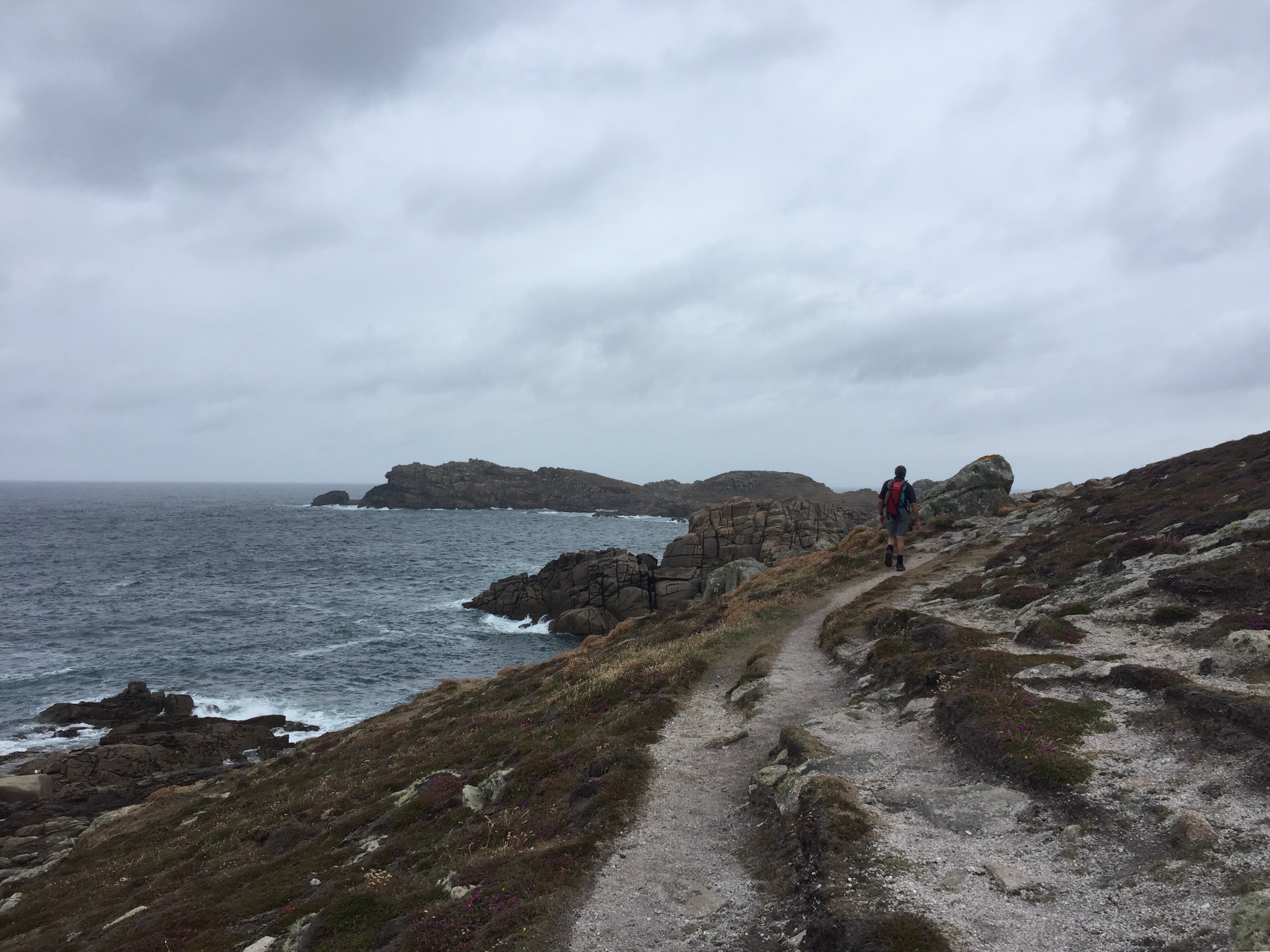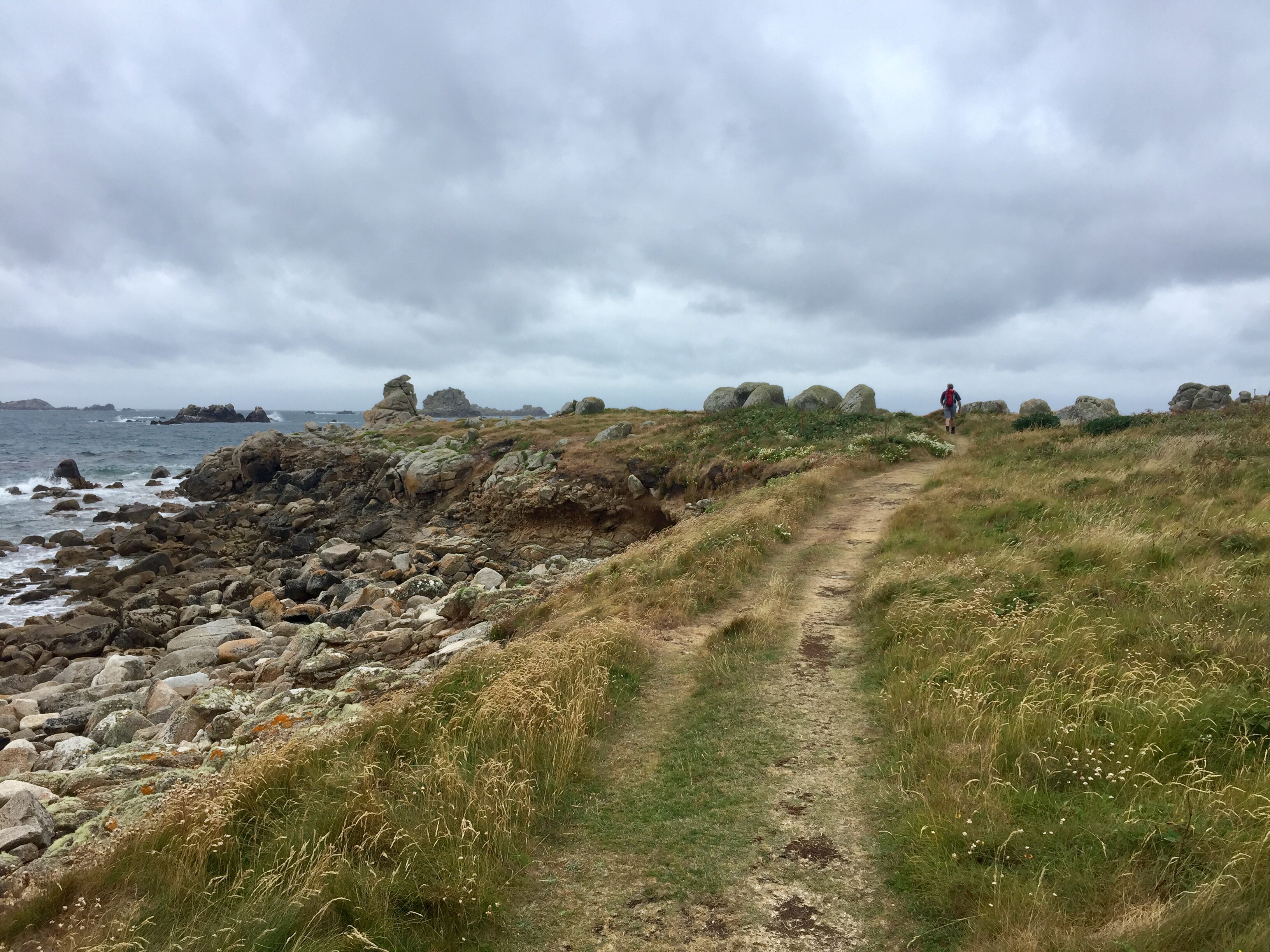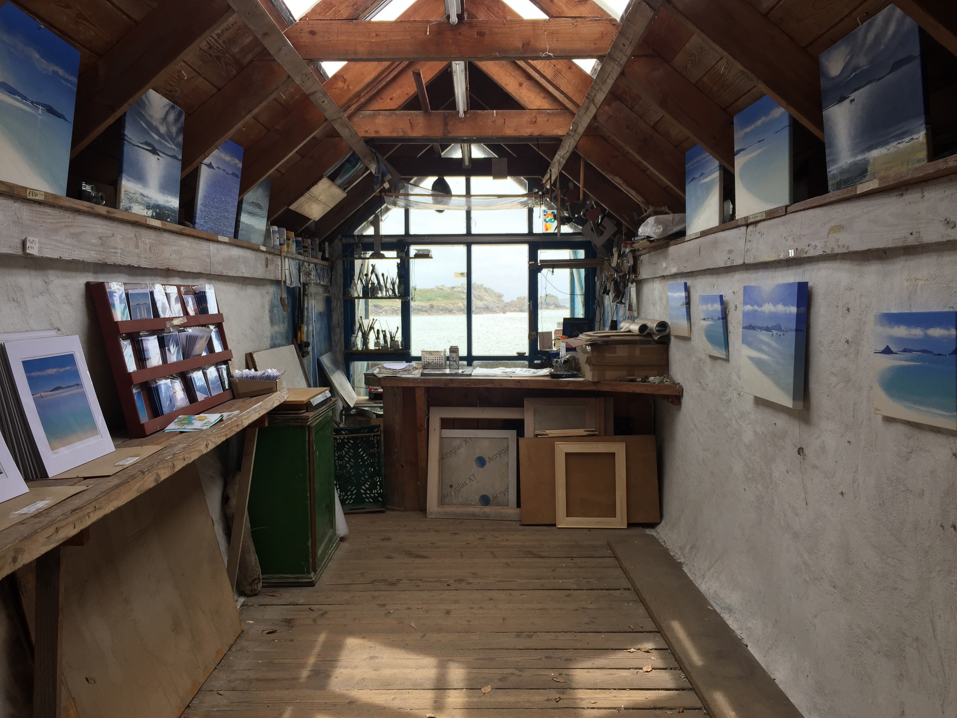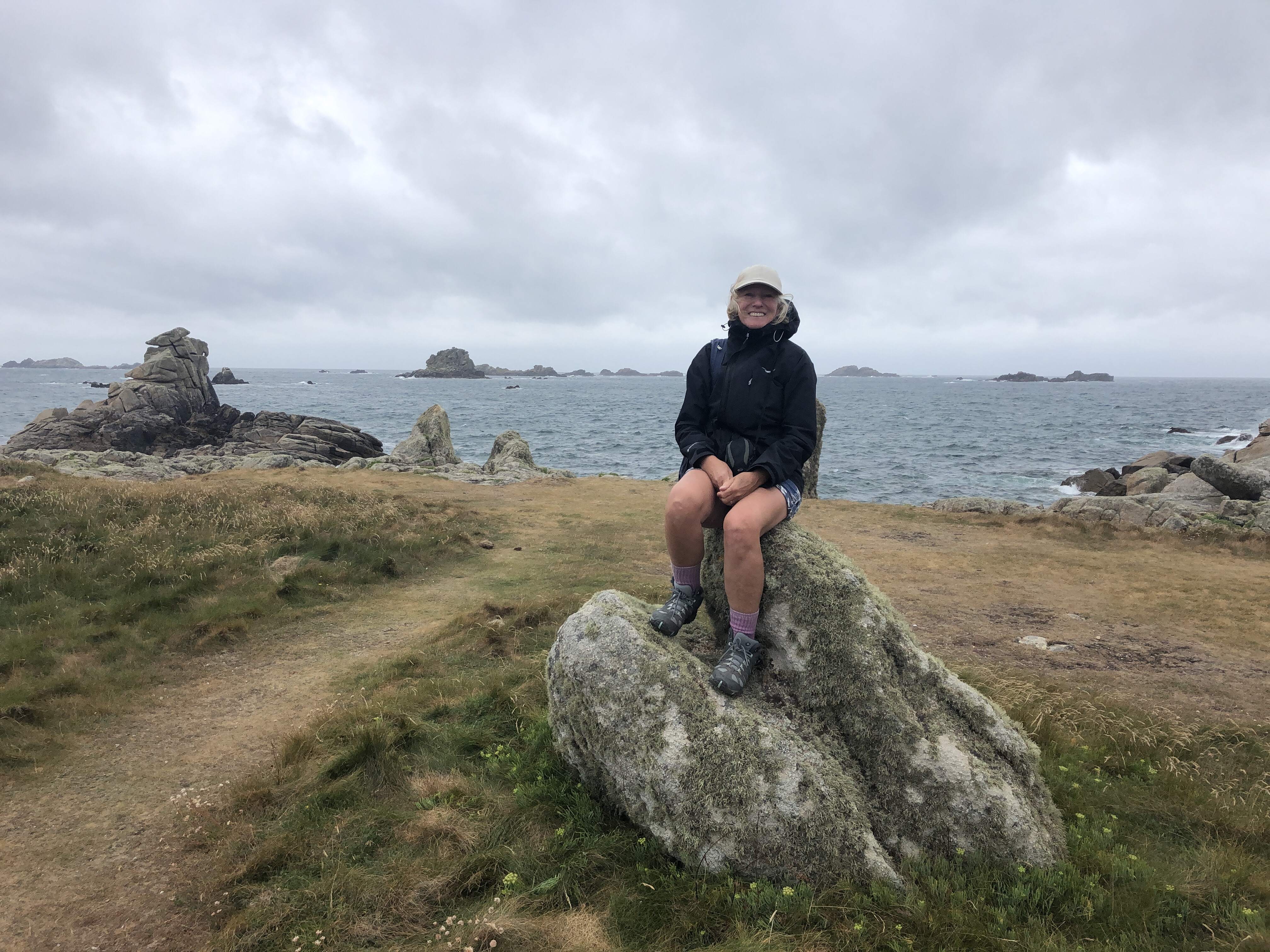 You go to bed with a calm sea and a sunset, and wake to a howling wind. However, the wind was forecast so we were expecting it overnight. Excited about a day walking on Bryher. We set off in the dinghy and parked her on the beach . we then walked south on grassy sandy rocky tracks. It was windy and overcast but beautiful. The well worn tracks always gave you the impression you were on a path to somewhere. We stepped inside the lovely little church …..All Saints Church… Bryher. They had some wonderful ( obviously contemporary )stained glass windows depicting swallows and cormorants, and other sea creatures. A couple of people came in and sat down to pray. We made our way first to the south of the little island. It’s a blustery day and a SW wind so of course the wind is most fierce in the western side. Walking the coastal footpath we came upon a lovely hut housing the works of artist Richard Pierce. What a back drop to making a living. Details in WILT. We had our picnic by choosing a rock in a sheltered bay. We walked round the north bit of the island, observing the waves of the Atlantic crashing into the rocks. In one particular bay, people had obviously made a children’s play area out of fisherman’s buoys, nets and various floats and pallets. In amongst trees. Fun. I was excited to see heather again and picked a bunch to replace the last bunch I picked in Kinlochbervie. …. which is now just a twig….. Eventually we came down to Fraggle rock bar and sat with a beer, looking out and wondering just how it could look so different…. 24 hrs on. Raining, we had to wipe the chairs, but still sat outside under umbrellas. We returned to the boat, and had a normal evening. I don’t remember it being that windy and we ate a delicious Greek salad in the cockpit, watching the sun go down.