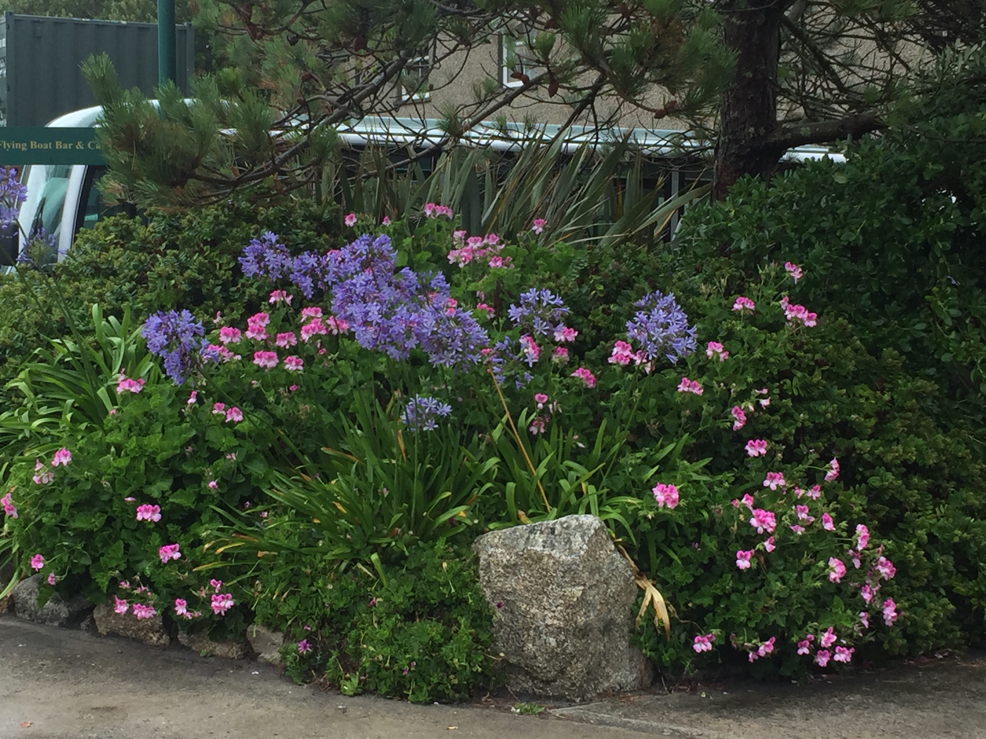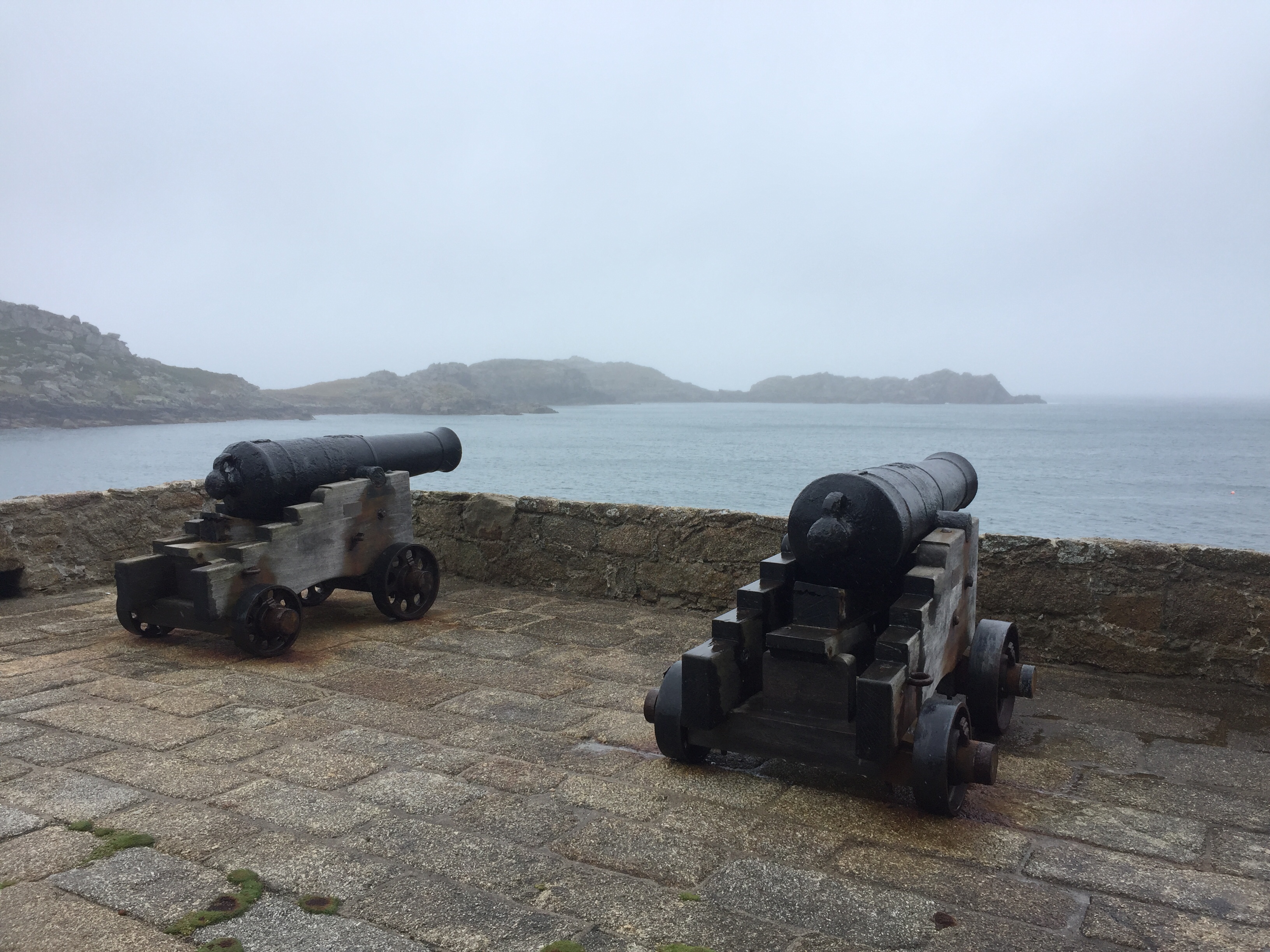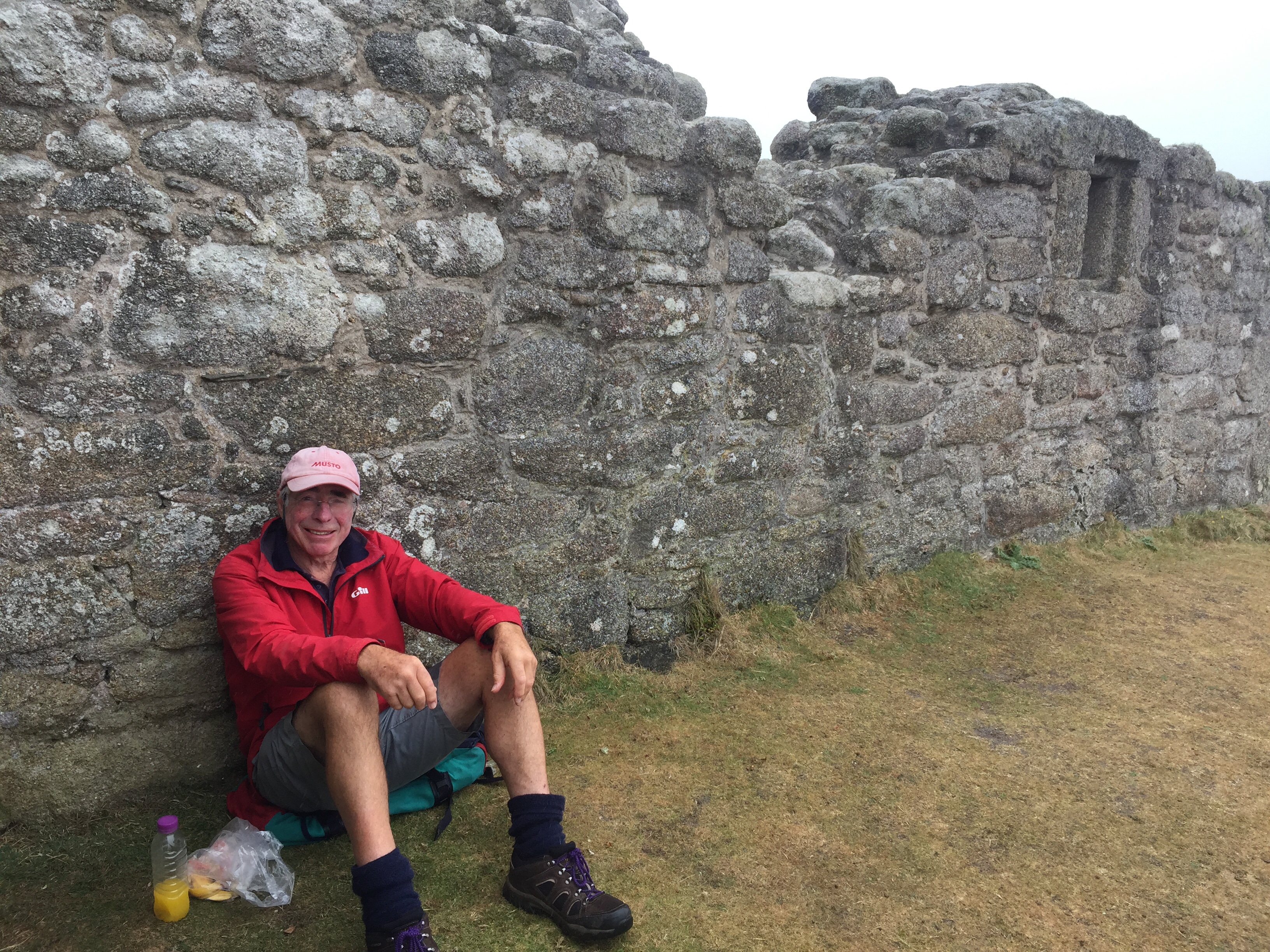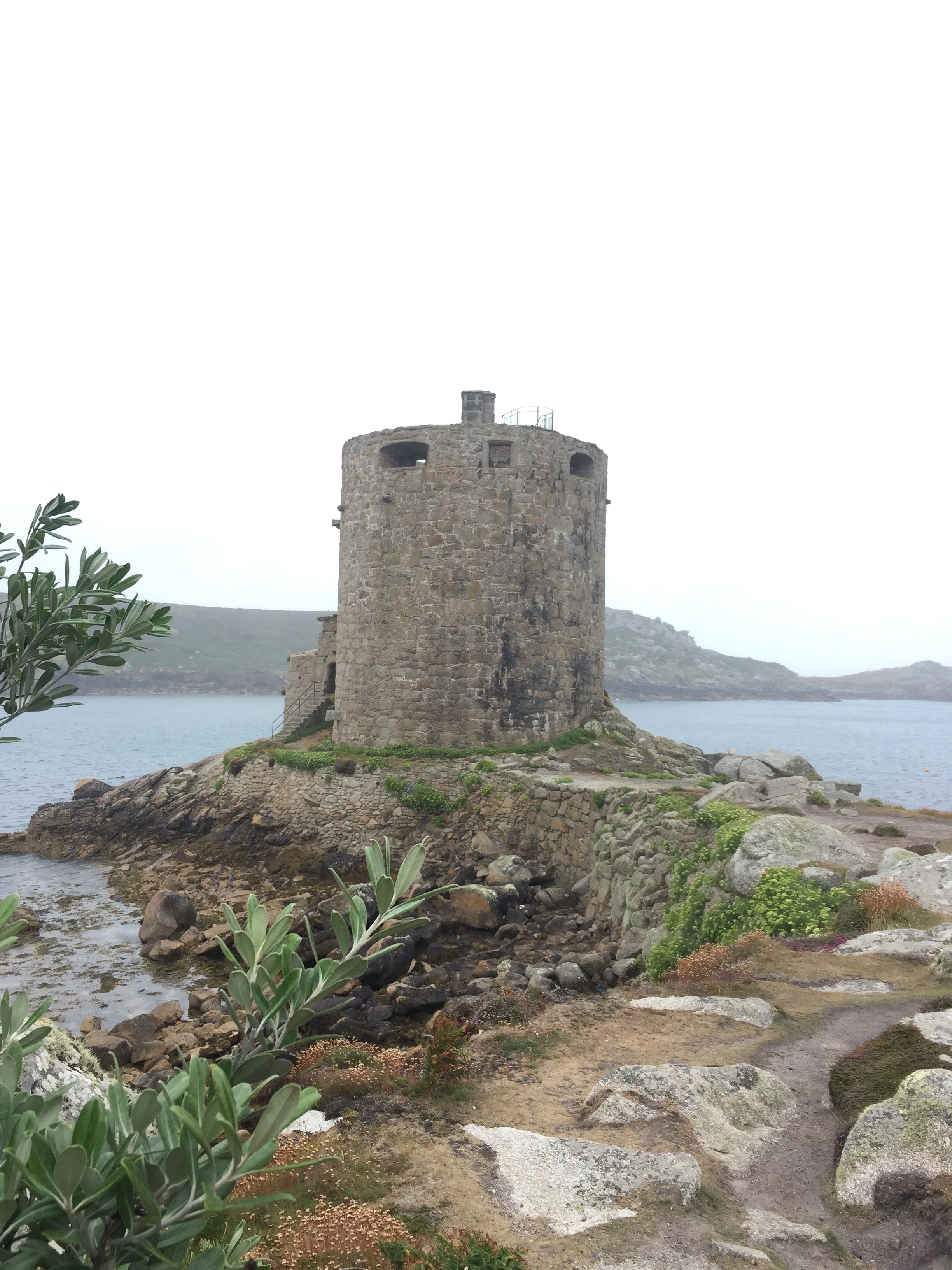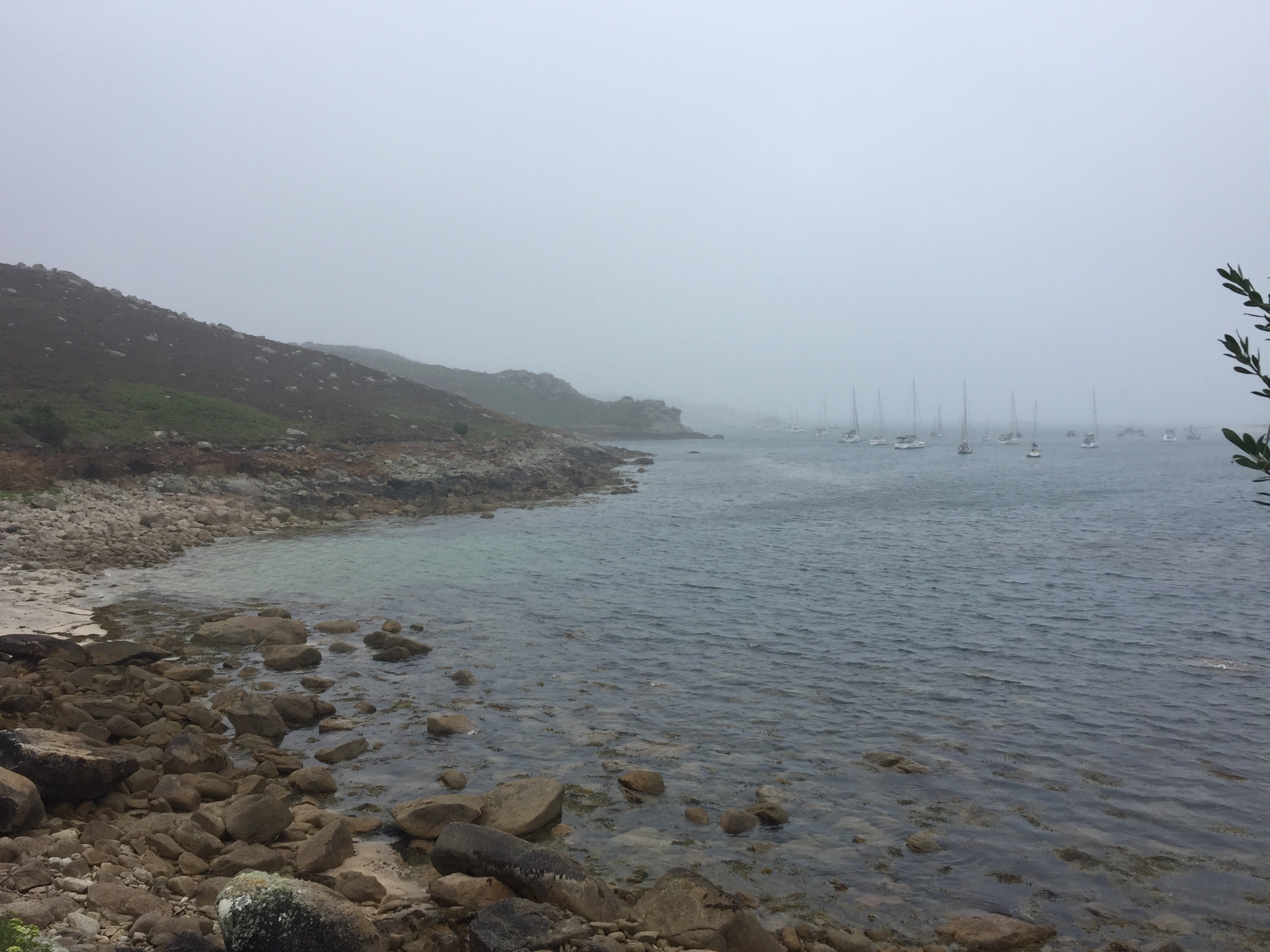The weather is worse today but at least the wind is still in the SW so we are protected on the mooring, although the sea state is quite wavy. We’d planned to walk or hire bikes today but opted for walking as it’s really not pleasant enough to make good use of bikes. We got our stuff ready…. wet weather gear and a picnic, and set off in the dinghy. Boats were bobbing around all over the place. We were going against the wind and the waves were pretty big relative to a small dinghy and we got soaked! Both wind and waves against us, it was also very slow progress. Got round the little quay eventually into flattish blue shallow water with a lovely beach. Our rucksacks were very wet but fortunately the “dry bag” inside was still dry. We filled our water containers again and left them in the dinghy. We noticed the dinghy next to us belonged to Stroller ( Charlie and Dons boat) and we tied ourselves to the same chain. We walked in a northerly direction keeping to the coast path. We walked past all the boats on the line of moorings, and on up to Cromwell’s tower. It started to drizzle and the wind was blowing. It felt very like Scotland! But warmer! After Cromwell’s tower we climbed a steep peaty slope covered with lime green bracken, purple heather and yellow gorse. The white and pink granite stones breaking up the path making it lumpy. We eventually reached King Charles Castle… less grand than it sounds but nevertheless a good place to have our sandwiches out of the wind. The other side of the island.. Old Grimsby sound, was more protected and the boats all looked quite peaceful. No one is around .No watersports rentals and hardly anyone on the beach. Once down to Old Grimsby we made our way along the concrete roads round back to New Grimsby and went to dry off in The New inn. When we came out the sun had come out in a watery way and the sea had calmed down a bit. The return journey was a lot more pleasant and the evening was altogether better.