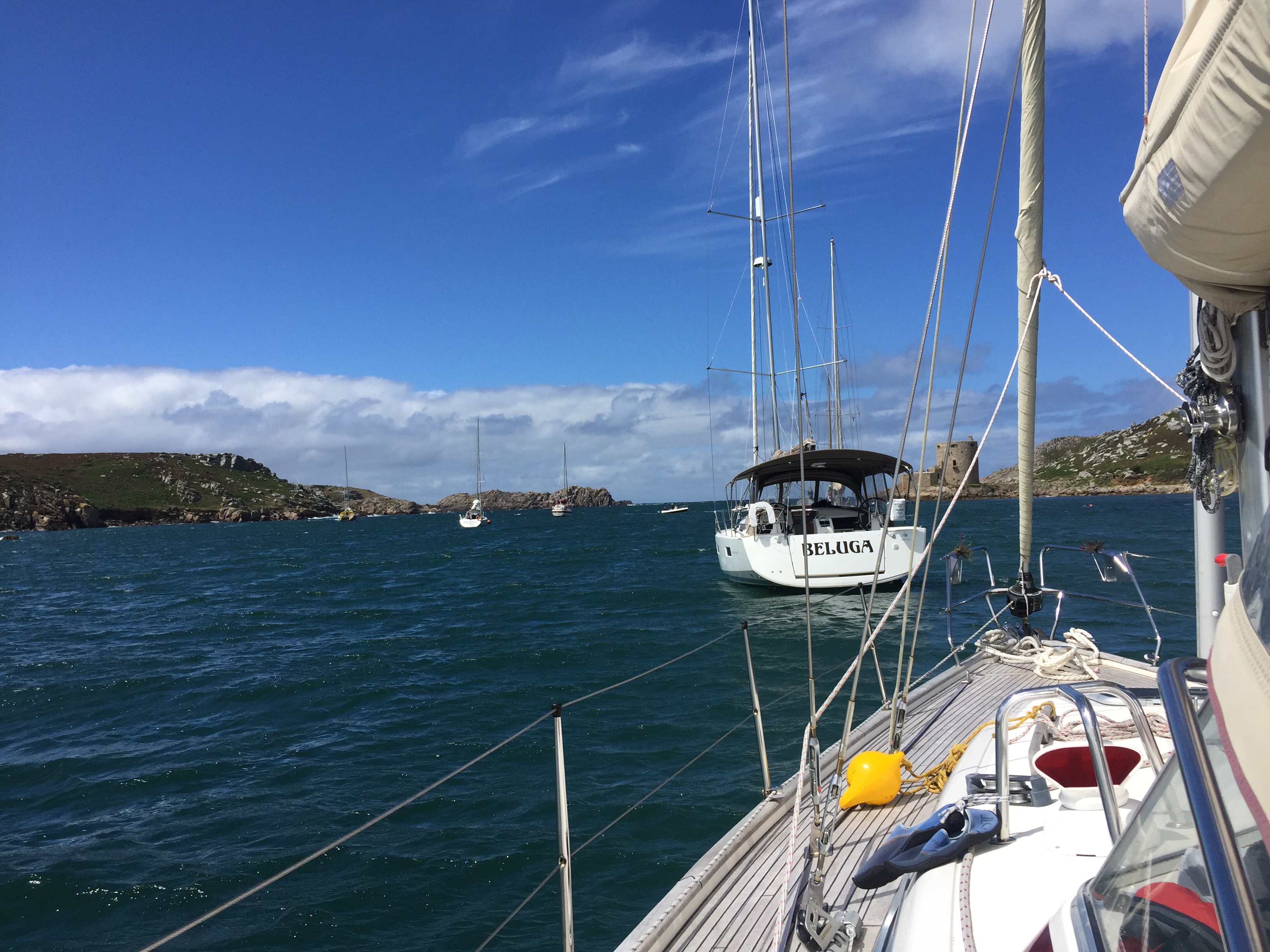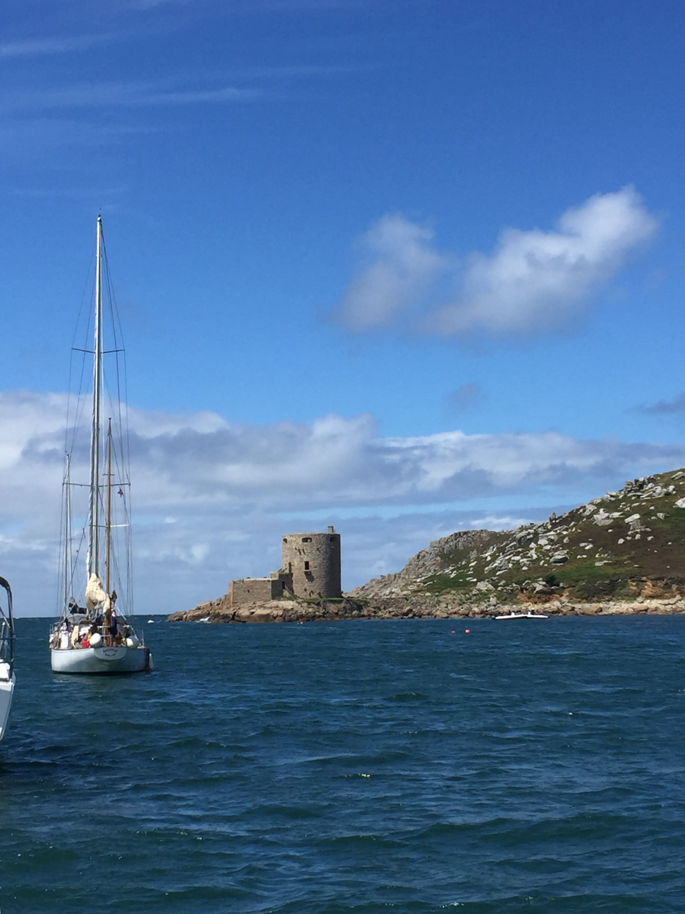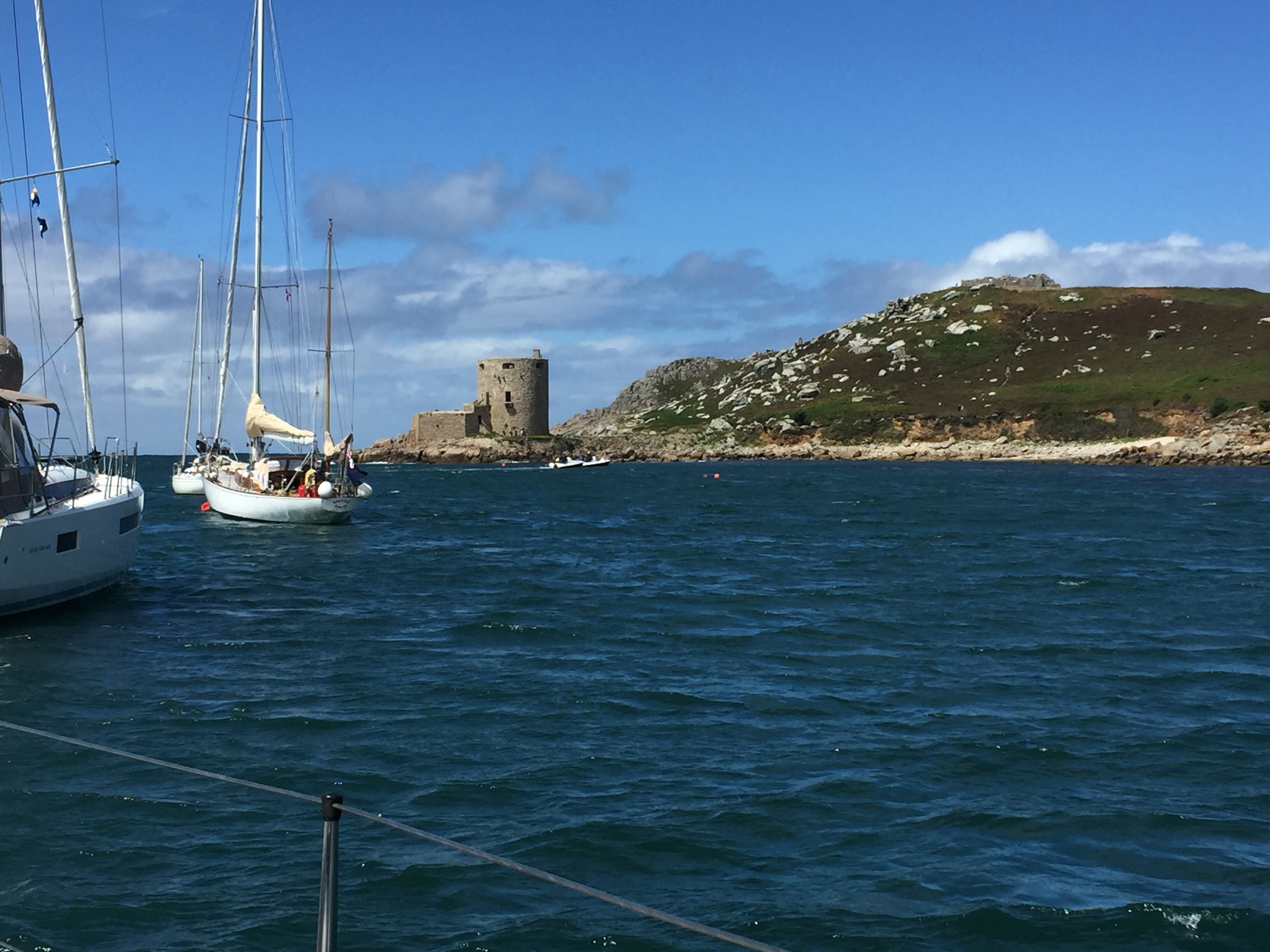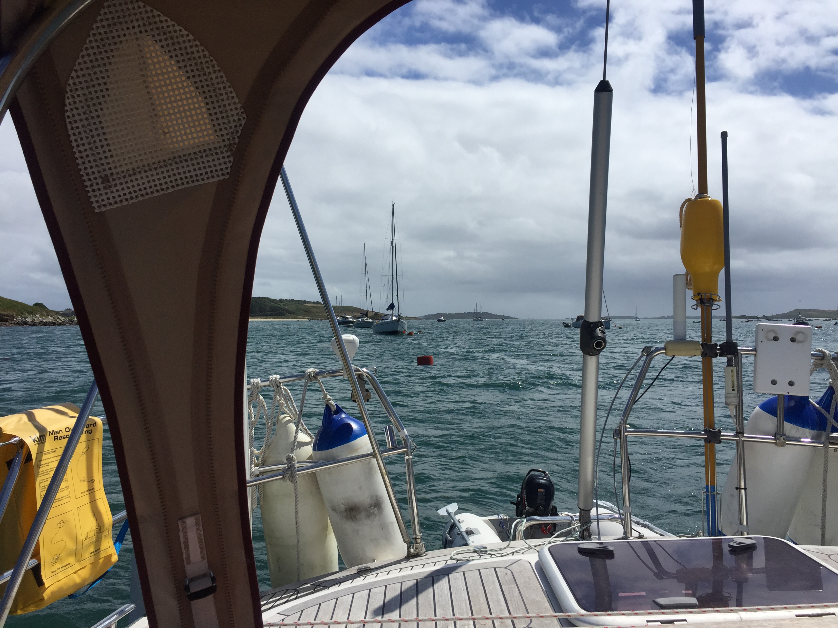 Not a comfortable night! The wind has gone round into the north so there is less protection in the Sound than before. Big waves out to sea are rolling into the channel. Boats being tossed about all over, pitching and rolling on their moorings. The motion on Angelique isn’t great but probably a lot better than some I’m observing. Smaller, lighter boats are bobbing around like corks. It must be horrid inside. We’re also in the row of moorings nearest to the land which I think is beneficial. It certainly wasn’t a day for getting in the dinghy. Going downwind would be fine but getting back against the wind and the waves would be very wet and potentially dangerous. We cancelled our coffee date with Charlie and Don from Stroller, and decided to spend the day doing reading etc. I spent quite a lot of the time just watching things. Some boats actually went out into the horrid weather, presumably to try and find better shelter. One boat moved moorings to try and get one in a position with less waves. Not a great decision I feel as it took them a long time with a lot of gesticulations and shouting to pick the mooring up on the bouncy sea. In the end it didn’t look like it was any better and then a couple of hours later the wind and waves died down a bit anyway! 😳 despite it being really windy, it was quite sunny so not unpleasant to be sat doing not much. I read the pilot for the Isle of Man and Julian contacted Kilmore Quay which is our intended destination when we leave Scilly. We watched the debate between Liz Truss and Rishi Sunak in the evening… interesting??🤔 and had jalfrezi curry for supper.