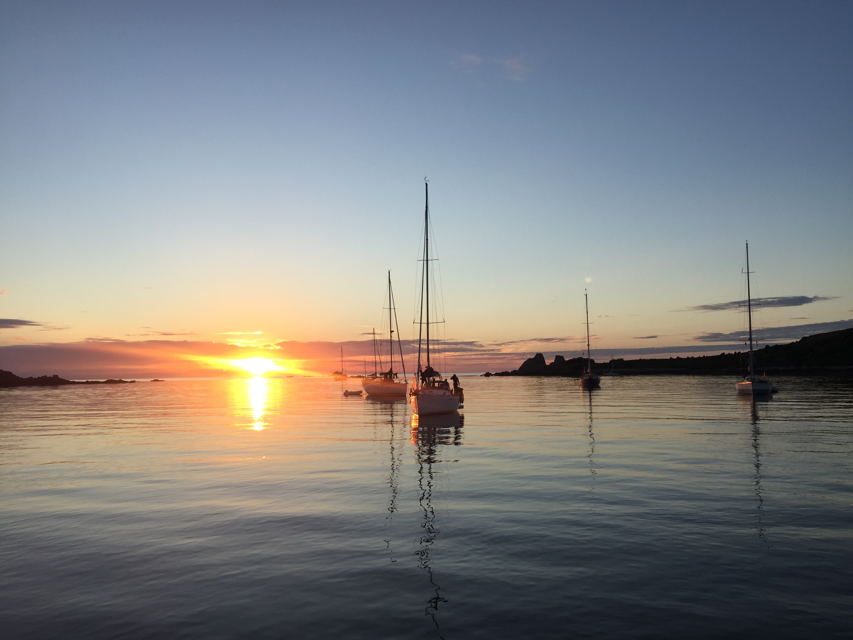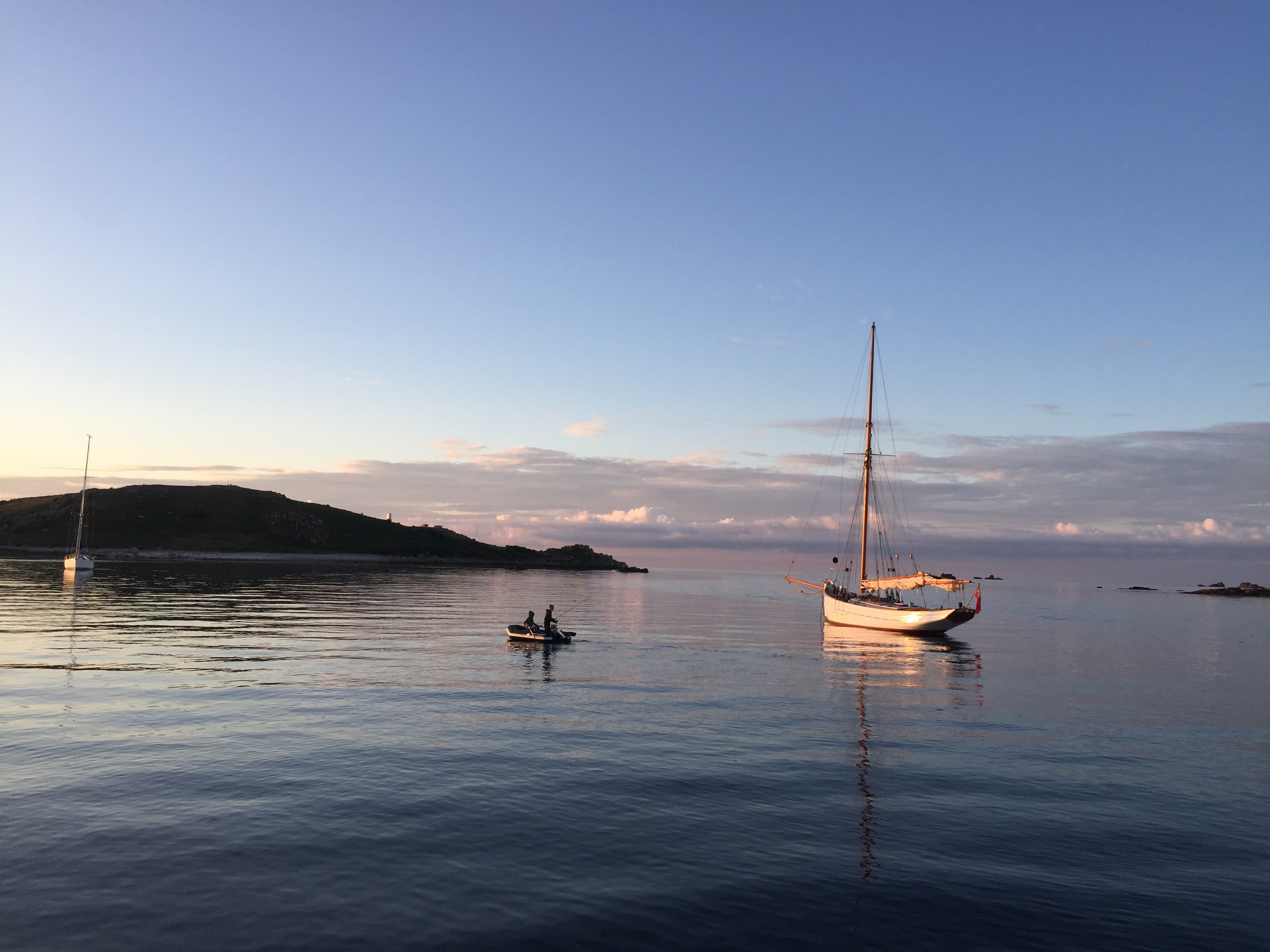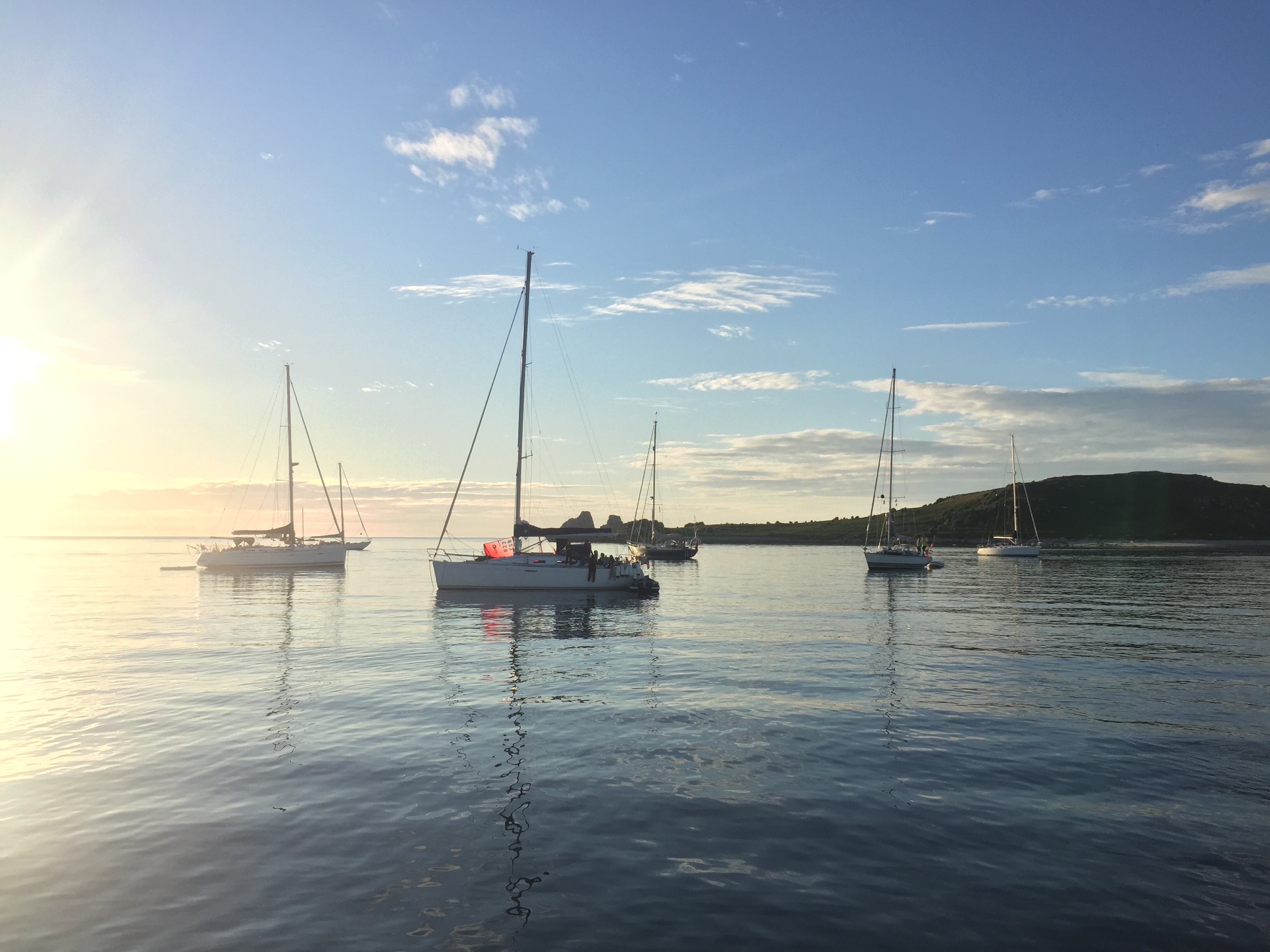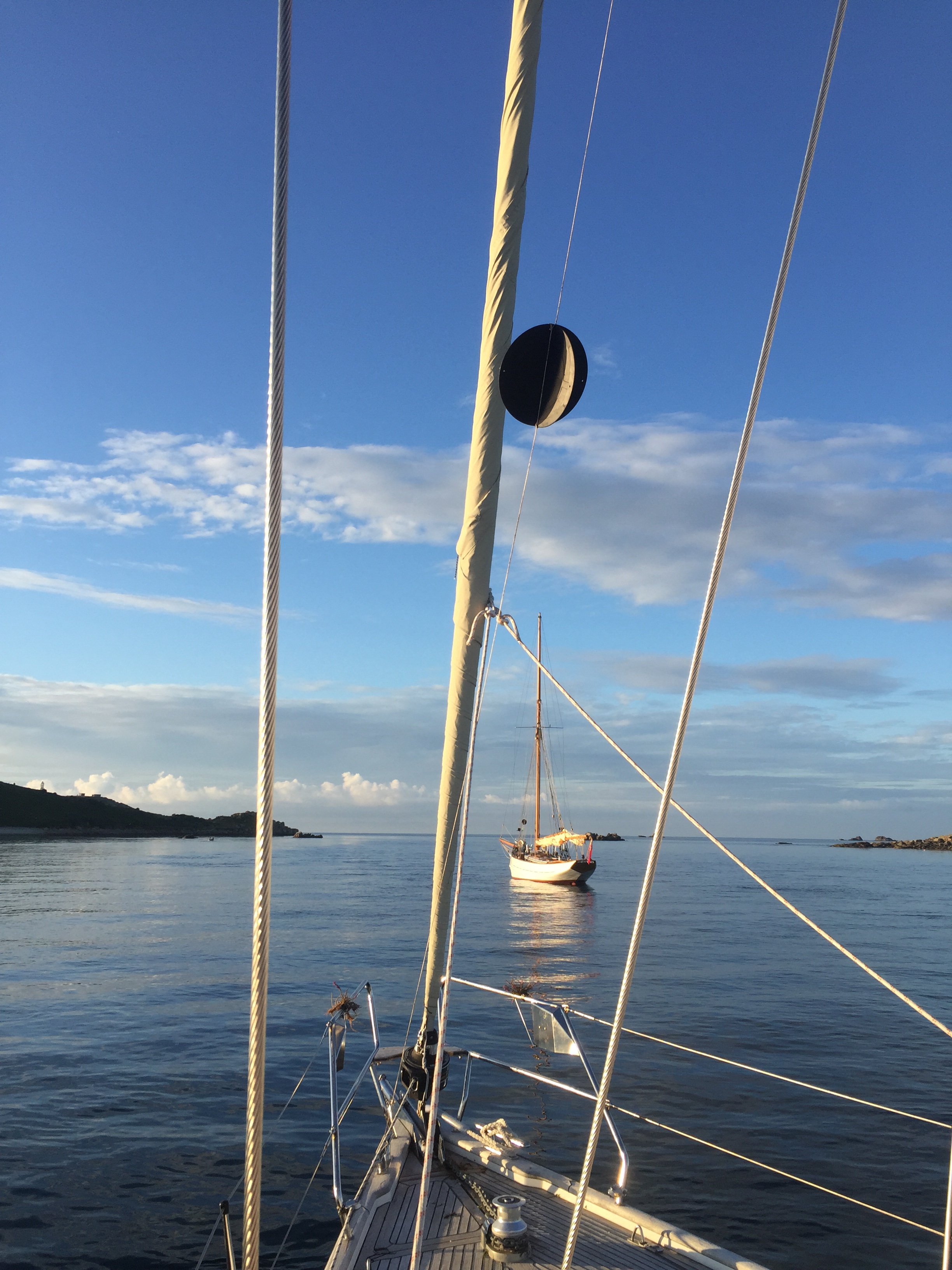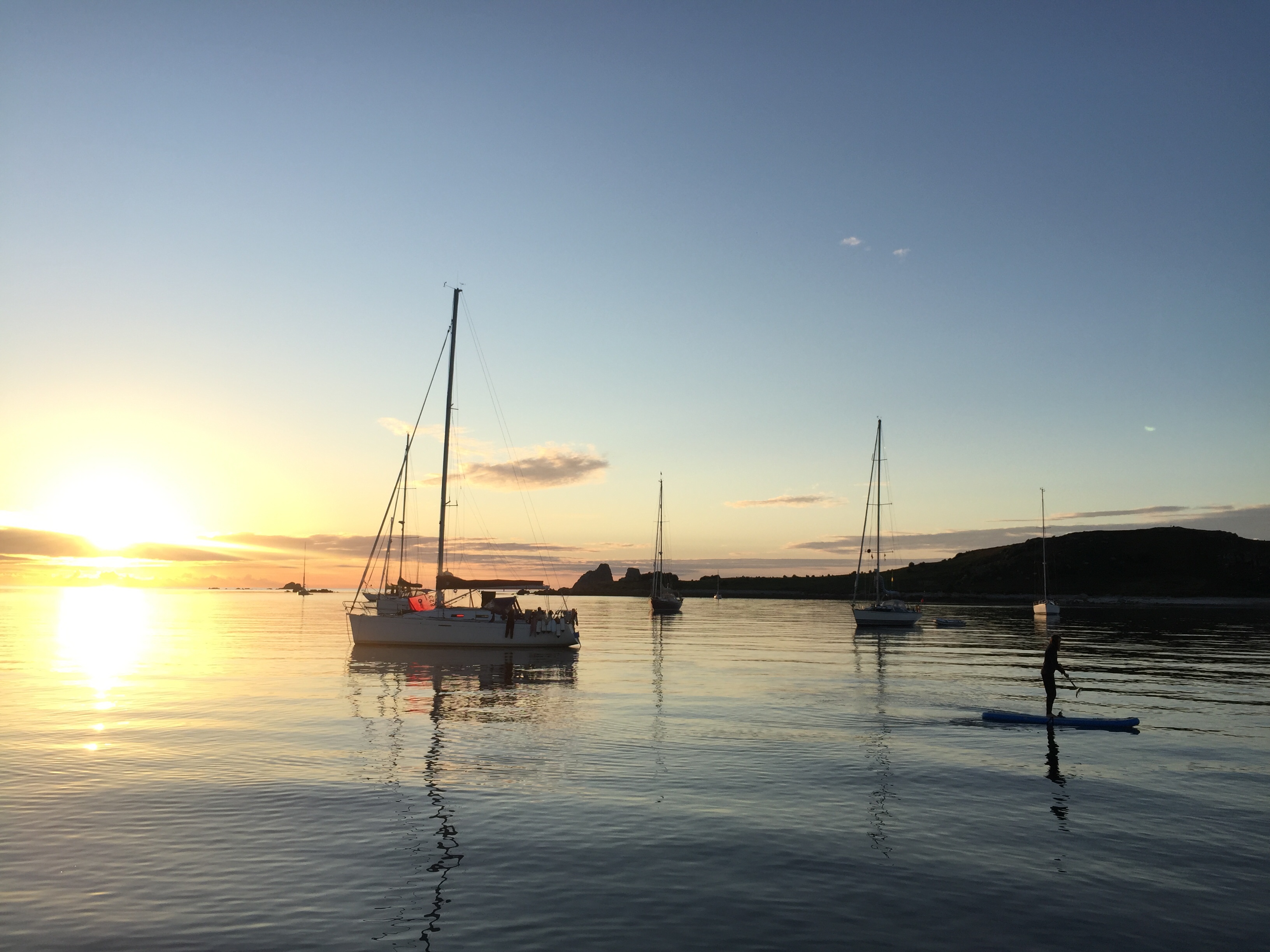 We should have left when we knew the wind was changing direction, but it was forecast to be very light and we stayed put. Its not that simple in Scilly, given times of tides and where you can go when, and then will there be room? Suffice to say it was a pretty Dreadful night. Heed the pilot! The swell created made sleeping impossible. I woke at 0019 . The boat was pitching and rolling in an undulating rhythm. In addition there was a horrible grinding sound every few minutes and the boat snatched at the anchor. We found out when we eventually pulled it up we took a right angle Bend which meant that when she turned, her anchor must have wrapped round a rock or rocks, creating that sound and the snatch. Julian and other skippers in the bay were up on deck in the night, head torches flashing. One boat left in the middle of the blackness, another at first light. We hadn’t slept and were so tired . It turned out that actually in the morning, it settled down considerably. We had missed high tide though, so we had to go round the outside of the islands to get anywhere. We decided on Old Grimsby Sound as our destination and it was a lovely trip, the wind light and sea flat , enjoying the west side of Scilly from the sea. We turned into the sound and although there were moorings free, there were also about 8 boats anchored. Presumably everyone as us, a bit put out about £30 night for no facilities ( except the buoy) we anchored but it was impossible to set the anchor adequately as we were tide rode. Meaning you can’t head the boat to the wind as it’s hull is only lying according to the tide. Fine until the tide changes. We sat a while to see if it would settle down, but as the tide is due to change in the middle of the night….. we decided to go to Helens pool as there may be less tide there. I think we anchored and re anchored 4 times today, every time some reason why it wouldn’t set. This was where our anchor dragged before so of course we were wary. Eventually, still tide rode, but in a slackening tide with a dying breeze, we just set it and it held. After all the effort of today we were rewarded with some stunning sunset photos, a glassy sea and an entertaining family ( or 2) of french people in a 36 ft boat next door. How they all fitted in I don’t know but the kids were all having such fun, swinging into the water off the halyards, paddle boarding, then using the SUP as a windsurfer, and eventually 2 young lads fishing off the dinghy. It was the most peaceful evening and night we have had the whole trip.