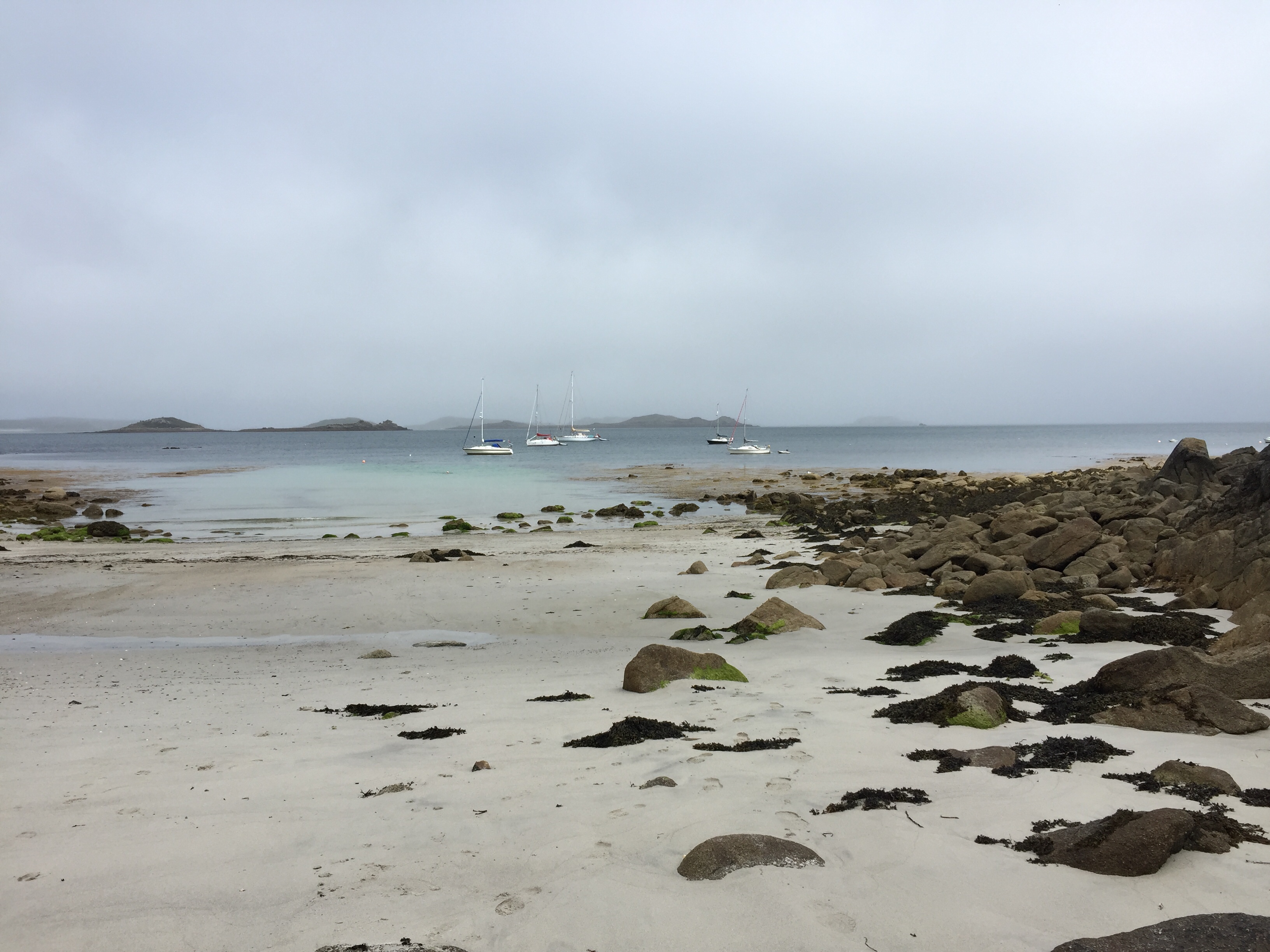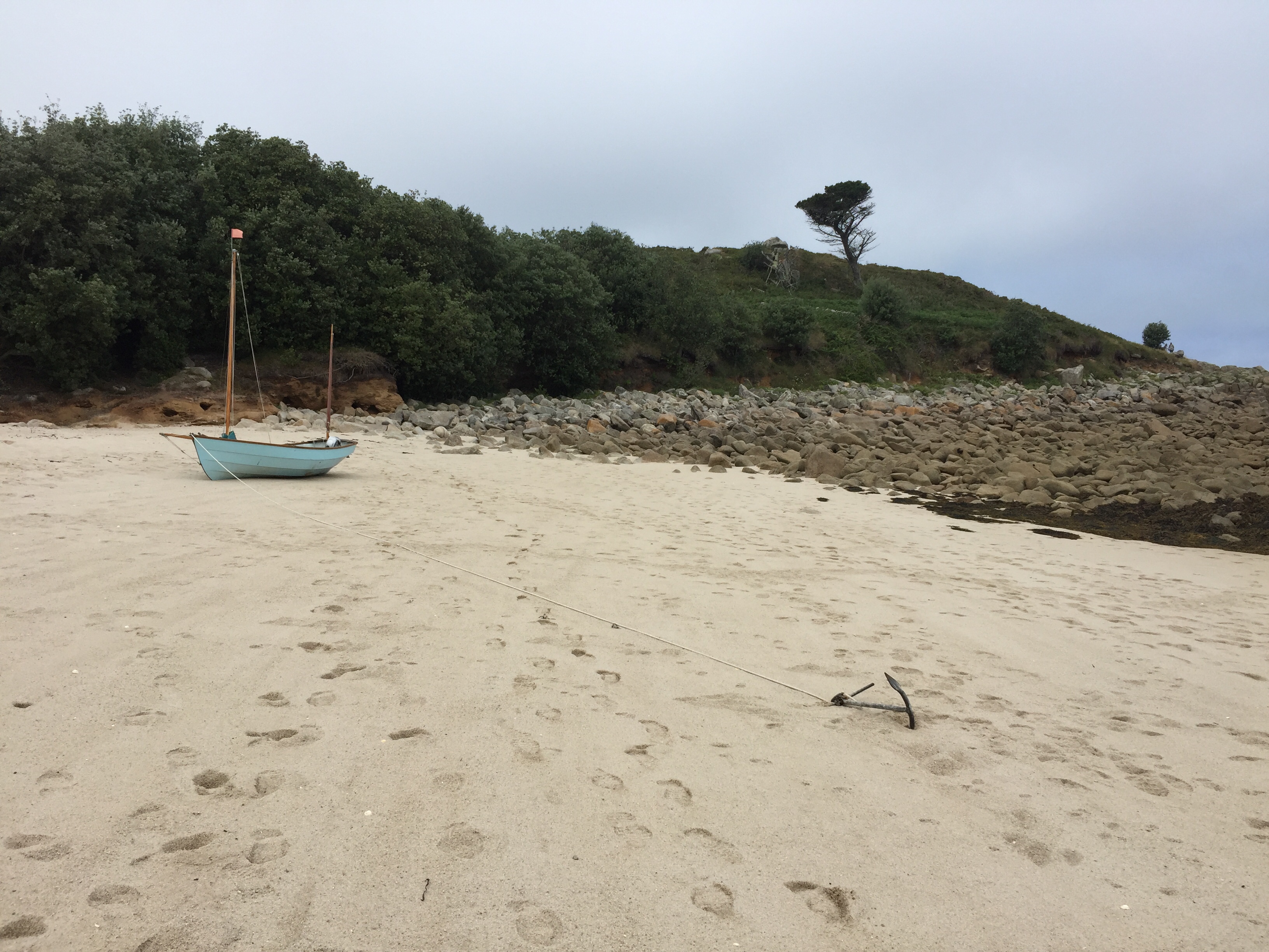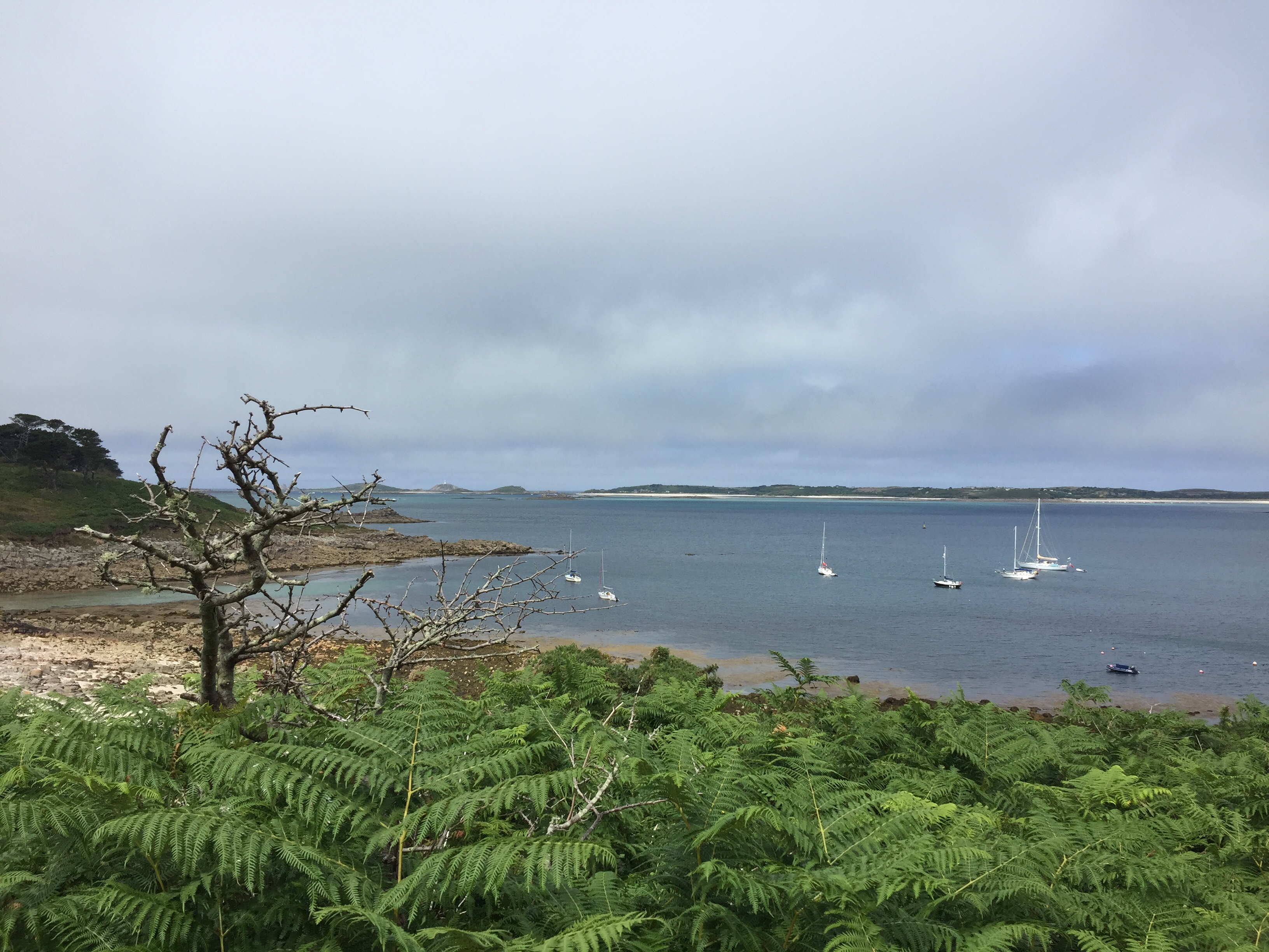 Today was our “ exploring St Marys day”. Unfortunately we couldn’t get a Scilly cart ( electric golf buggy with number plate) as they were all booked up. … So we had to settle for the community bus and walking. Beforehand, we topped up with more water, and managed to buy a telegraph from Mumfords. Also a few more things from the wonderful coop! We put them all back in the dinghy and set out for the bus which was going at 1230. We could have gone all round the island on it but that appeared to only take 17 minutes, so we opted to get out at the furthest point, and walk back. The driver was a good sort who had a sign above him saying “ your drivers name is Steve, but his friends call him The porpoise….. and none knows why “. 🤔 we got off and walked to Watermill cove on the SE side of the island. The roads were tarmac for a change and extremely quiet. Hedgerows and small fields adjoining them. Birds and butterflies in abundance. We made our way off the metalled road, down a track to Watermill. It’s a cove which we haven’t managed to get to in the boat but is s favourite anchorage. We sat on a rock on the beach and ate our picnic. It was calm. The wind was in the west. Trekking back up to the coast path, we got fantastic views down into the bay and across to the East. There was a round the island yacht race today, and we could see the sails in the distance. We walked along the grassy bracken lined paths, along stone walls and past weathered wooden farm gates. We trudged across a sandy beach below a campsite…. but even this didn’t make it busy. Up from the beach on a sandy track we found a lovely cafe where we had a pot of tea for two! We watched the sparrows devouring every morsel left on plates abandoned on tables. One would never have thought they would like stuff like coleslaw but it seems they’re not fussy and obviously seem to have adapted well and be flourishing on leftovers! We eventually got back to Hugh town, making our way through Old Town, and then climbing the steep hill on the other side to garrison…. the site of the 16 th century medieval castle that has been tuned into the Starcastle hotel. The bar is set in the dungeon which is amazing but still smelt musty… so we took our drinks outside to the ramparts. The castle is built of granite, so is incredibly well preserved for its age. Eventually we got back to the boat and had a quick change before getting in the dinghy once more and going over to Portmellon beach to a restaurant called “The Beach “ . We had fantastic food and a memorable evening. It was fun to go out to dinner on the dinghy!