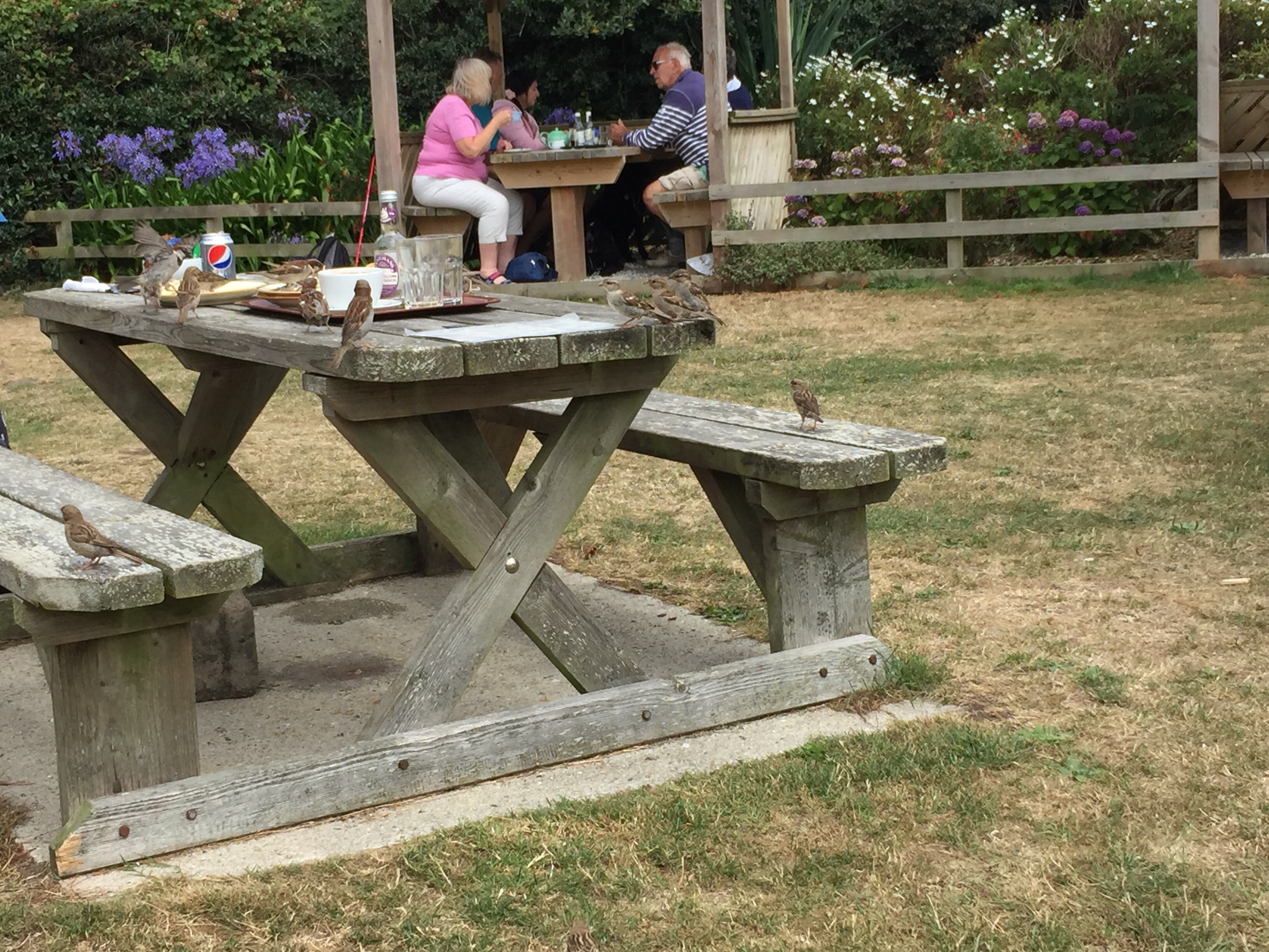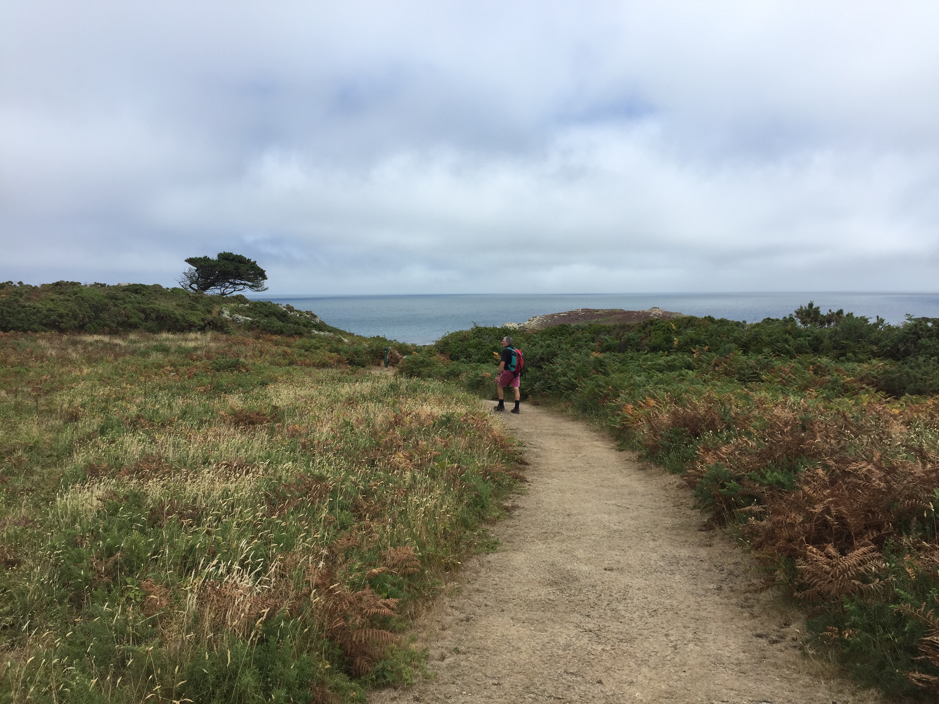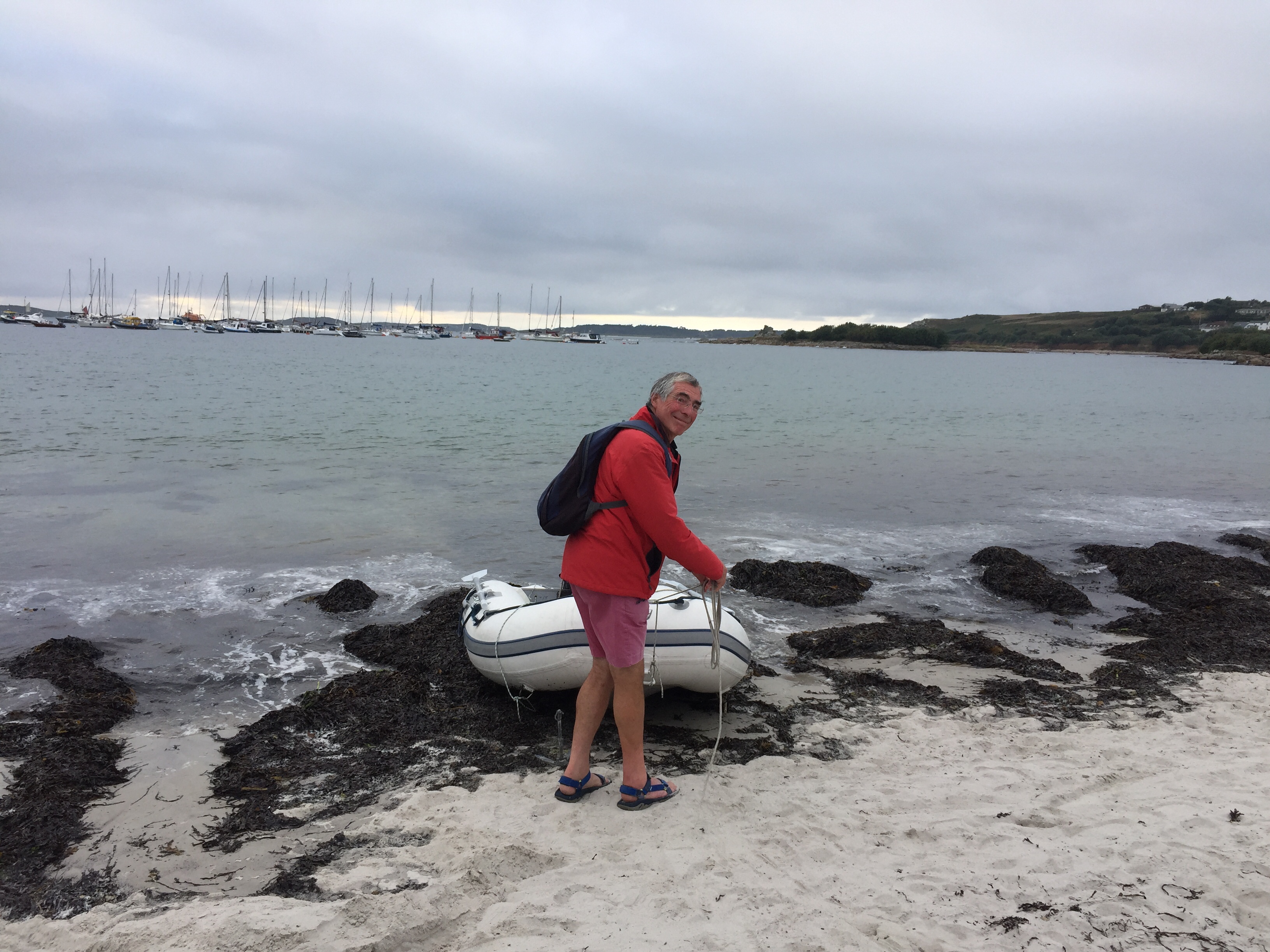 Today was our “ exploring St Marys day”. Unfortunately we couldn’t get a Scilly cart ( electric golf buggy with number plate) as they were all booked up. … So we had to settle for the community bus and walking. Beforehand, we topped up with more water, and managed to buy a telegraph from Mumfords. Also a few more things from the wonderful coop! We put them all back in the dinghy and set out for the bus which was going at 1230. We could have gone all round the island on it but that appeared to only take 17 minutes, so we opted to get out at the furthest point, and walk back. The driver was a good sort who had a sign above him saying “ your drivers name is Steve, but his friends call him The porpoise….. and none knows why “. 🤔 we got off and walked to Watermill cove on the SE side of the island. The roads were tarmac for a change and extremely quiet. Hedgerows and small fields adjoining them. Birds and butterflies in abundance. We made our way off the metalled road, down a track to Watermill. It’s a cove which we haven’t managed to get to in the boat but is s favourite anchorage. We sat on a rock on the beach and ate our picnic. It was calm. The wind was in the west. Trekking back up to the coast path, we got fantastic views down into the bay and across to the East. There was a round the island yacht race today, and we could see the sails in the distance. We walked along the grassy bracken lined paths, along stone walls and past weathered wooden farm gates. We trudged across a sandy beach below a campsite…. but even this didn’t make it busy. Up from the beach on a sandy track we found a lovely cafe where we had a pot of tea for two! We watched the sparrows devouring every morsel left on plates abandoned on tables. One would never have thought they would like stuff like coleslaw but it seems they’re not fussy and obviously seem to have adapted well and be flourishing on leftovers! We eventually got back to Hugh town, making our way through Old Town, and then climbing the steep hill on the other side to garrison…. the site of the 16 th century medieval castle that has been tuned into the Starcastle hotel. The bar is set in the dungeon which is amazing but still smelt musty… so we took our drinks outside to the ramparts. The castle is built of granite, so is incredibly well preserved for its age. Eventually we got back to the boat and had a quick change before getting in the dinghy once more and going over to Portmellon beach to a restaurant called “The Beach “ . We had fantastic food and a memorable evening. It was fun to go out to dinner on the dinghy!