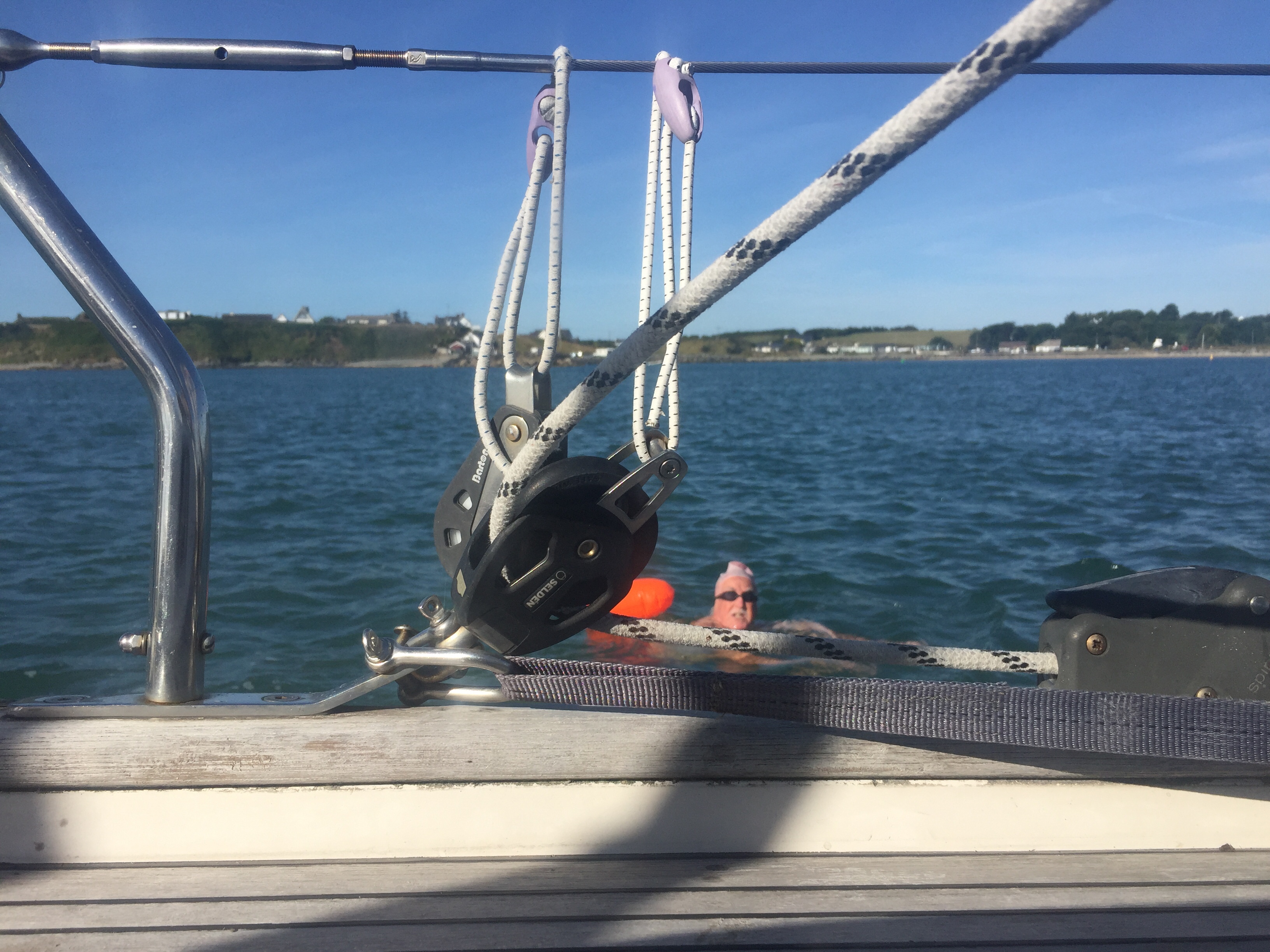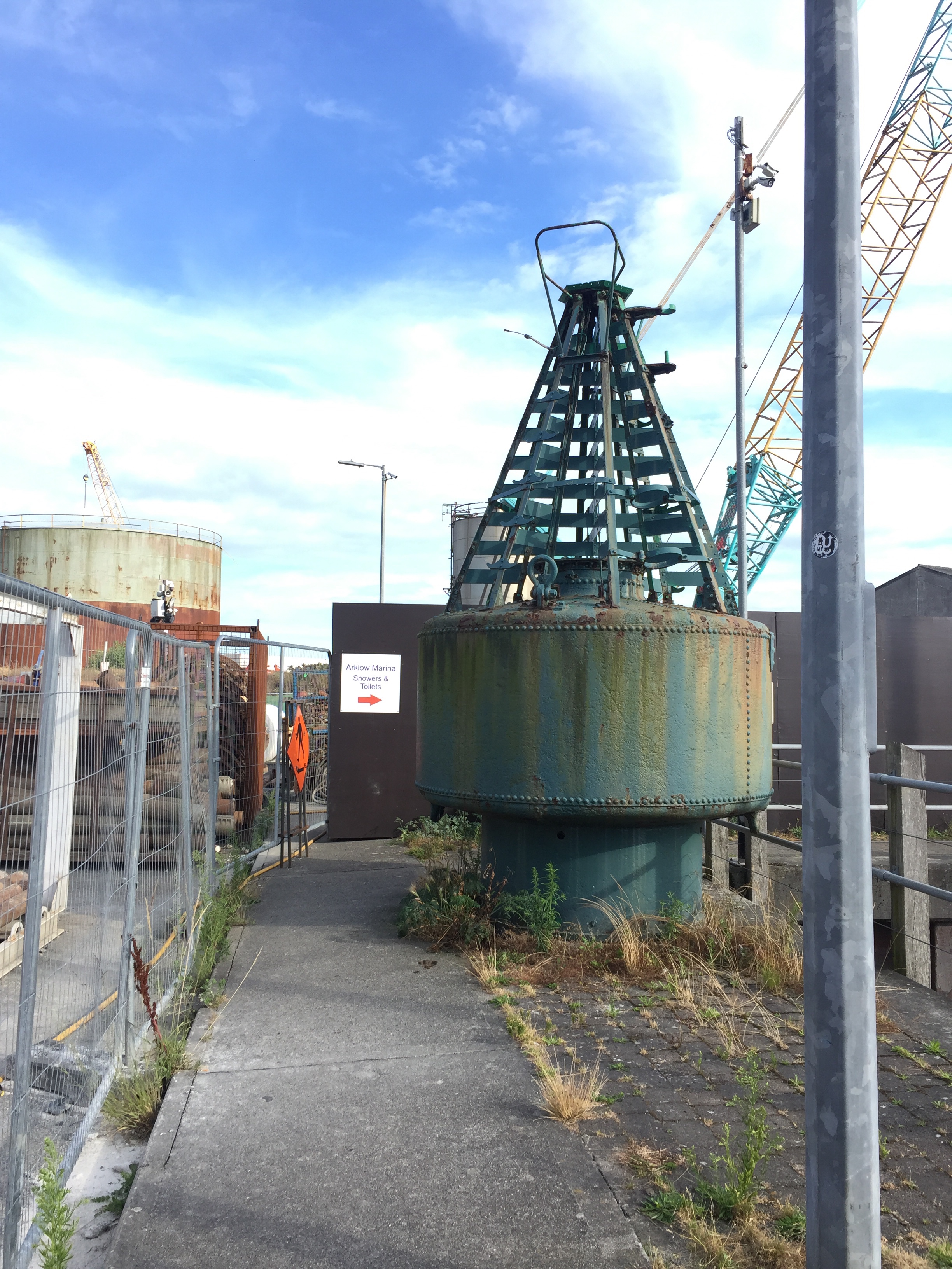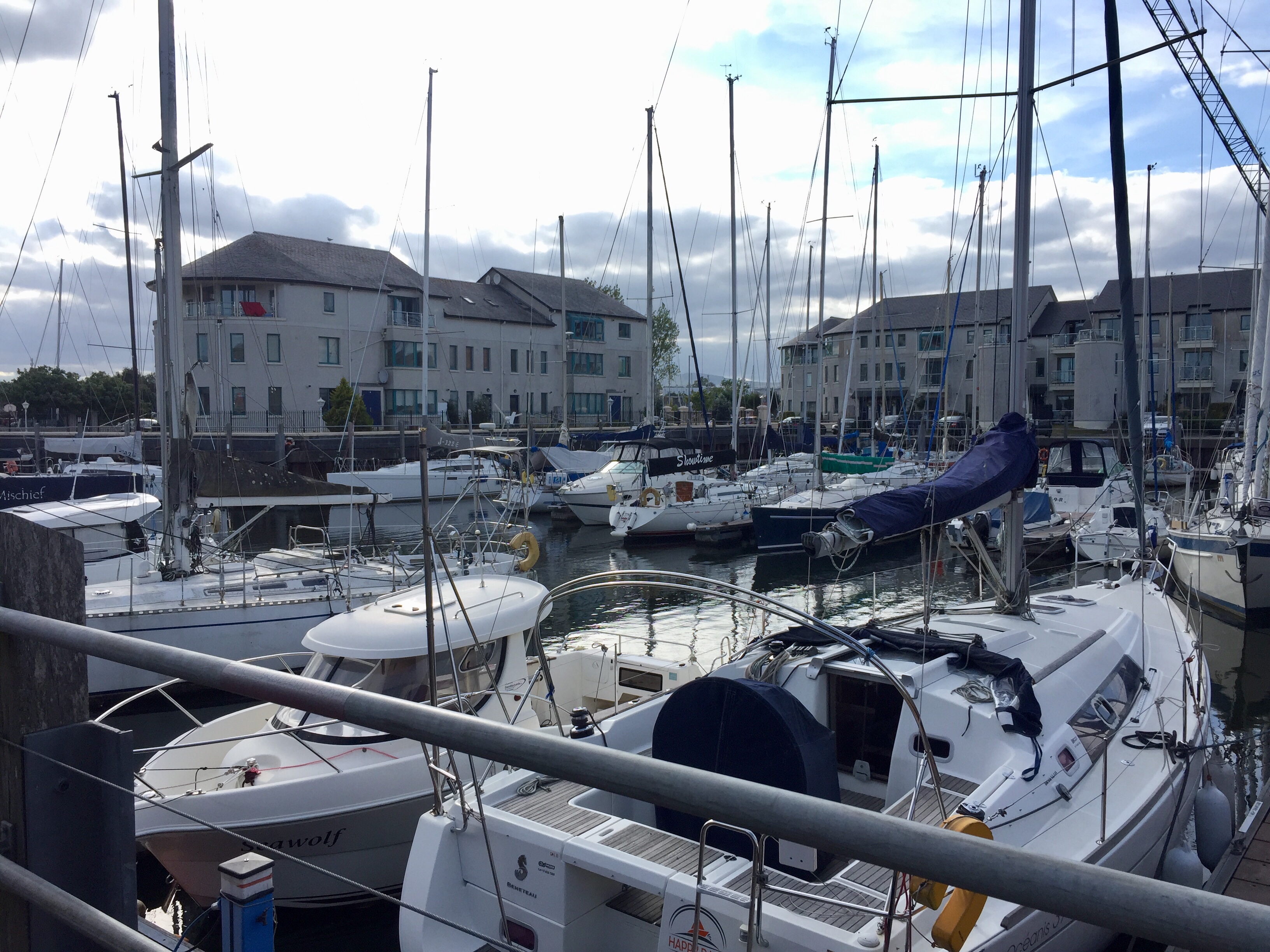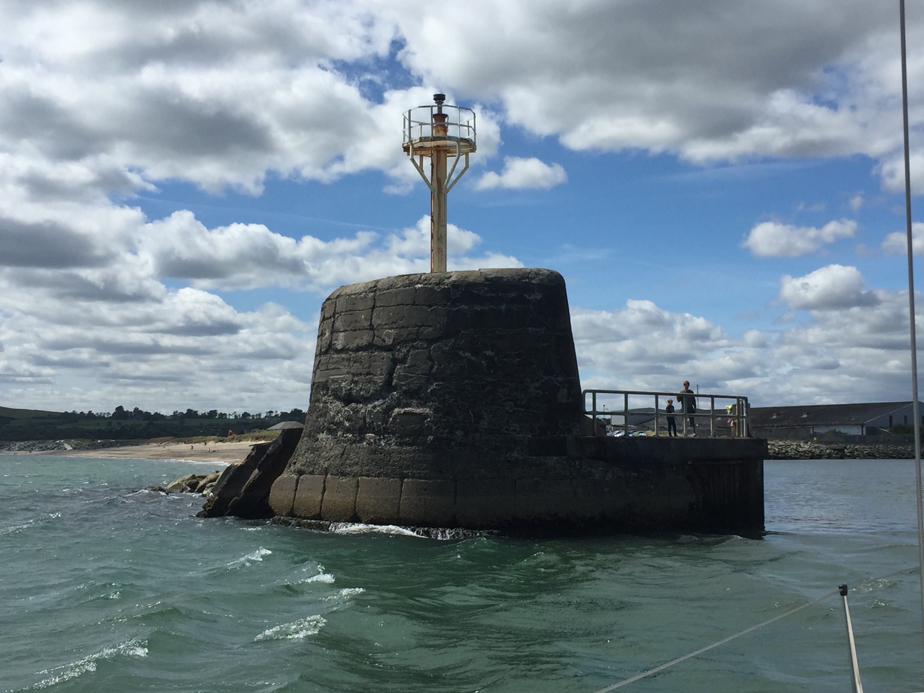 The night was rocky roly. Having said that, it wasn’t awful and did improve overnight. In fact when we woke in the early morning the sea looked really flat despite the swell. The wind had changed into the west so unlike last night it was blowing in an offshore direction. The sun was shining out of a cloudless sky. Enjoying a lazy morning cuppa, I heard a conversation going on which wasn’t with anyone on the boat! Out of the cabin window, there was a swimmer who had swim out to see us! And was literally passing the time of day whilst treading water in the middle of the sea! Afterwards I felt very guilty that we hadn’t invited him on board for breakfast! Once we had breakfasted, we upped the anchor and continued our progress north. The wind was fickle and kept coming and going. In and out went the headsail. On and off went the engine. One of those sailing days which are frustrating, but it was sunny and the coastline was really pretty. A patchwork of fields and woods, descending to beaches and shoreline. Eventually we arrived at The entrance to Arklow. It is a river with a pontoon on the northern bank, for visitors. Boats of our draught have to moor up the seaward side of the first gangway. I had phoned ahead and the HM said there was room on the pontoon…. which there was! We moored up ahead of a Halberg Rassey, where there was plenty of room. We’d reckoned getting in in the middle of the day would be a good time and that proved correct. The friendly HM came round, took our dues and explained where everything was. The biggest boon was the Aldi, literally 300m away, and the laundry machines at no extra cost. We all went to do An Aldi shop and then I left them ( Julian and Stan) to find a Guinness.. which they failed to do! We ate on board … thanks for the delicious pasta Stan!