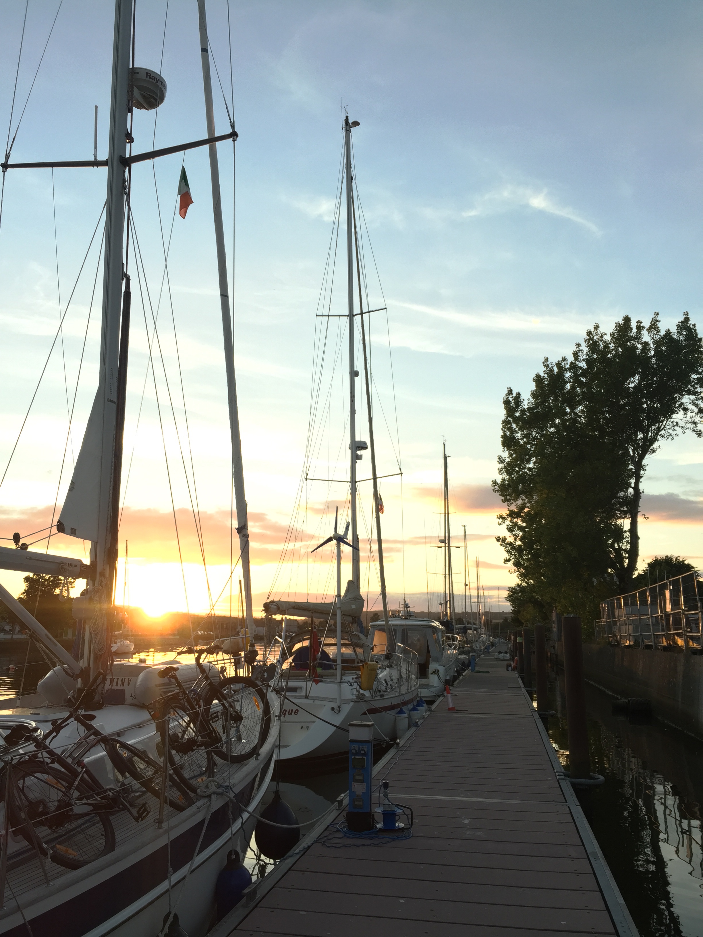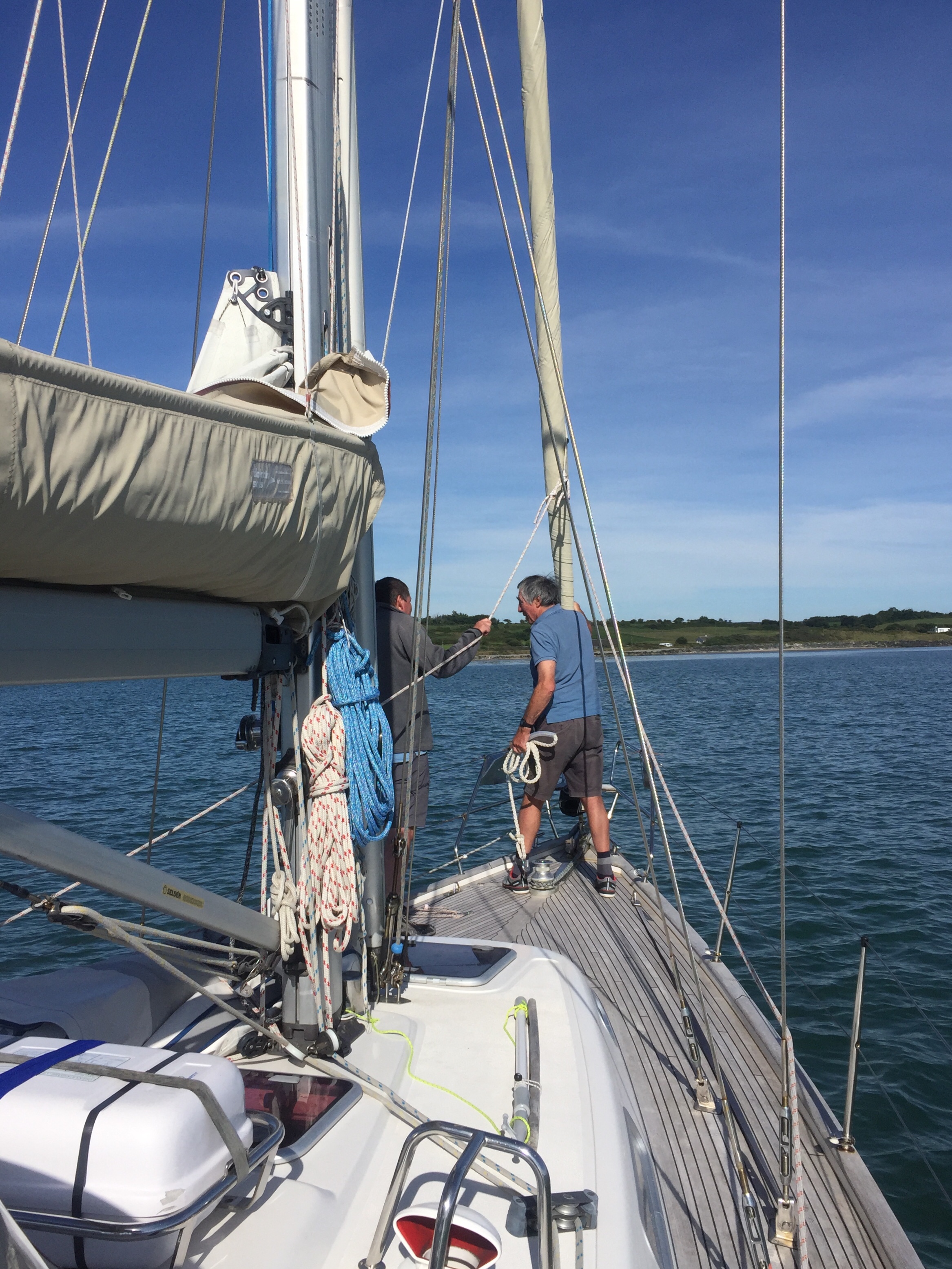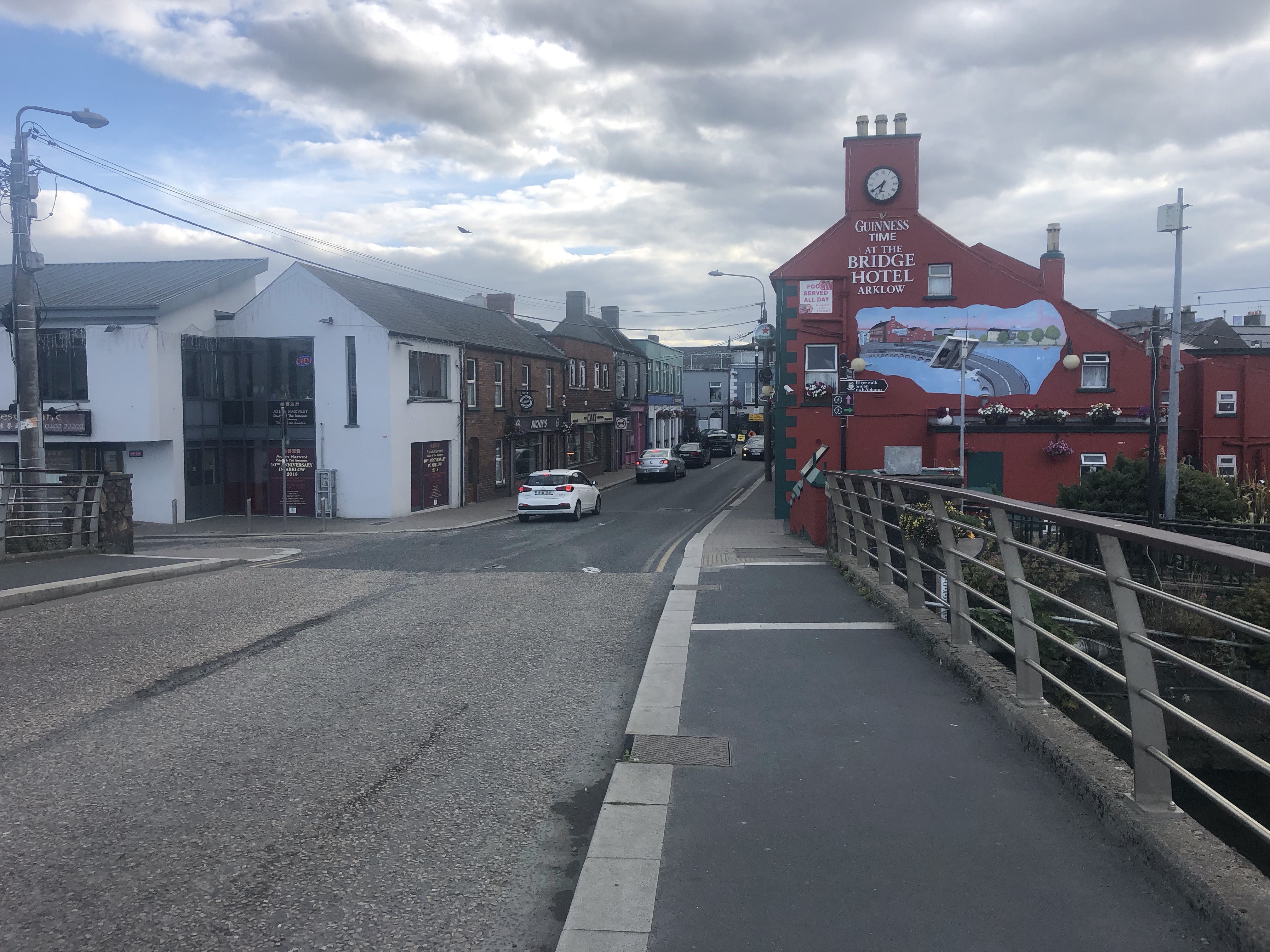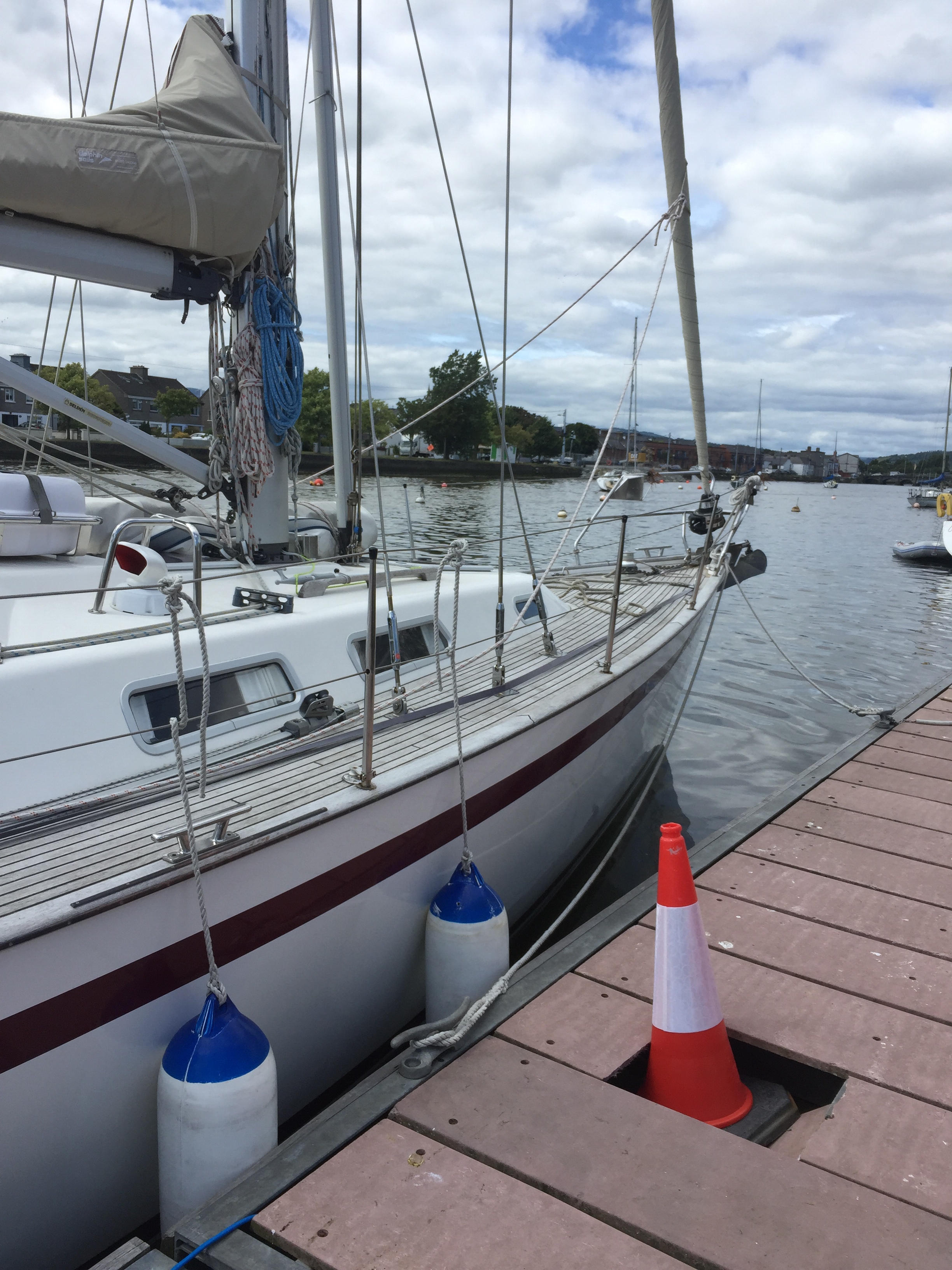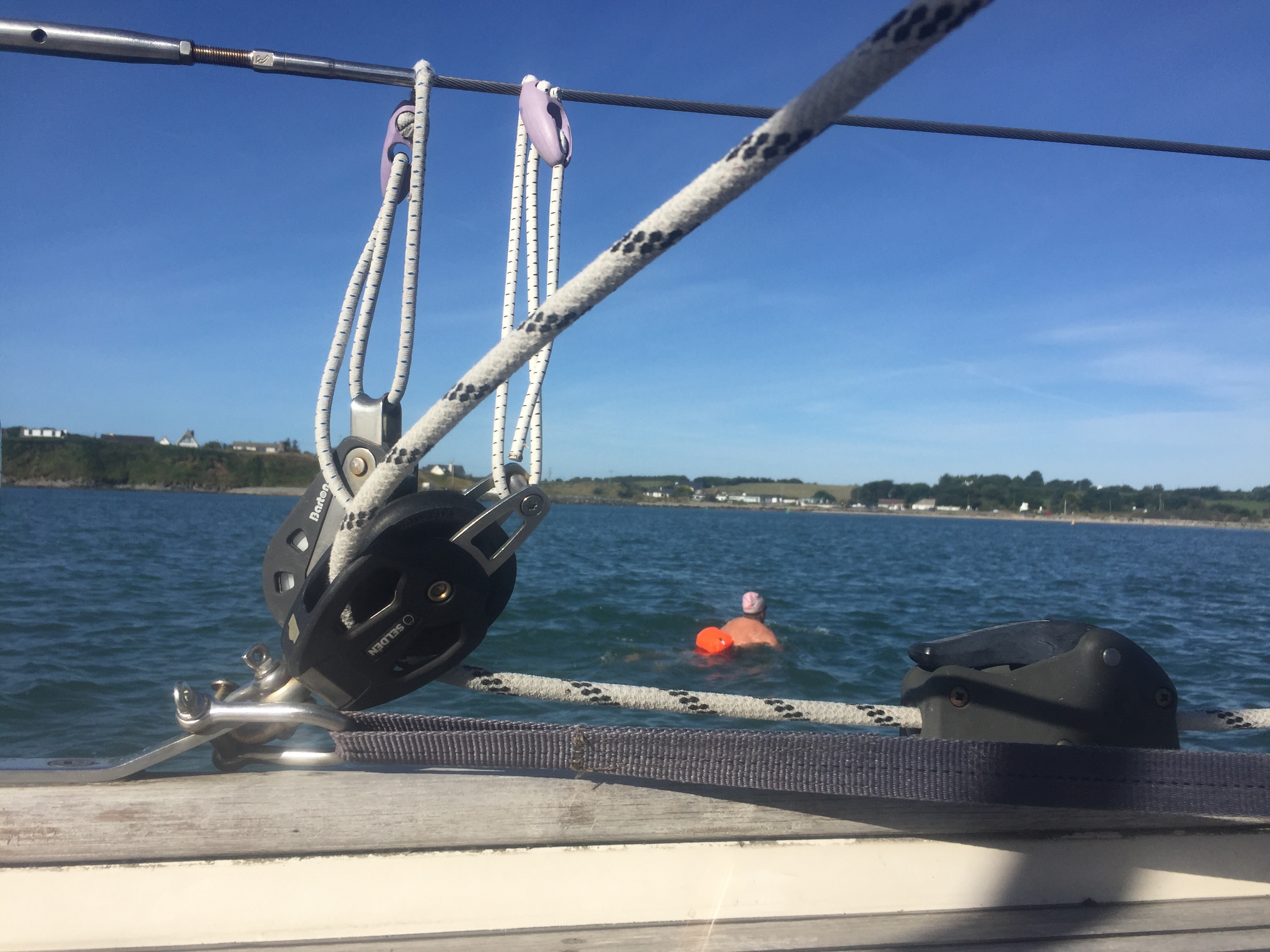 The night was rocky roly. Having said that, it wasn’t awful and did improve overnight. In fact when we woke in the early morning the sea looked really flat despite the swell. The wind had changed into the west so unlike last night it was blowing in an offshore direction. The sun was shining out of a cloudless sky. Enjoying a lazy morning cuppa, I heard a conversation going on which wasn’t with anyone on the boat! Out of the cabin window, there was a swimmer who had swim out to see us! And was literally passing the time of day whilst treading water in the middle of the sea! Afterwards I felt very guilty that we hadn’t invited him on board for breakfast! Once we had breakfasted, we upped the anchor and continued our progress north. The wind was fickle and kept coming and going. In and out went the headsail. On and off went the engine. One of those sailing days which are frustrating, but it was sunny and the coastline was really pretty. A patchwork of fields and woods, descending to beaches and shoreline. Eventually we arrived at The entrance to Arklow. It is a river with a pontoon on the northern bank, for visitors. Boats of our draught have to moor up the seaward side of the first gangway. I had phoned ahead and the HM said there was room on the pontoon…. which there was! We moored up ahead of a Halberg Rassey, where there was plenty of room. We’d reckoned getting in in the middle of the day would be a good time and that proved correct. The friendly HM came round, took our dues and explained where everything was. The biggest boon was the Aldi, literally 300m away, and the laundry machines at no extra cost. We all went to do An Aldi shop and then I left them ( Julian and Stan) to find a Guinness.. which they failed to do! We ate on board … thanks for the delicious pasta Stan!