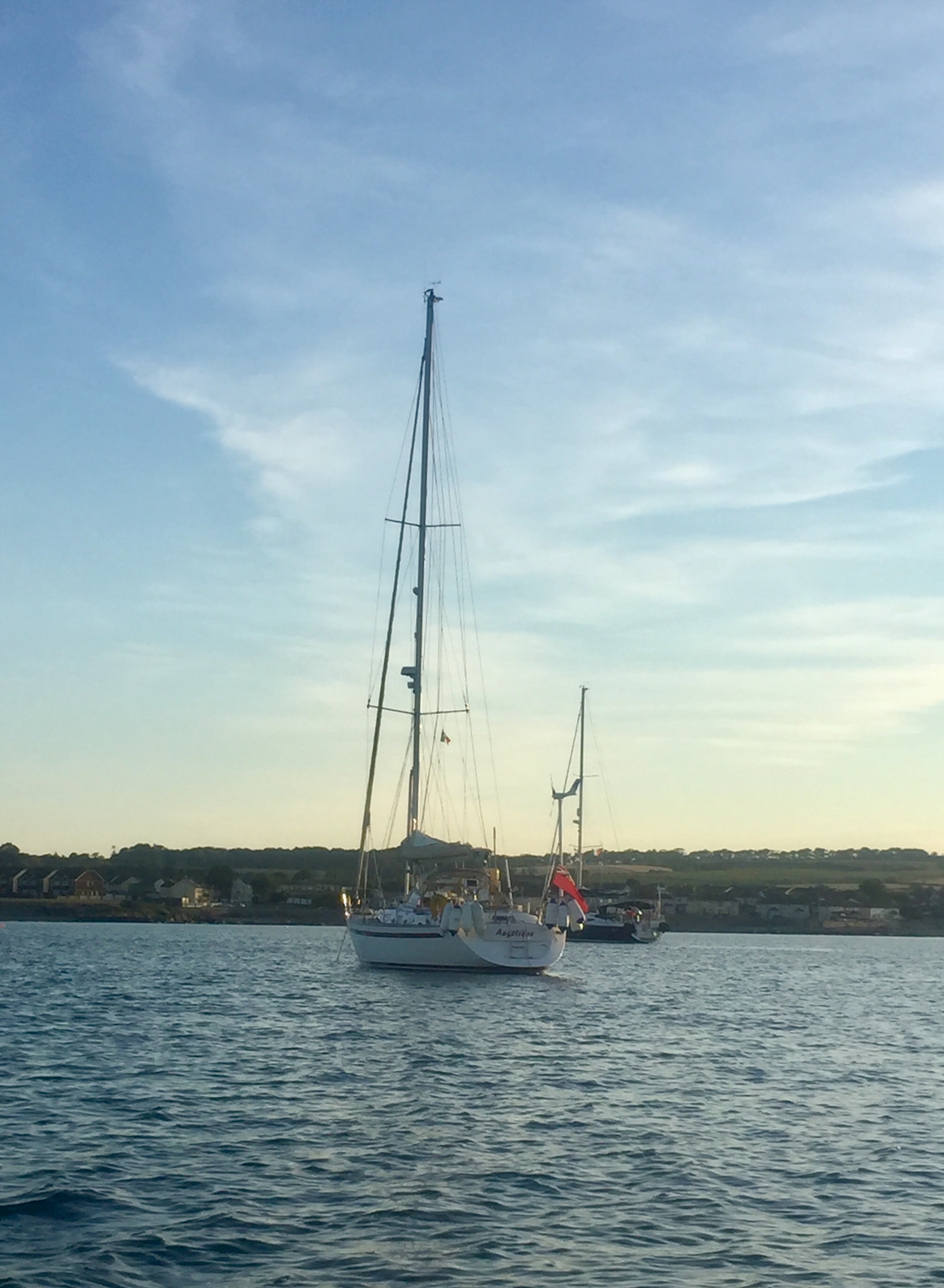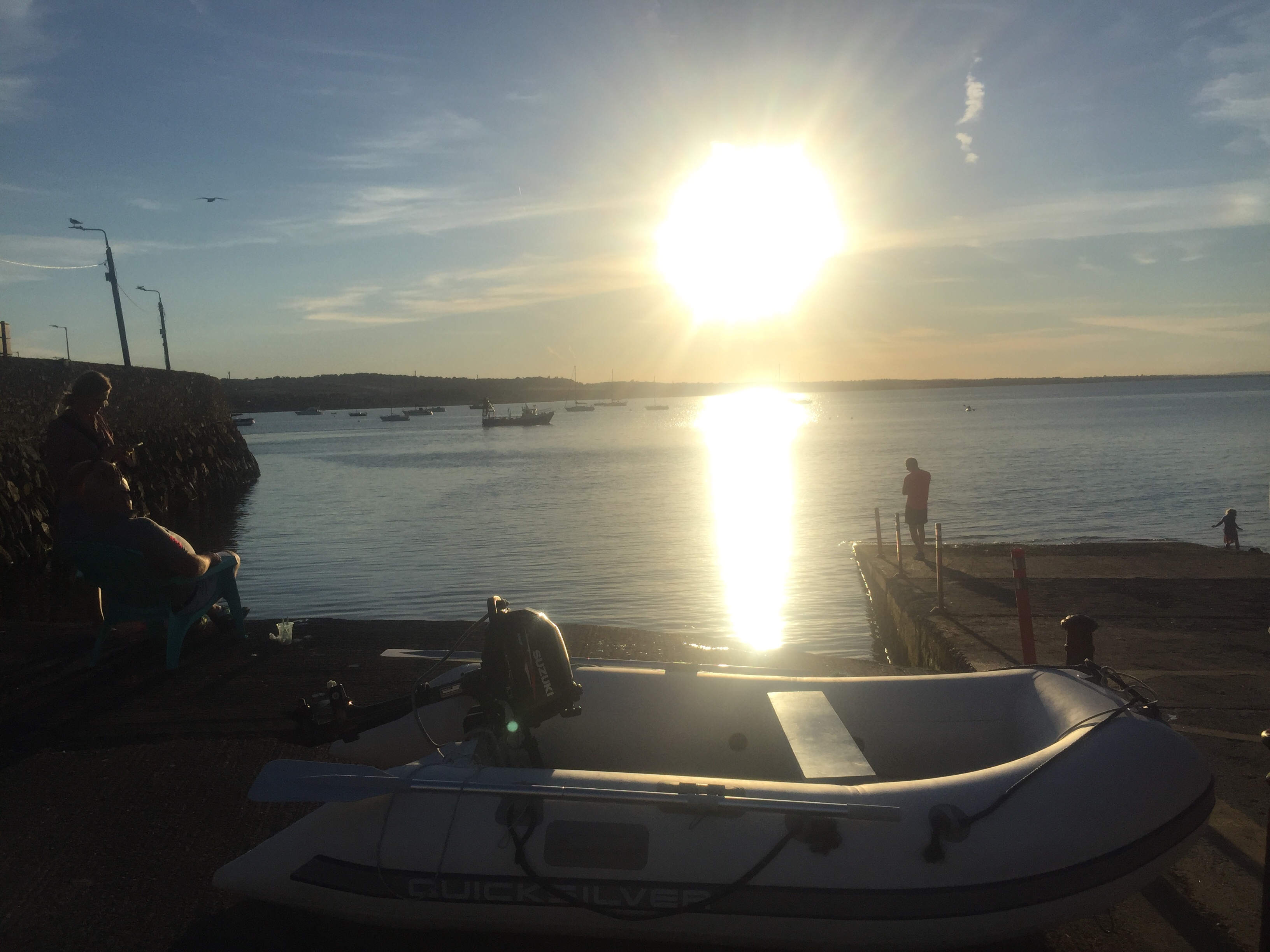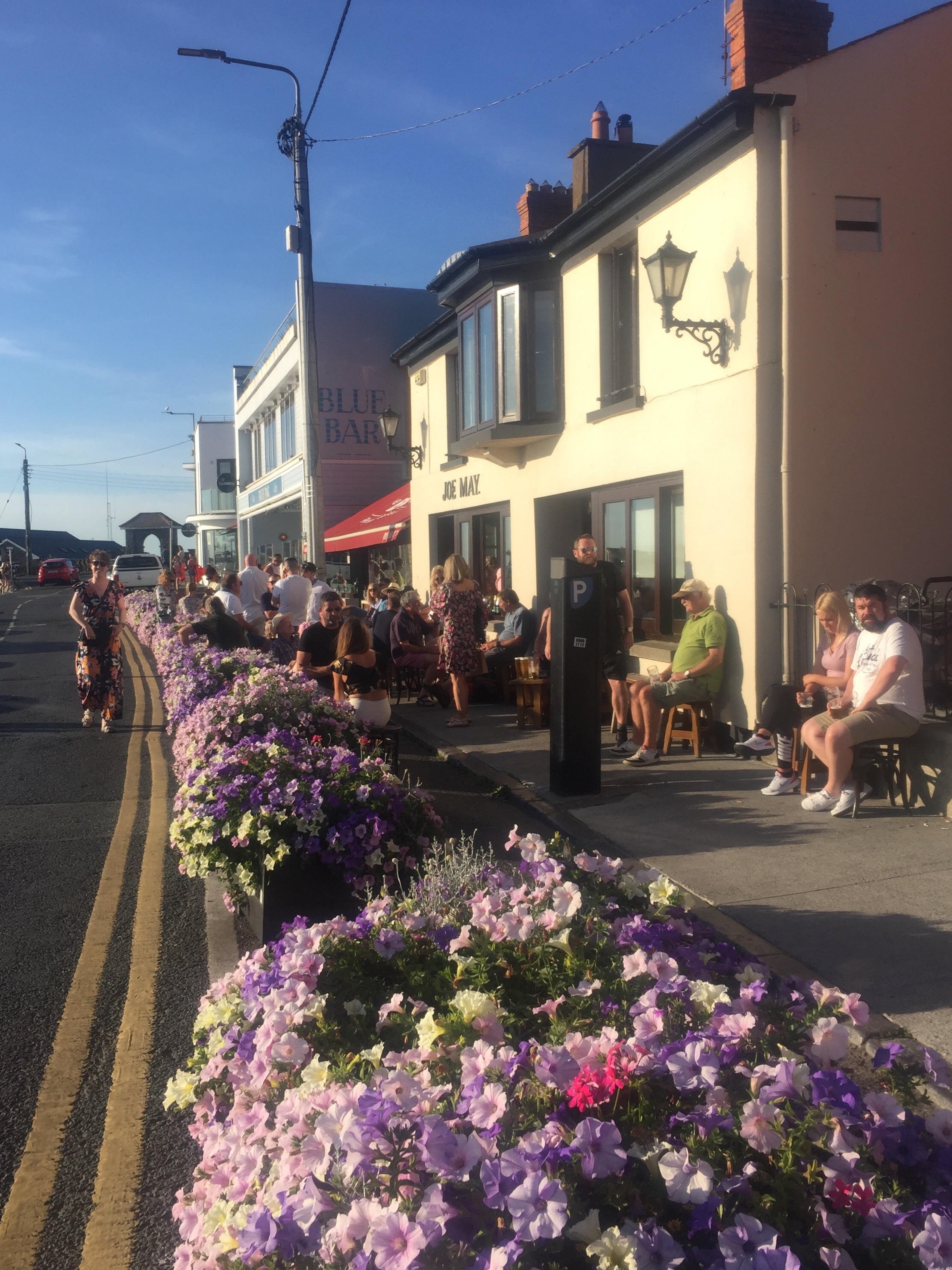 Julian’s first task today was to try and sort out the Log. This is the device which sits in the bottom of the boat and reads the nm per hour/ knots that we do. Basically a non metallic paddle wheel which spins round and a sensor to record the revolutions . We reckoned it had been under reading for some time. It doesn’t seem to be a problem in Scotland but in the warmer southern waters, it appears to get full of small sea crustaceans which clog it up and stop it turning properly. Unfortunately on Angelique, it’s situated under the fore peak beds, right down in a most inaccessible place. Just getting to it is a pain, let alone cleaning it by scraping the creatures off with a kitchen knife. Anyway he’d done it twice already and it’s still not right. However , after a third go at cleaning all the gunk round the sensor whilst upside down under a bunk with a head torch on, and then recalibrating the log instrument. It seems to be reading correctly. Yay! We filled up with water and noticed two little ringed plovers on the pontoons! Seemed a bit of a random place for them to be🤔 ?? Set off 1030 ish into another sunny hot day. There’s a yellow weather warning for high heat days over the country for the next few days. A bit of southwesterly wind though, and we managed to carry the cruising chute for a good few hours as we drifted pleasantly up the Irish coast. There was a ferry and a Couple of cargo ships going into Dublin, but otherwise very quiet on the shipping front. We passed Howth and then Lamby Island …. couldn’t help thinking of all the awful nautical disasters in these waters, that had been in the museum yesterday. Today it is so peaceful. It was very hot. It was cool and pleasant lying on the foredeck in the shade of the big red, white and blue spinnaker. Our destination was an anchorage in a bay off a village called Skerries. We pumped up the dinghy on the way, in readiness for going ashore. The pilot said it was “excellent “ holding in mud…. which turned out to be very true. It was about 6 o’clock by the time we landed in the dinghy and pulled it up the slipway to the left of the fishing pier. The beach was alive with folk having a good time but not busy. A friendly grandad told us that Jomays was a good place for a stop…. and so it was! We spent the next hour and a half enjoying the sunshine, the beer and the general air of happiness and friendliness that is so prevalent here in Ireland. Everyone seemed to be having a good time. The abundance of beautiful petunias in the boxes along the pavement were giving off a lovely perfume and it was altogether a really memorable evening. As the sun was beginning to set we returned to the boat and made supper. A special day. 🌅