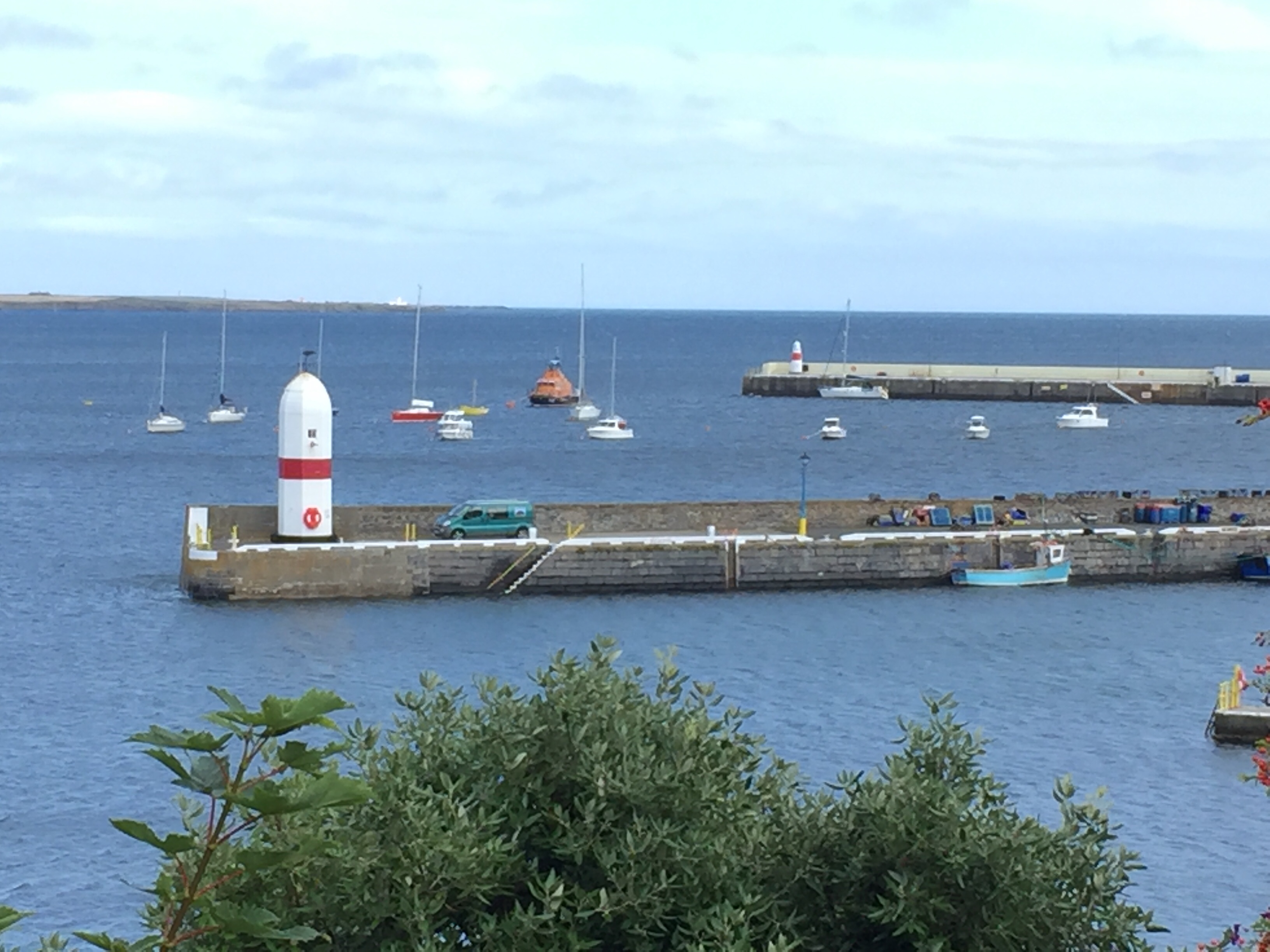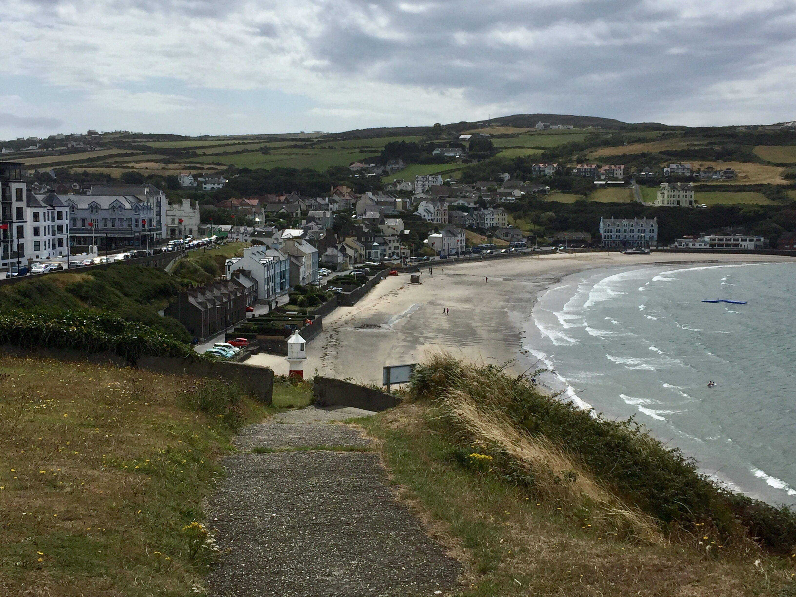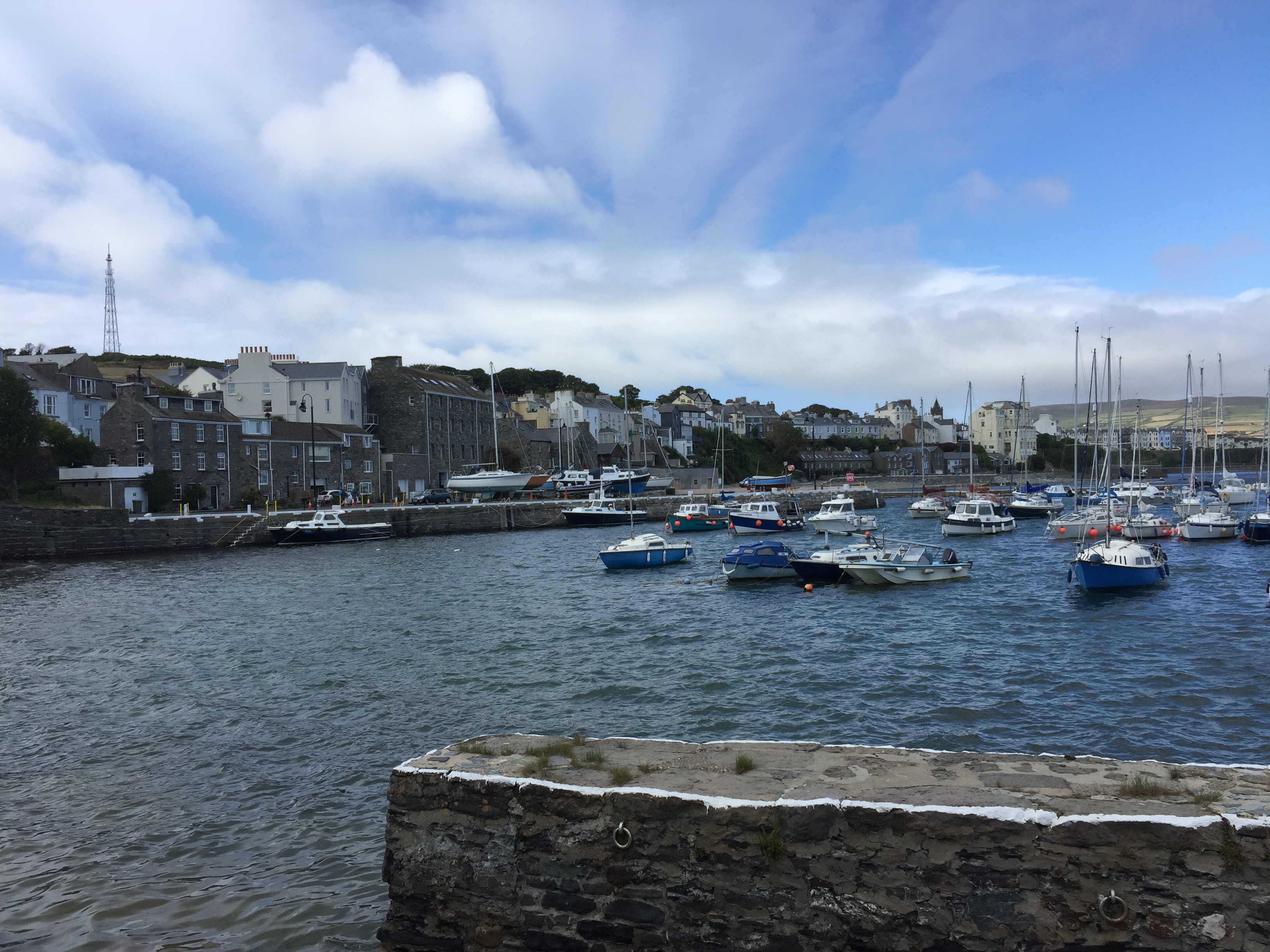 I thought I was back in Scilly, when the wind started in the middle of the night and the boat started rocking. Even attached to the pontoon it was quite significant. It was a north wind which obviously funnels into the marina in this direction. Thunder and lightning accompanied the wind, with heavy rain to follow. I thought about the last time we had thunder and lightning……. thank goodness we’re attached to a nice solid pontoon! Cosy when you know you’re secure ! The whole day was windy and as we looked out to sea, the white horses were big! It was blowing up to 25 knots in the marina so you can add another 10 for out at sea. Glad we’re tourists today! We used our GO cards to get the bus to Douglas, then walked to the Steam train station, a few minutes away. We had a cup of coffee whilst waiting and then it was all aboard the narrow gauge railway with No. 4 engine. Riding on steam trains always brings out the child and somehow you can’t help being excited by the smell of the steam, the chug chug rhythm, and the whistle blowing. We chugged our way to Port Erin further down the west coast. The wind and the waves had cleared out everyone from the beach, but it’s a great stretch of sand with a pub right on the beach and a backdrop of grand Victorian buildings. It’s a anchorage in the right wind direction but today you’d have to be tucked up in the northeast corner. We walked out to the west first, checking out the golf course and eating sandwiches sat on a rather windy bench with a great view. After that we walked to Port St Mary, on the east coast. Only a few miles apart at this point. We saw the visitors moorings out in the bay that we had picked up a couple of years ago, 2020, when no one was allowed to visit the IOM due to Covid. Eventually we found a bus stop up in the town with the appropriate number on it. J is getting very good with the bus timetables, and so far it’s been extremely efficient and hasn’t been more than a few minutes behind schedule. An interesting thing is day by day we are noticing more and more things appearing on the roadsides, as the island gets ready for the motorbike Grand Prix this weekend. More and more huge padded cushions are being attached to walls and signposts. Small grandstands made of scaffolding are appearing and portaloos are being deposited in fields Along the route.