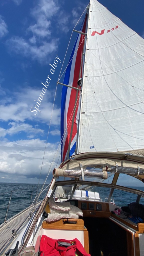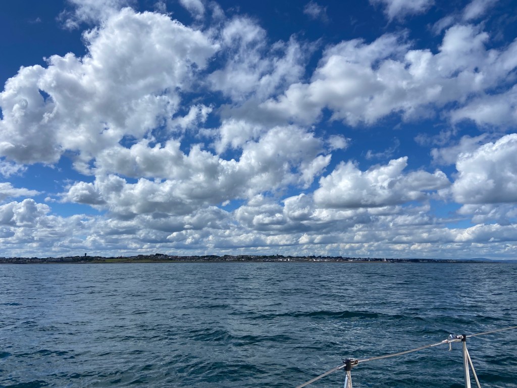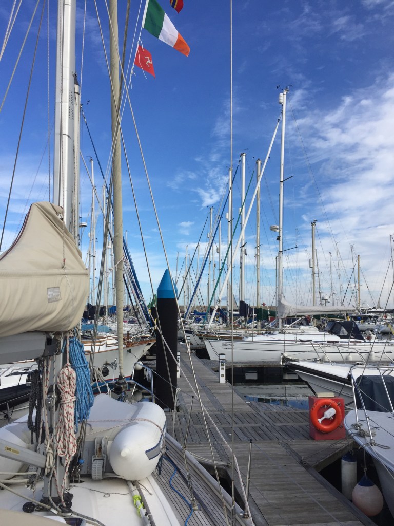 A bright morning! All our fellow sailors had left by the time we were ready to go. Presumably getting the south going tide. The sea was still a bit roly to start with. Put the main up and motored for a while. It became obvious that the only sailing we could do would be under spinnaker/ cruising Shute. 8-10 knots from the south. So we went through that palaver again……. sail out from under the fore bunk, sheets out and rigged on the starboard side. It did help for a couple of hours but eventually the wind dropped and we had to give up and put it all away again! It was really pleasant though motoring up the Northern Irish coast, past the entrance to Strangford Lough , South Rock, and eventually onto Belfast Lough. Bangor marina is a huge marina, hidden behind concrete tyres on the south side of the estuary. Brilliant marina! We had telephoned ahead to book in, but as soon as we radioed we were given friendly berthing instructions… although lucky use of the phonetic alphabet as Julian and I both heard E9 as A9 ……… but that’s Ireland for you. Our ears are just different! Berthing instructions were spot on. They had even colour coded the tops of the piles for the various pontoons. So we were E ….. which was blue… every large marina should take note! We landed gently and had a lovely evening. It was sunny and peaceful . We had a Greek salad and watched celebrity master chef. Wonderful! I actually booked a restaurant meal at Scott’s of Troon for a week today! Just can’t believe it. Loving the thought… and yet scared at it being the end of our journey……in less than a week.😳