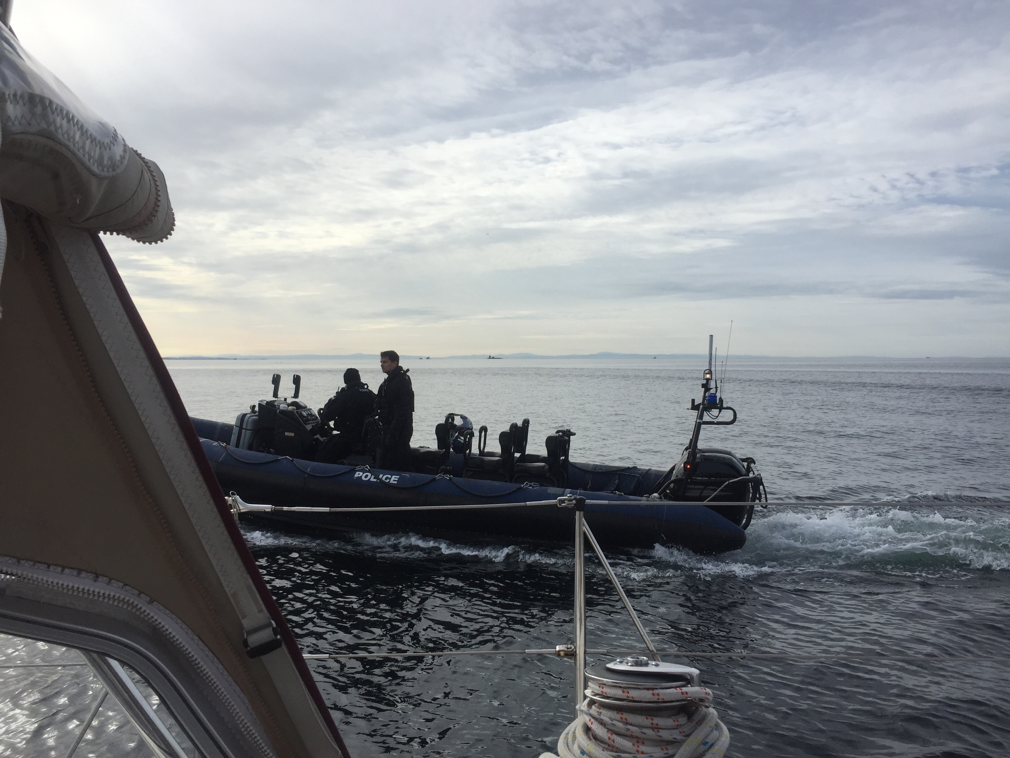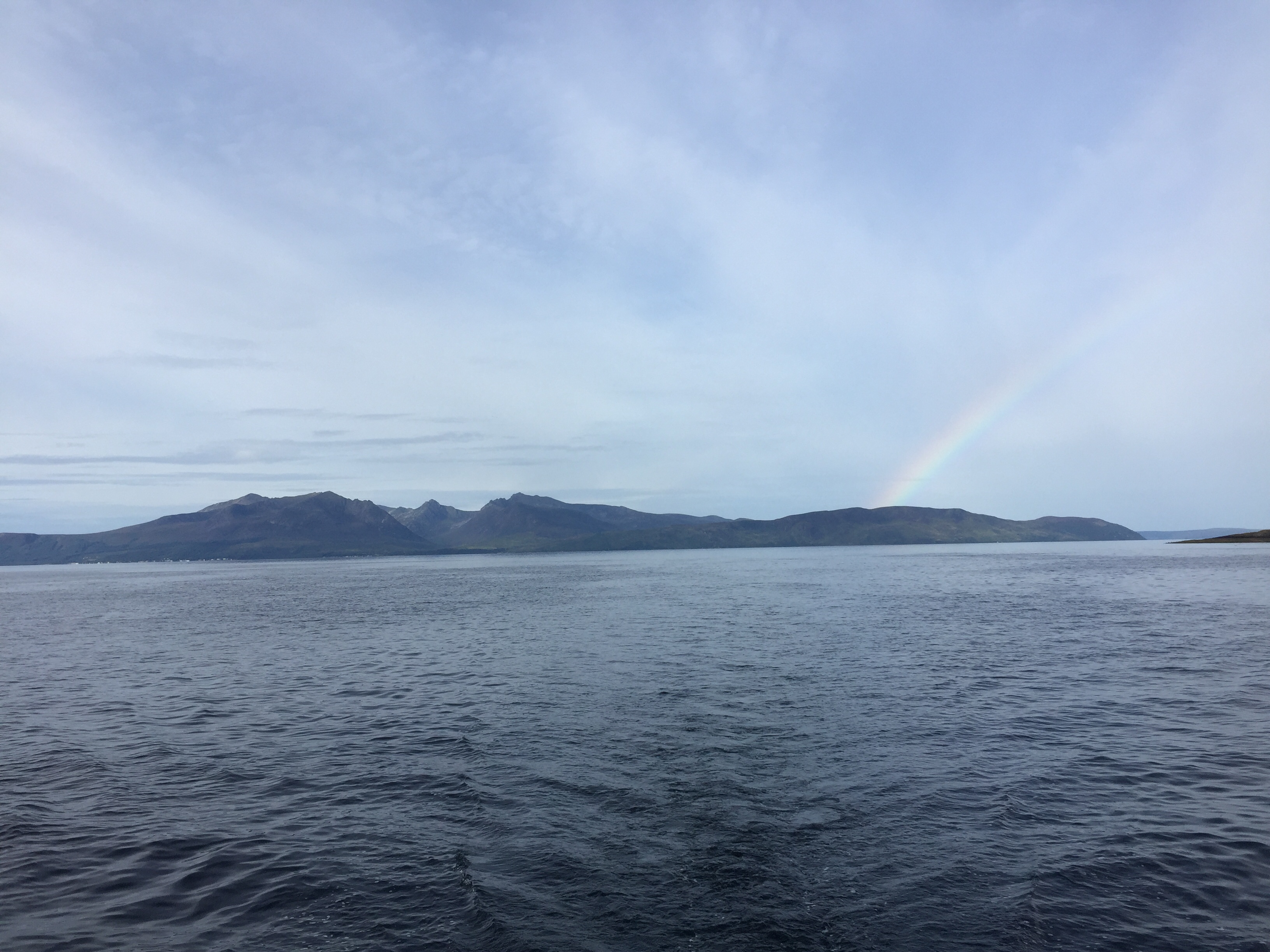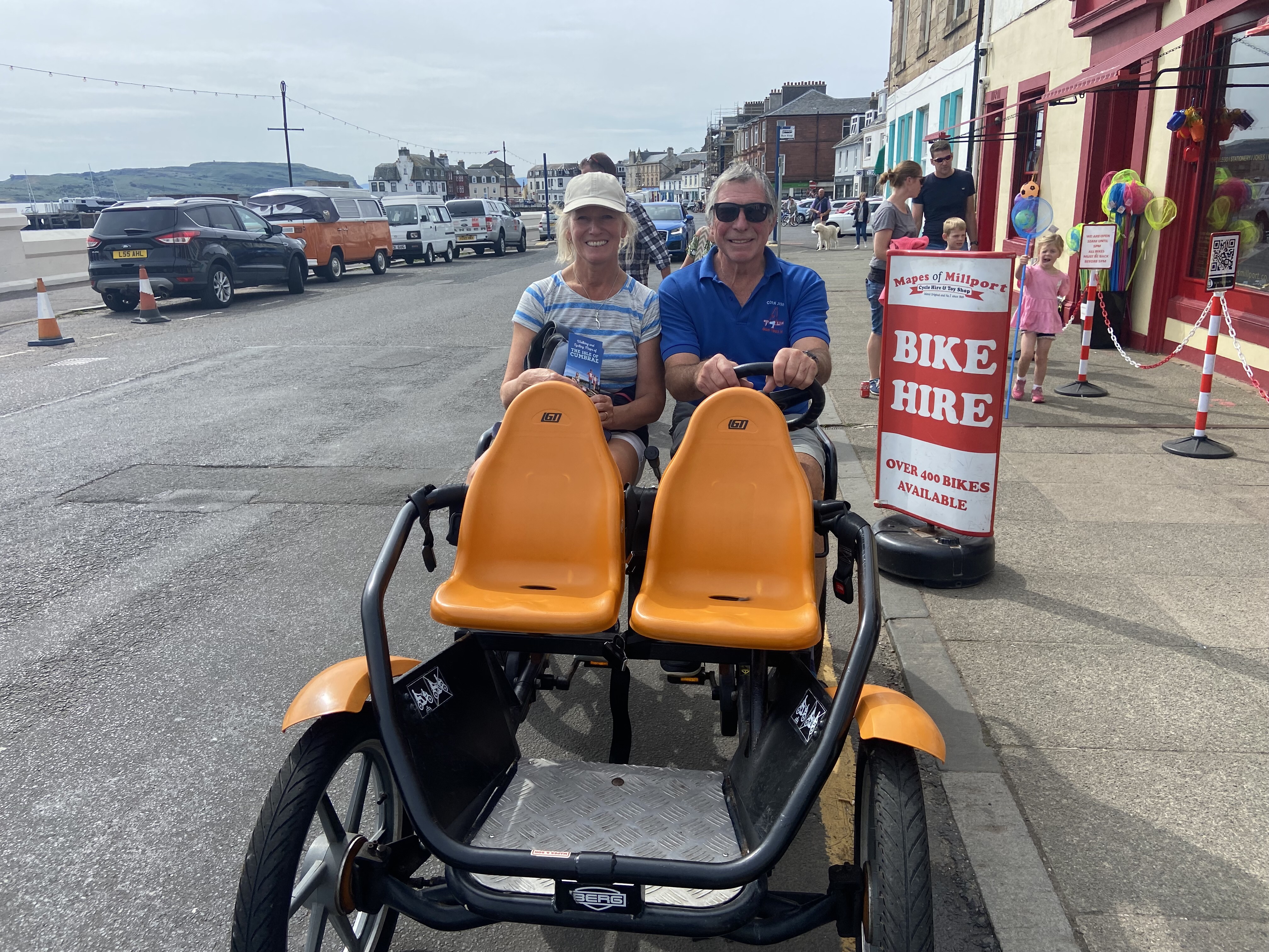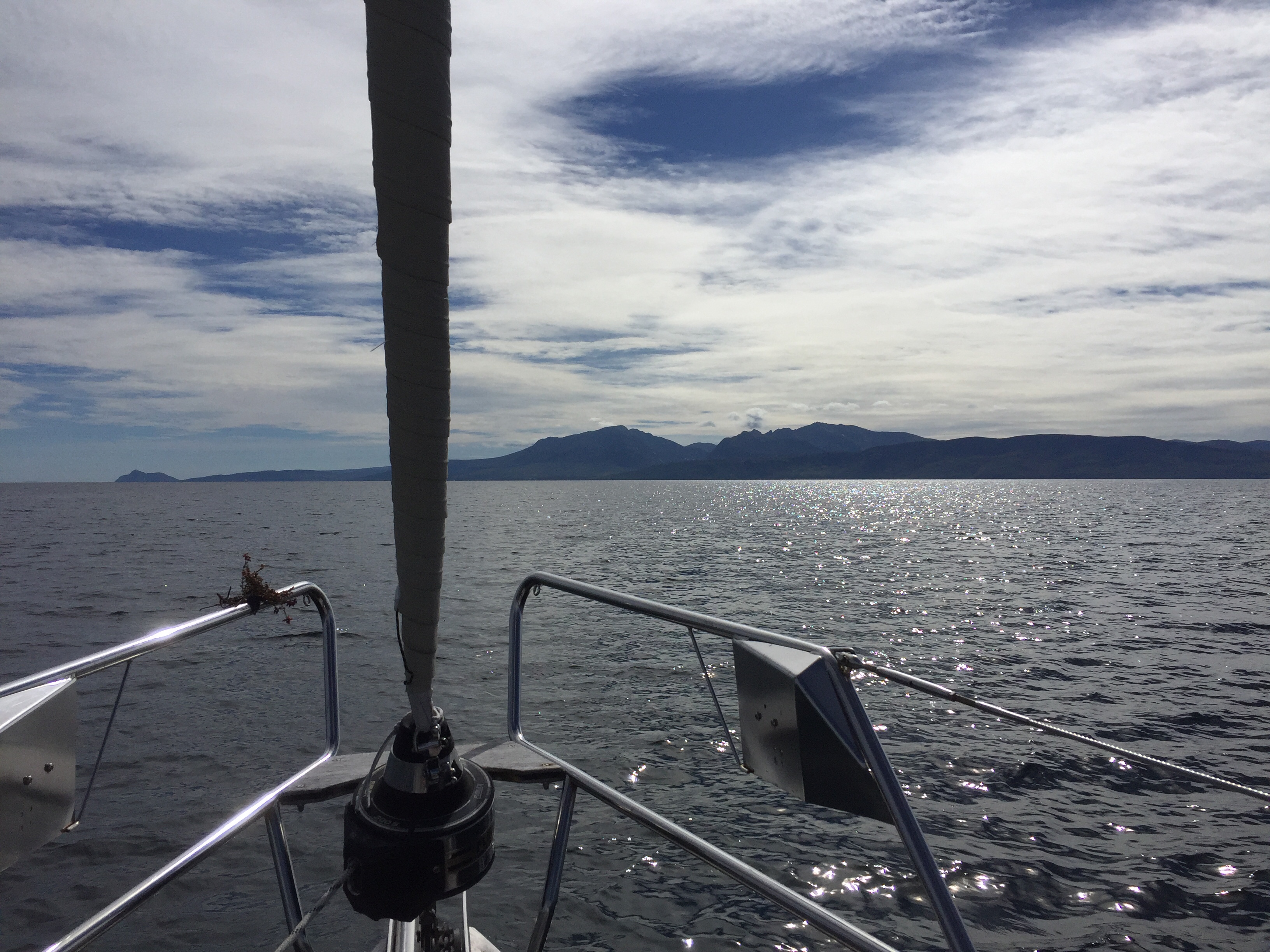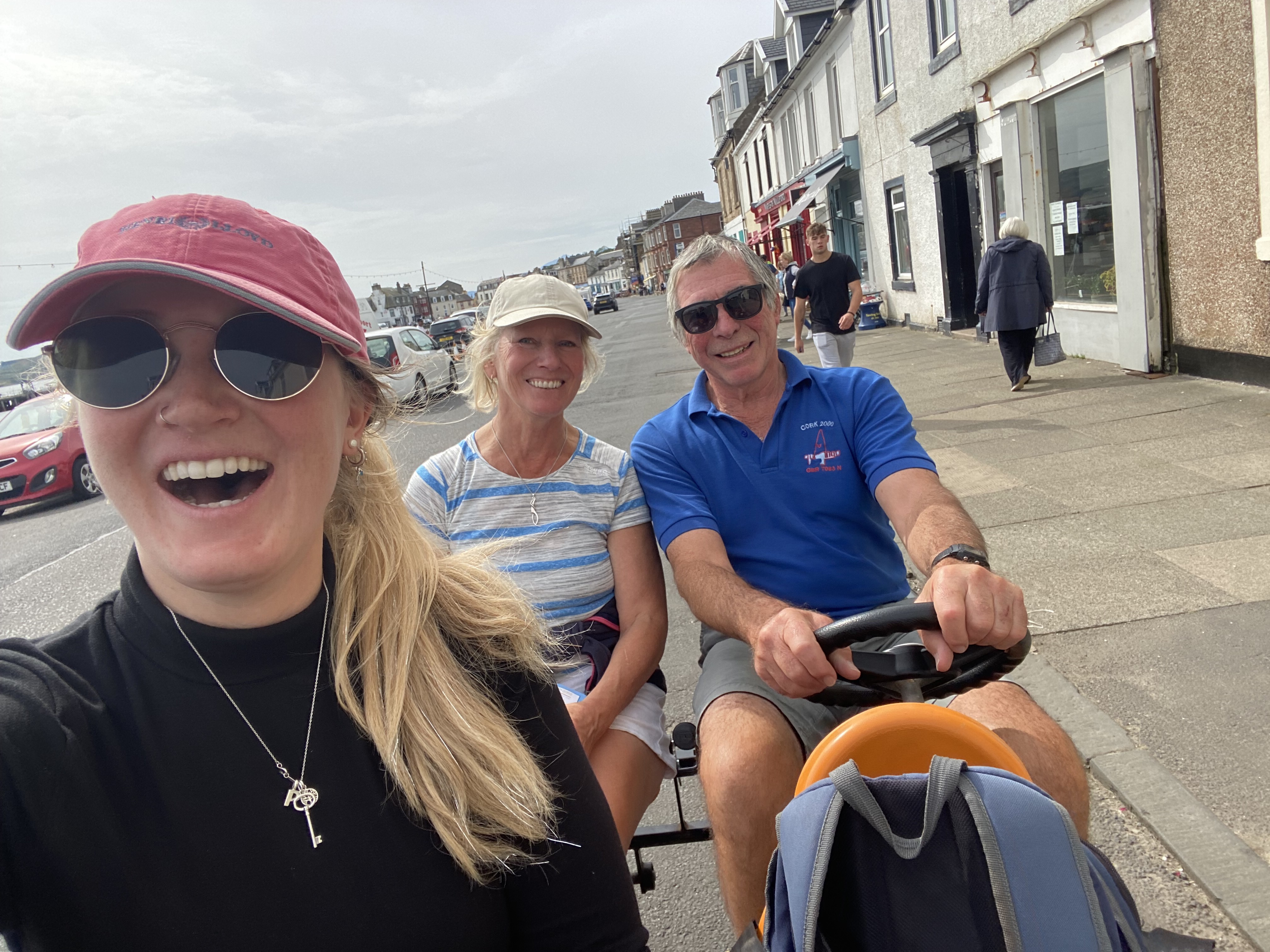 A short hop. We’re on our way back to Troon tomorrow. The end of our journey. No wind to speak of. It was lovely just to be up early. The wind had gone round to the NE in the night, as forecast. We upped the anchor and motored out. We had bacon and egg sandwiches and coffee. Goat fell on Arran was as clear as I’ve seen it. It had a little rainbow 🌈 poking up from the right hand side, though we only had a few spots of rain. we hugged the coast and enjoyed the views. As we approached the corner of the Isle of Bute, we could see what looked like a submarine in the distance. It was. It got bigger which meant it was coming up the Clyde where they dock them. Having had this happen before we knew what was coming when the black police rib approached us just off Glencallum bay on the bottom corner of Bute. They just asked if we’d mind waiting whilst the submarine passed by. We stooged around in Glencallum bay, which looks like a lovely anchorage and one where we haven’t been yet. The little lighthouse on the corner giving an obvious Starboard mark. Once the submarine had gone, we made our way to Millport and picked up a mooring in the bay. As we arrived early Julian rowed ashore to get the Sunday paper and the rest of the morning was spent relaxing. I had a plan for the afternoon which involved getting a “ grand tourer” from one of the bike hire shops here. As it’s a small island with a coast road I thought it would be a good idea! Unfortunately it was extremely hard work! And I don’t think anyone enjoyed it!☹️. Afterwards we had a ice cream and a beer at a spectacularly seedy pub! Shame as last visit we remember it as being lovely! Aw well. Returning to Angelique Julian did a few jobs and then cooked lovely vegetarian curry. The TV wouldn’t work properly so we gave up with that.Thinking about tomorrow and wondering 🤔.